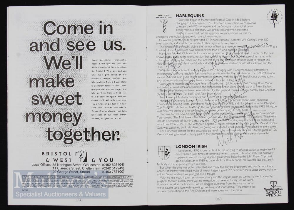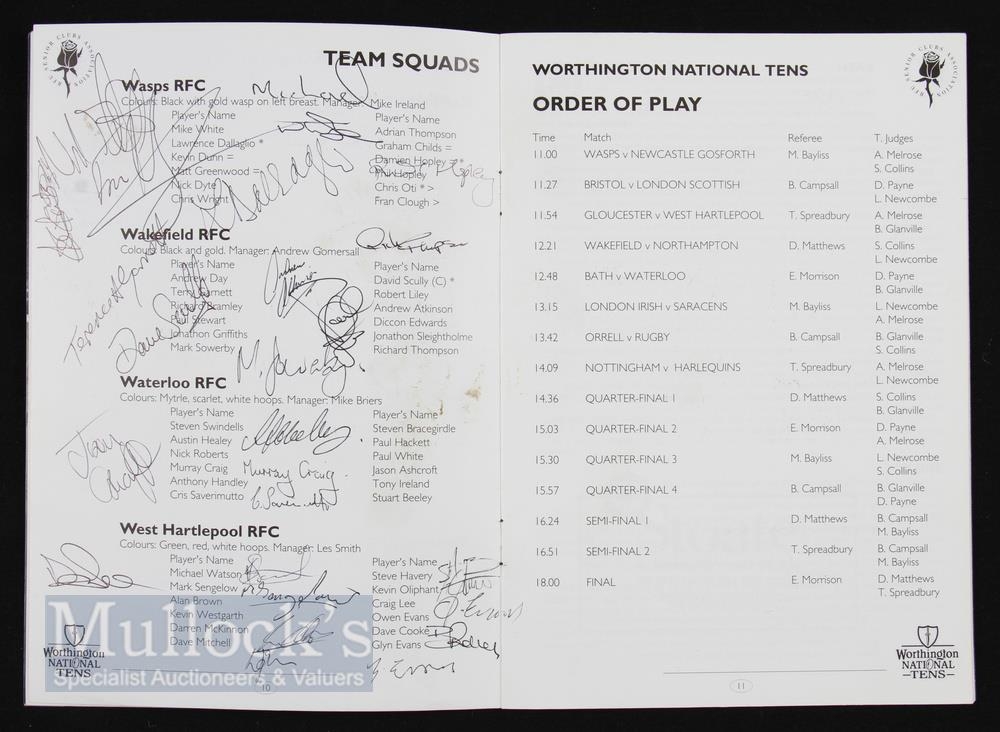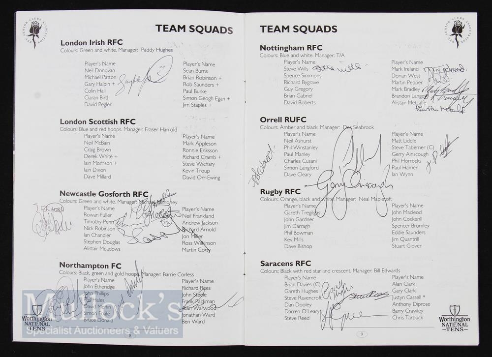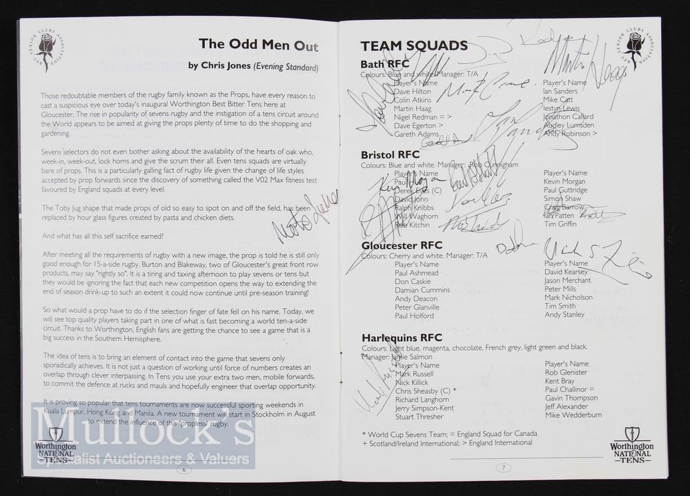 Autographs, Worthington National Rugby 10s 1990s (50): Programme signed to team penpics by the likes of Dallaglio, Catt, Haag, Redmond, Callard, Hull, K Morgan, Halpin, Corry, Scully, A Healey, T Diprose etc. VG