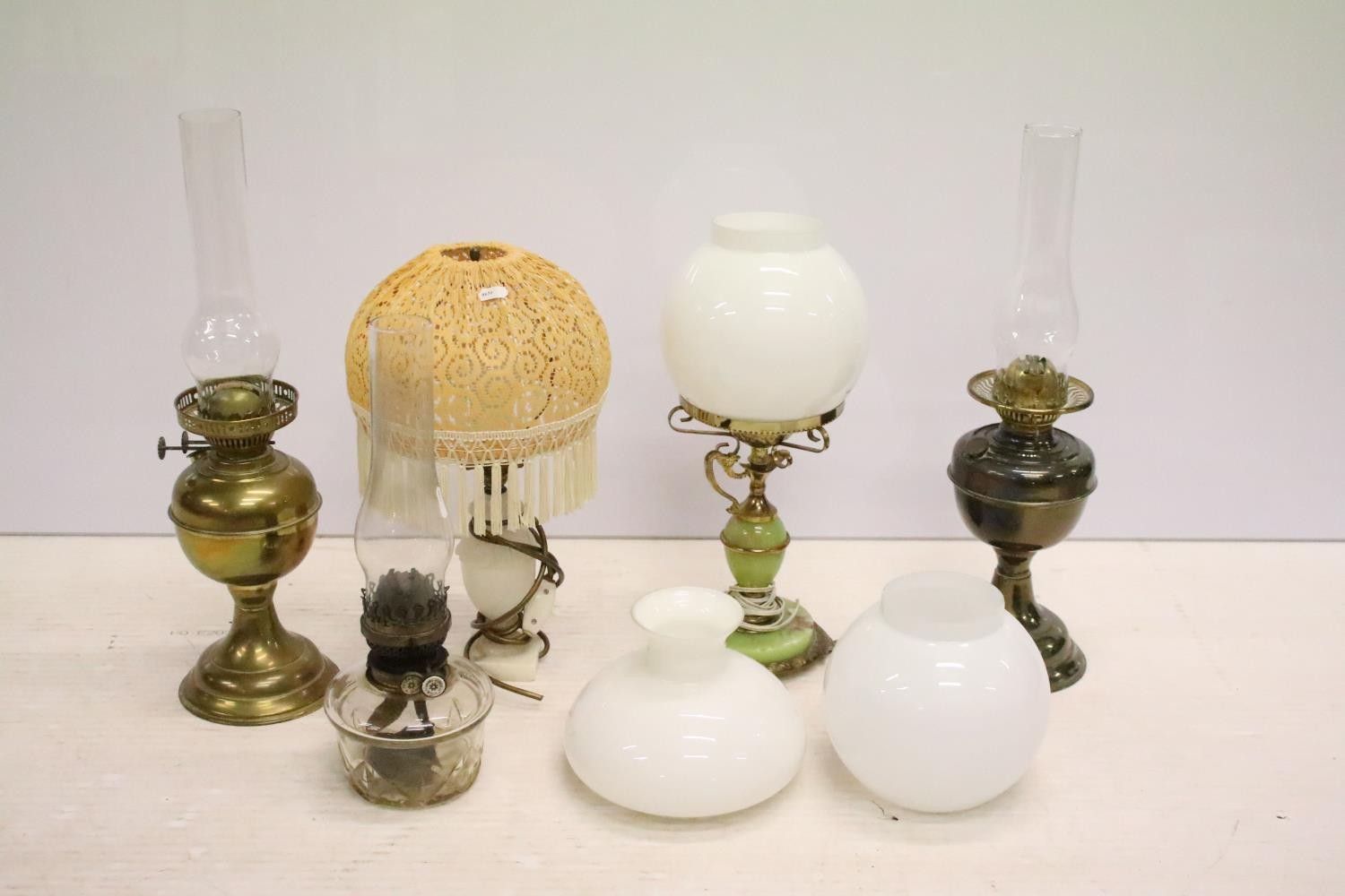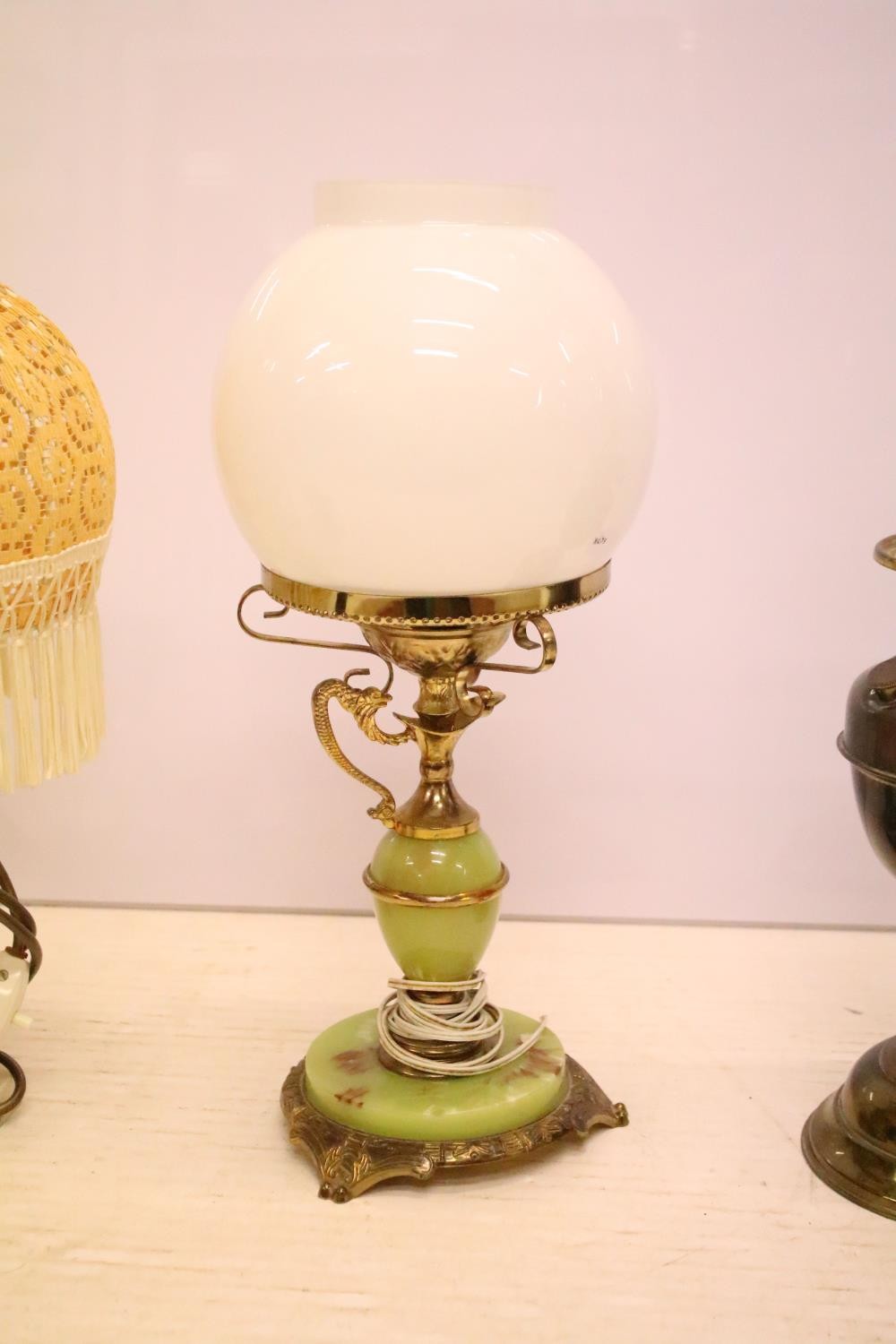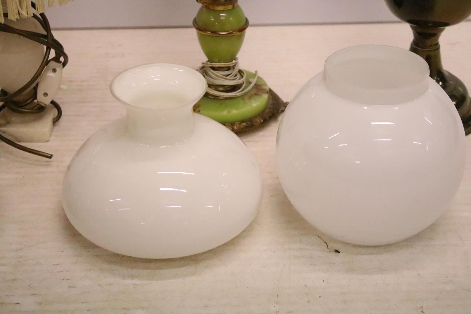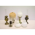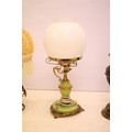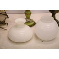 Two 19th Century Victorian oil lamps having milk glass shades together with a carved stone lamp base, and green glass oil lamp conversion lamp base.