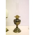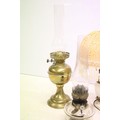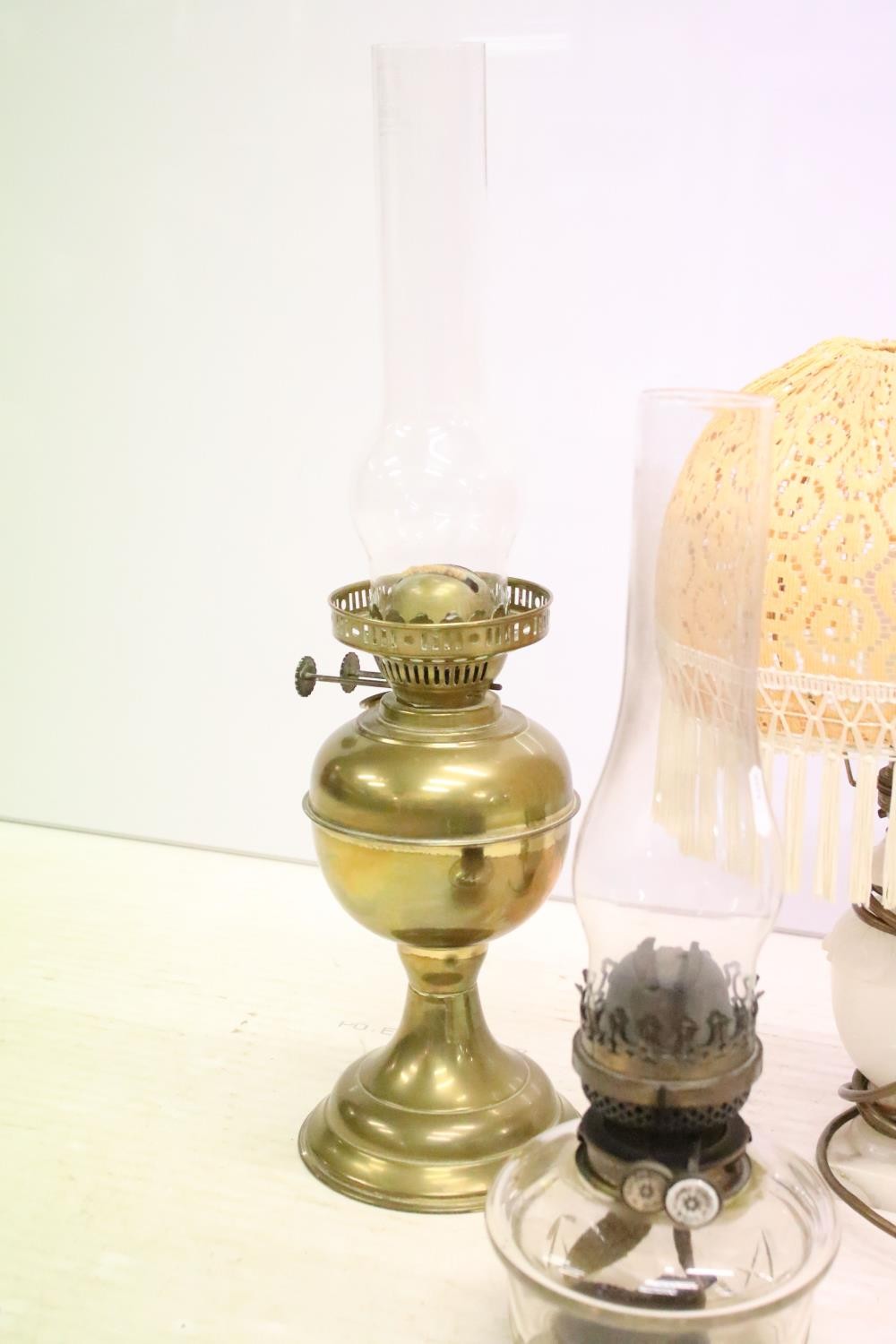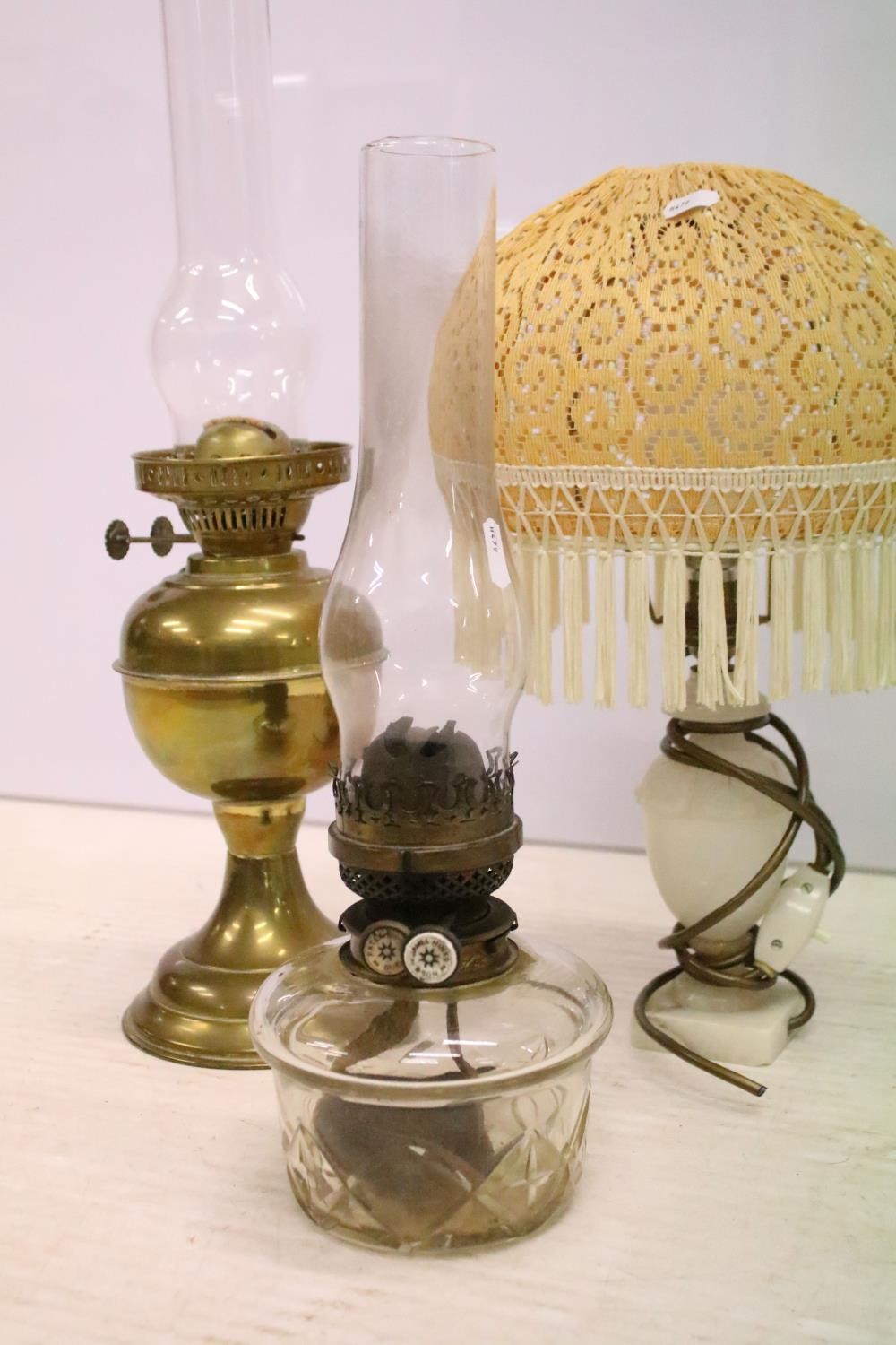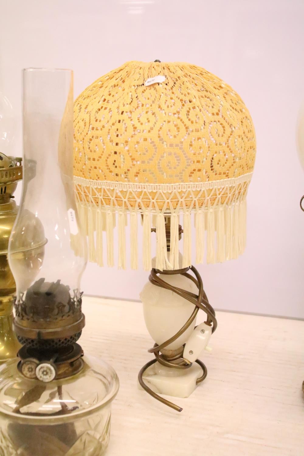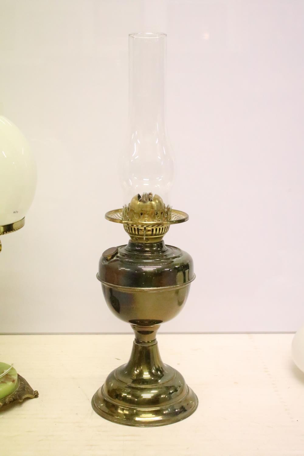 Two 19th Century Victorian oil lamps having milk glass shades together with a carved stone lamp base, and green glass oil lamp conversion lamp base.