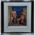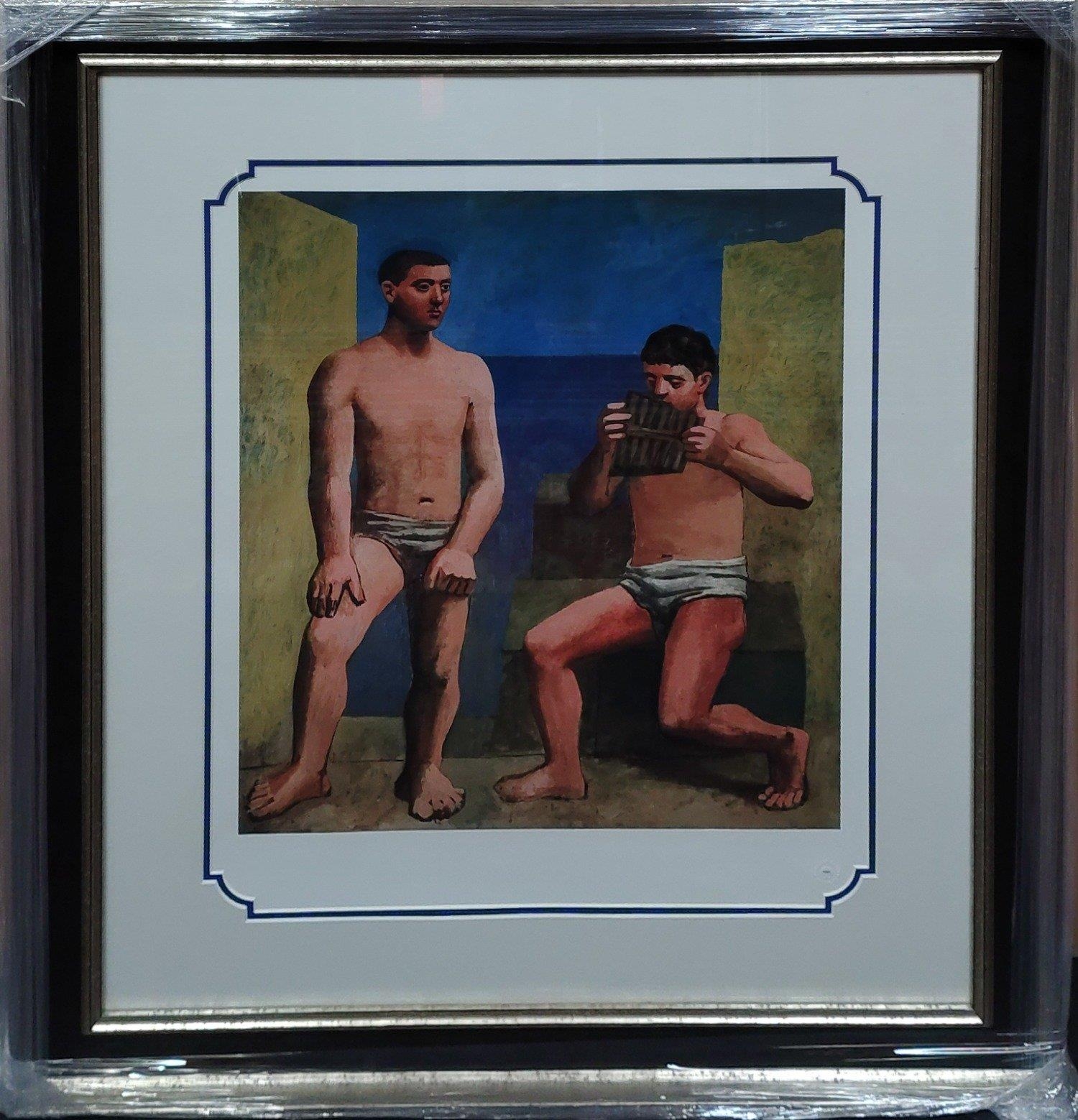 PABLO PICASSO Rare limited edition of the 1923 Pablo Picasso painting "The Pipes of Pan" was published as a numbered edition of only 60 worldwide plus 2 "Master Printers Proofs" of which this is number one (MPP1). Complete with certificate (signed by the Master Printer) Framed and mounted. Composed in 1923, whilst on holiday in Antibes, France, The Pipes of Pan is the crowning achievement of Picasso's neoclassical period of the 1920s. The Pipes of Pan is regarded as the most important painting of this period, not only because of its theme, but also because it draws upon classical interpretations of art in a new and modern style. This monumental painting depicts a mythological scene, set in the Mediterranean, in which two classical figures stare out towards a lost Arcadia, Pans homeland. The figures are heavy, sculptural and contemplative. In the painting Picasso transforms Pan, the ancient Greek god of shepherds and flocks who has the hind legs and horns of a goat, into a young boy. Picasso's Pan reveals none of the laziness or lustiness of the original Greek god. The origins of Pan's pipes lie in the ancient Greek tale of Syrinx, who was pursued by the amorous Pan and chased into a river, whereby she turned into a hollow reed. Pan then cut the reeds and fashioned them into the first musical pipes. Throughout Picasso's many periods of transition, he would often refer to various mythological figures, one of the most famous being the Minotaur. Yet Picasso was not primarily concerned with the old myths but rather by their transformation into modern 20th century art.
