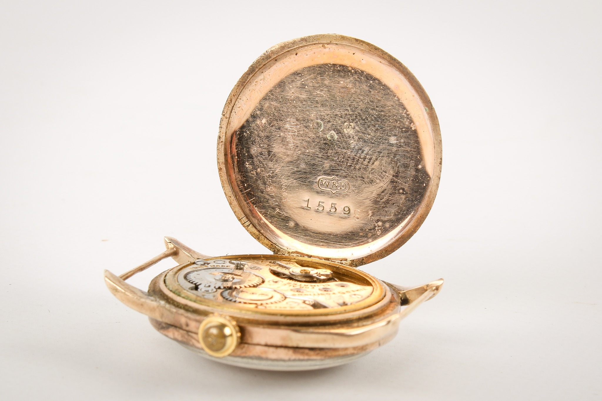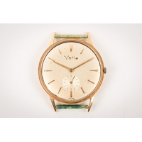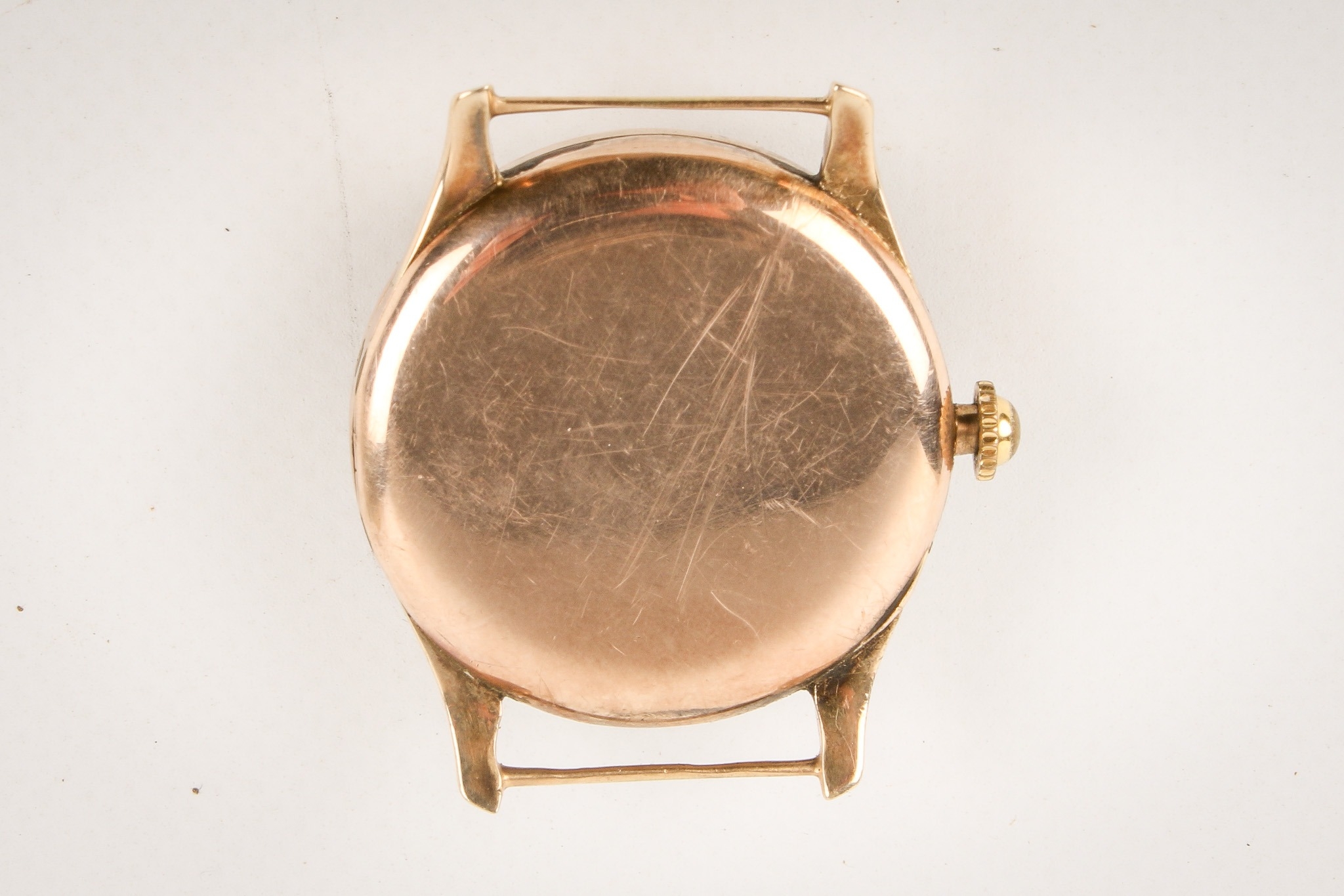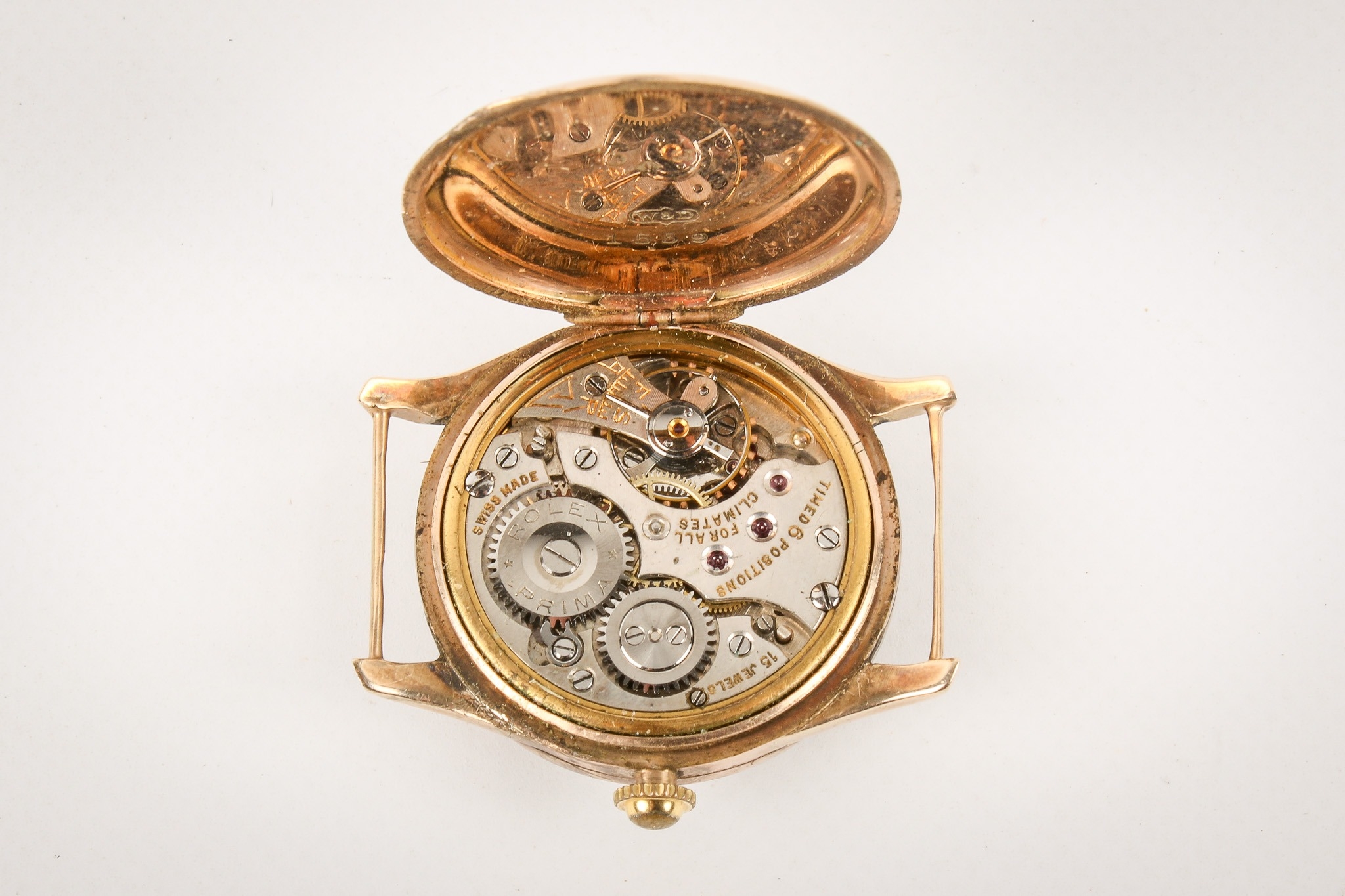 A 1920s 9ct gold Rolex wristwatch, without strap. Black Arabic numerals and subsidiary dial to the engine-turned champagne face, import hallmarks to the hinged inside back case, case diameter 2.9cm, 15 jewels movement, movement marked Rolex Prima. Gross weight 20.5g.