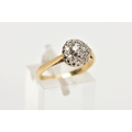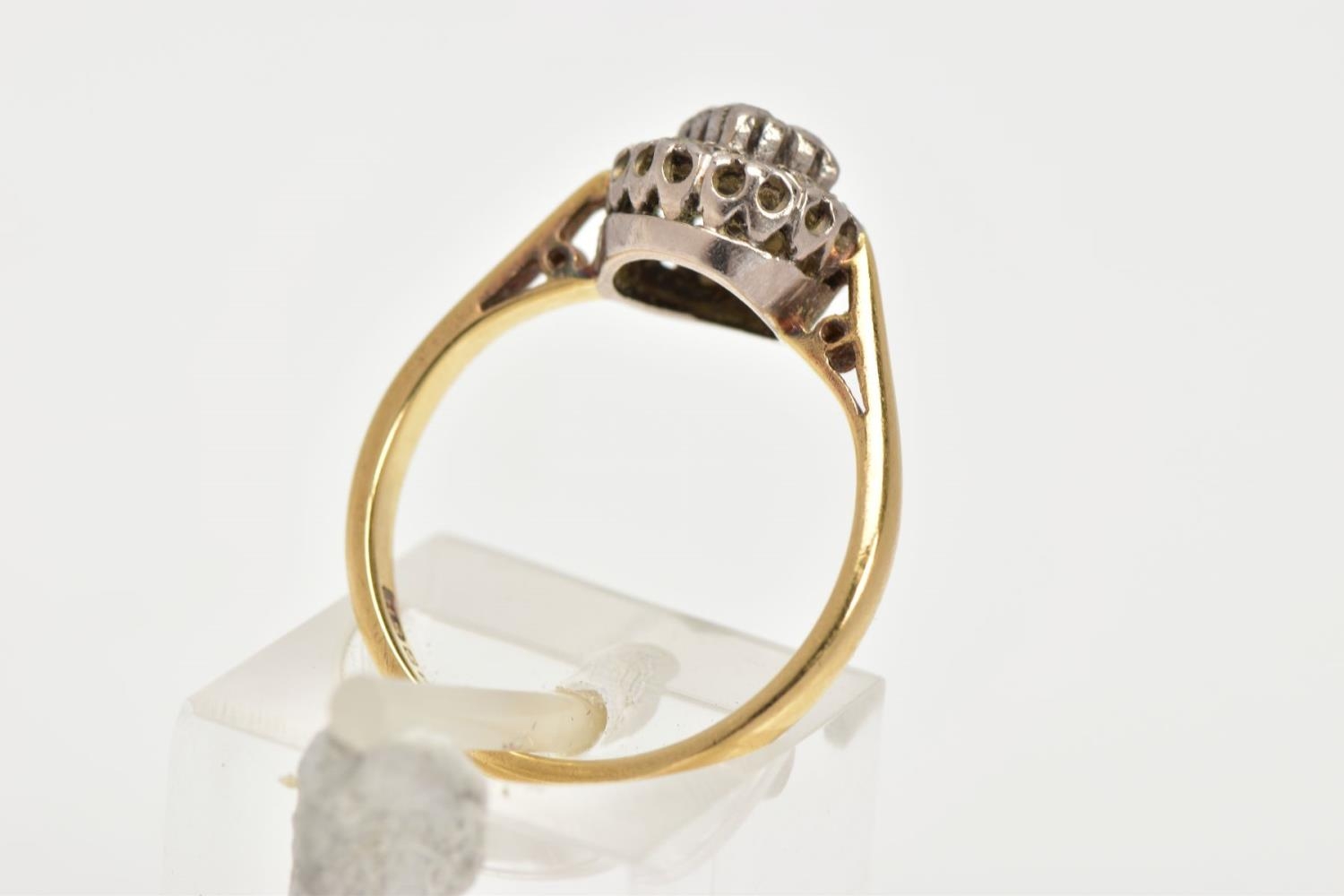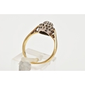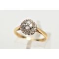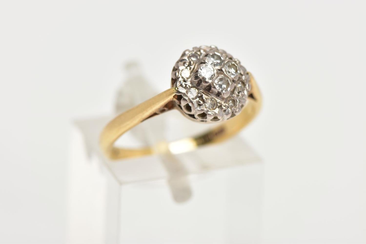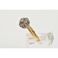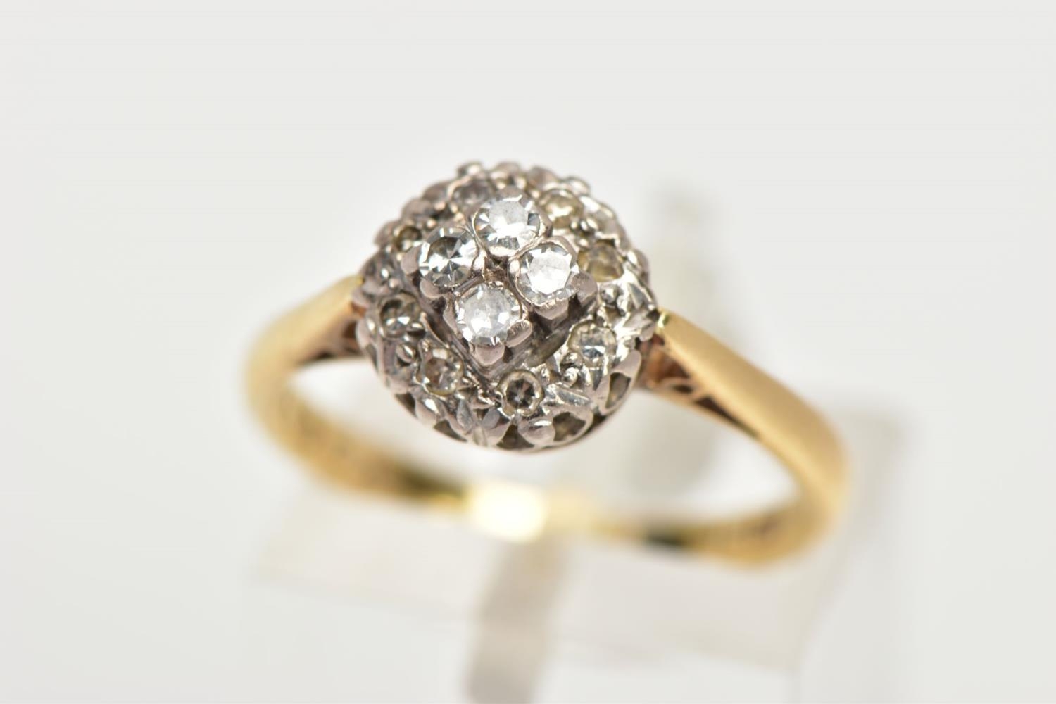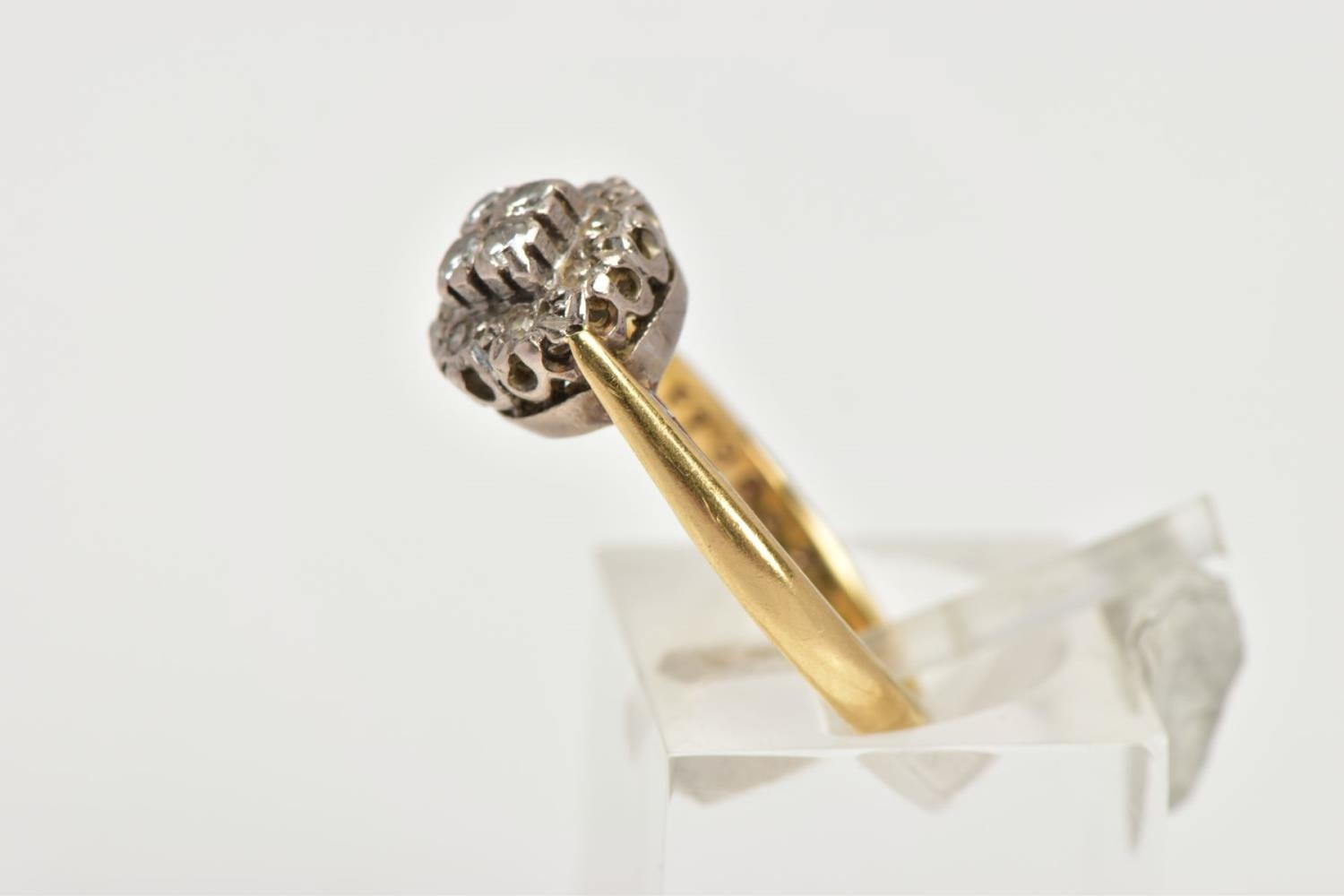 AN 18CT GOLD DIAMOND CLUSTER RING, slightly raised circular cluster ring, set with single cut diamonds, estimated total diamond weight 0.16cts, tapered shoulders to a plain polished band, rubbed 18ct gold Birmingham hallmark, ring size K 1/2, approximate gross weight 3.5 grams (condition report: all diamonds are present, general light wear, claw settings are thinning and in need of some attention, one diamond has a large chip, overall condition good)