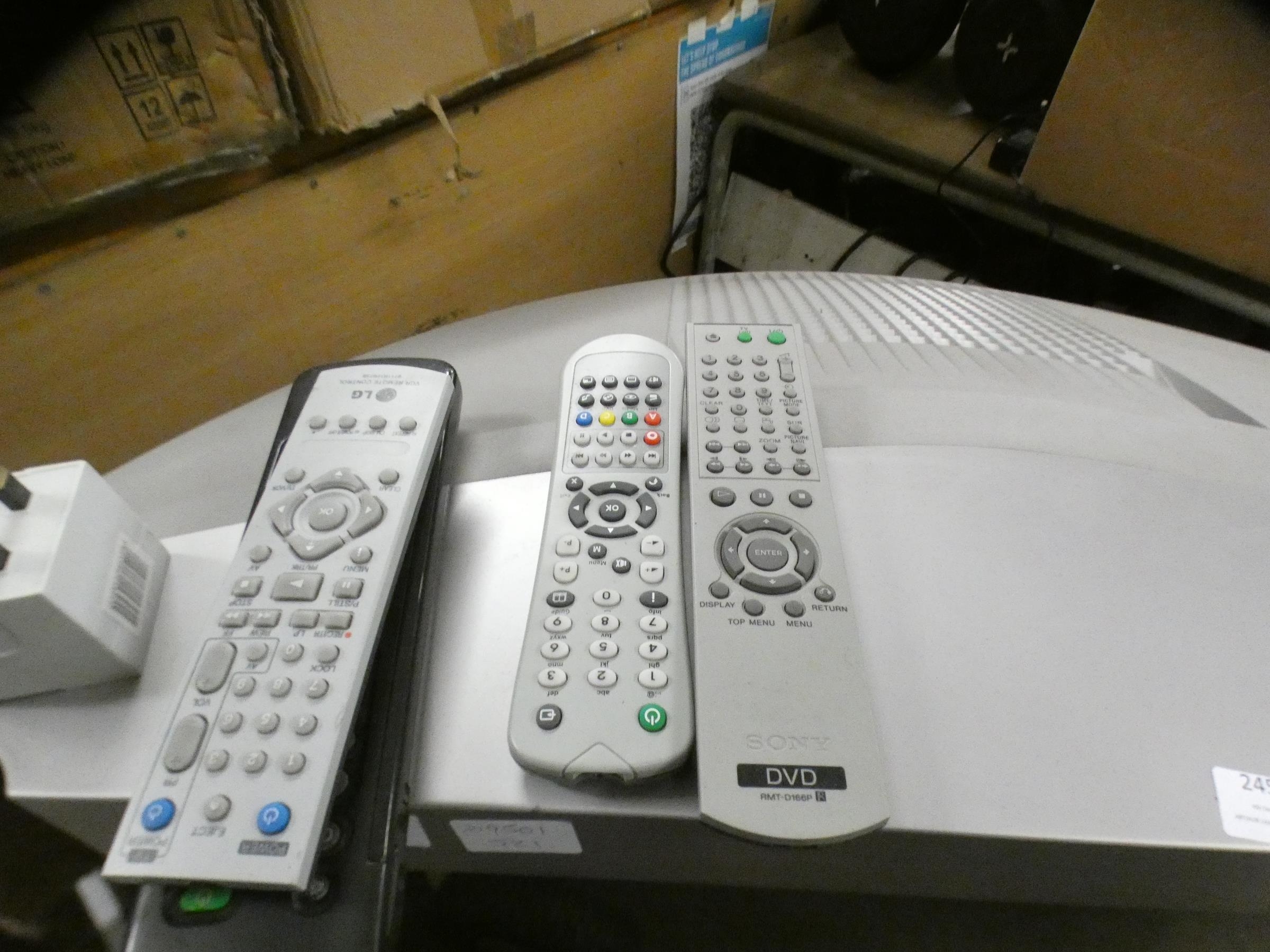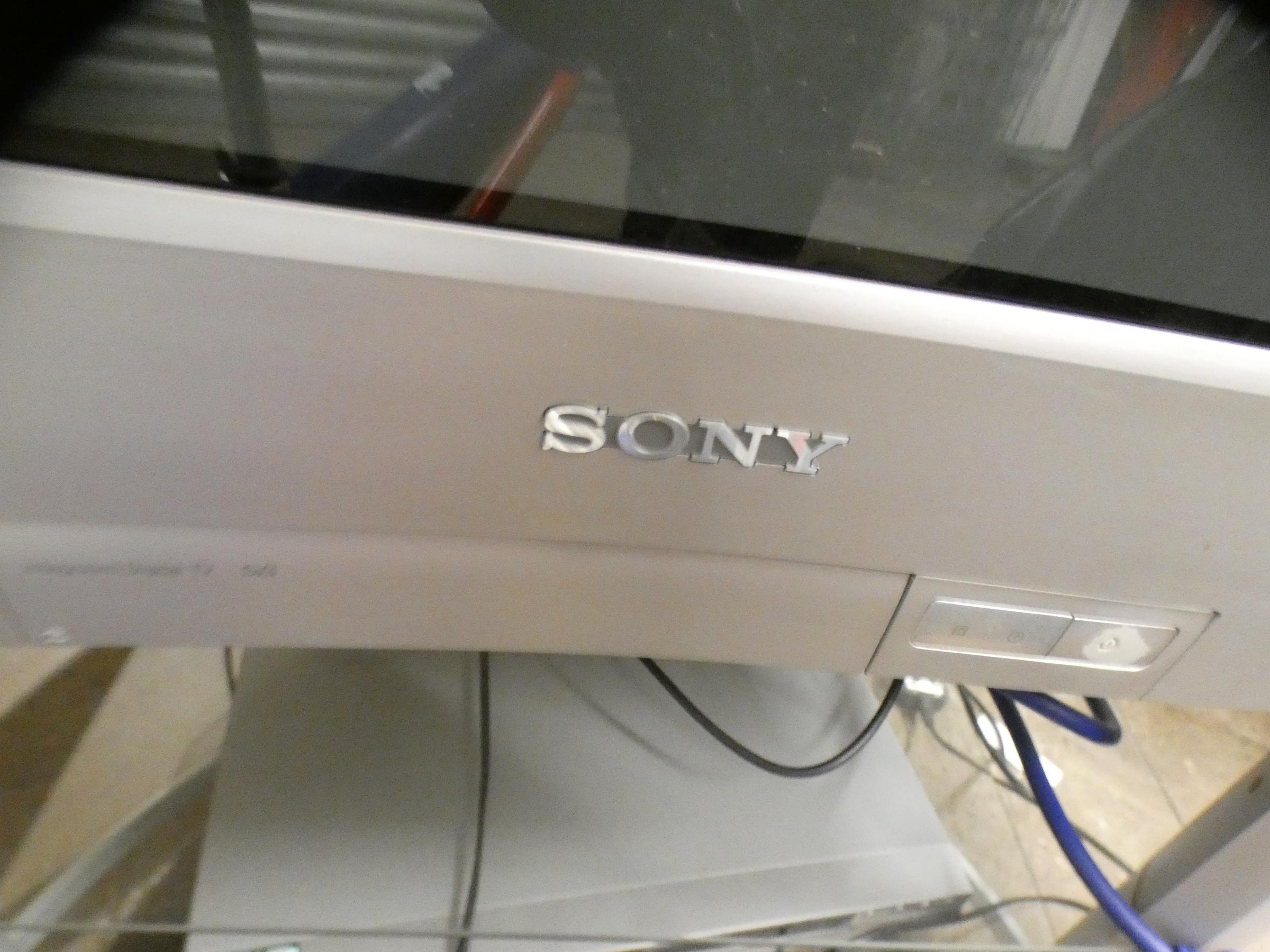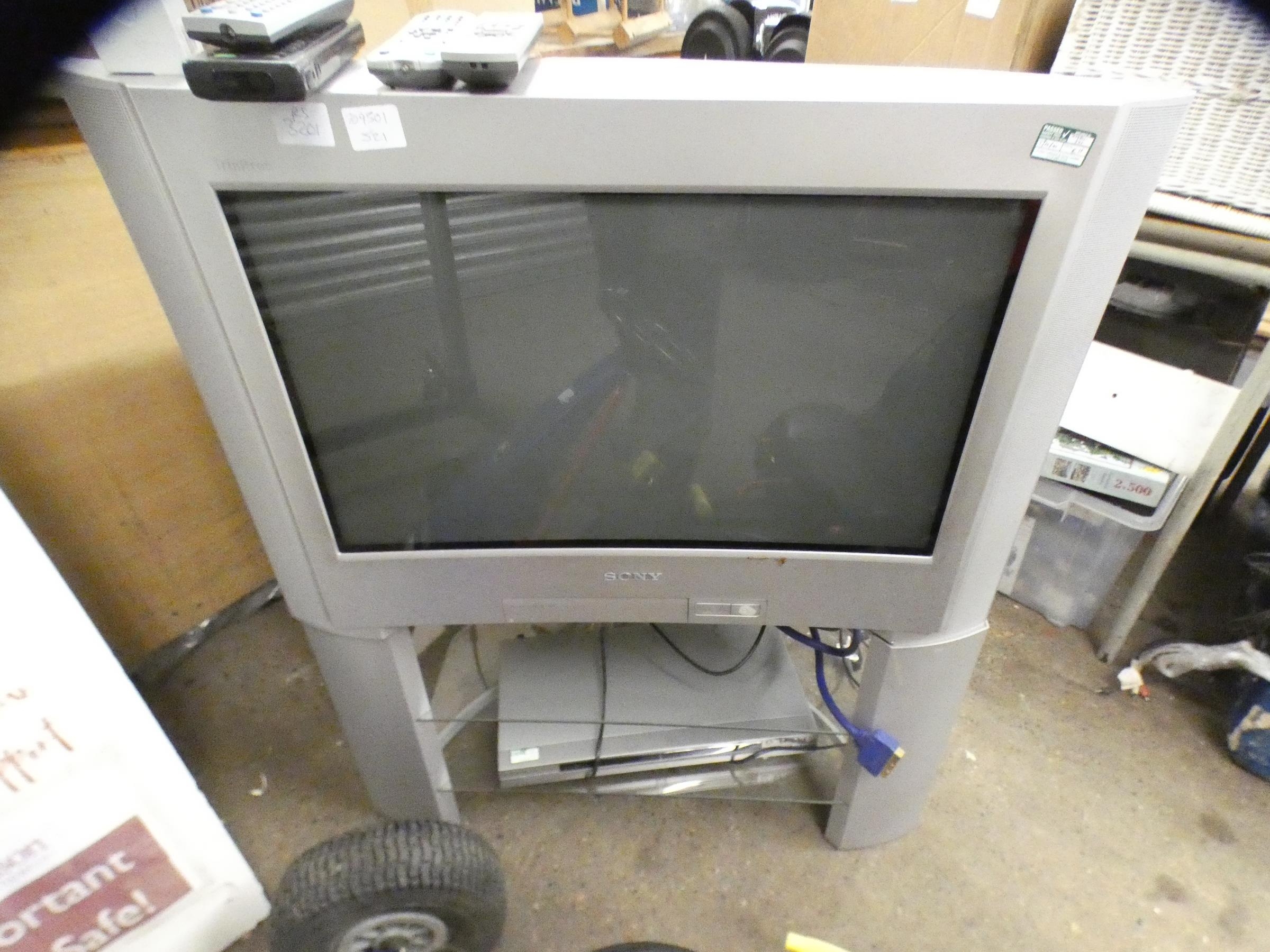 Sony Triatron colour TV on stand with Sony DVD player and remote controls