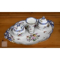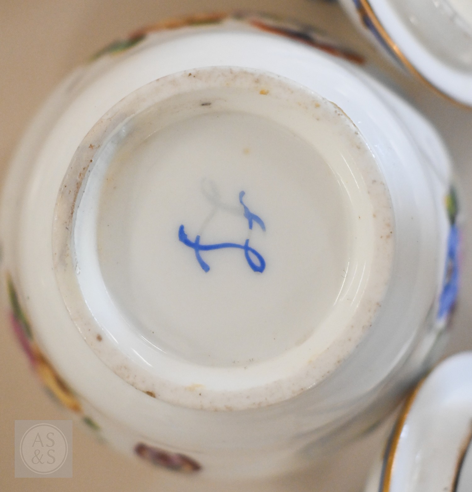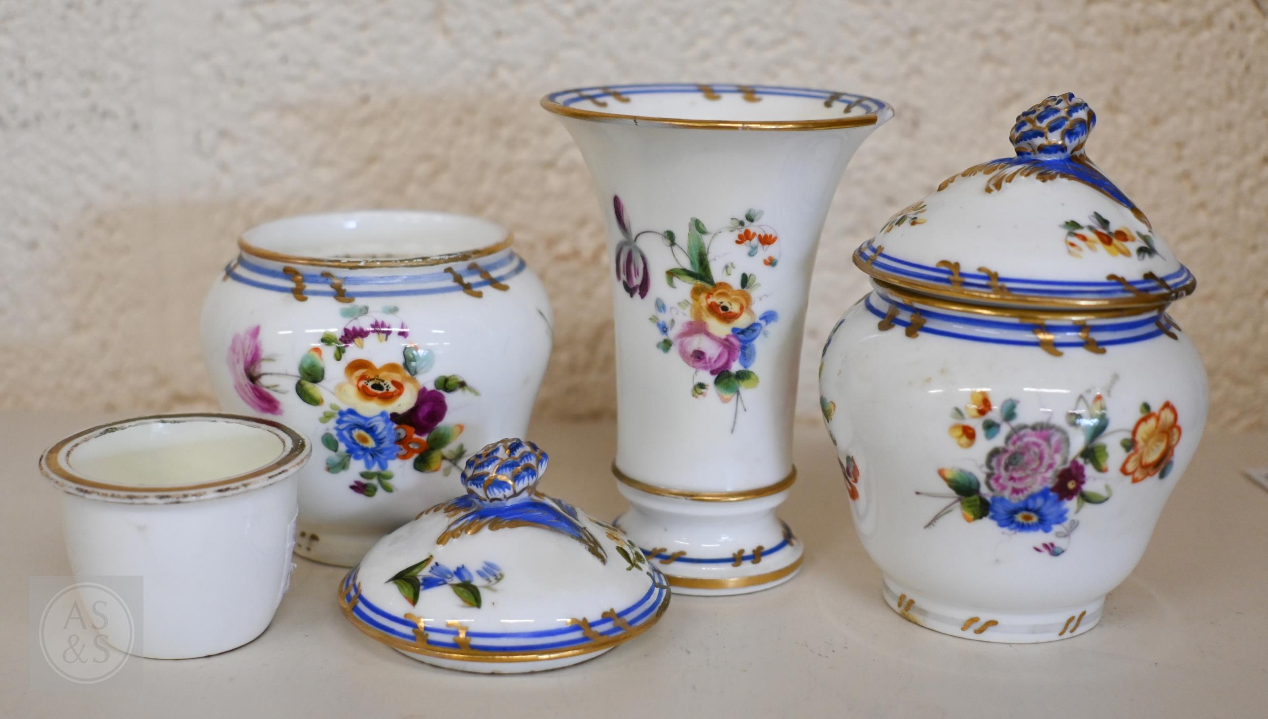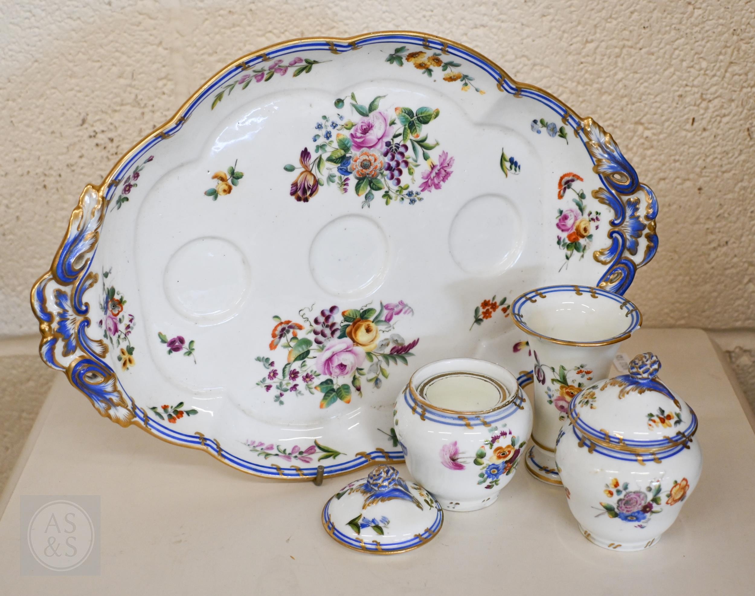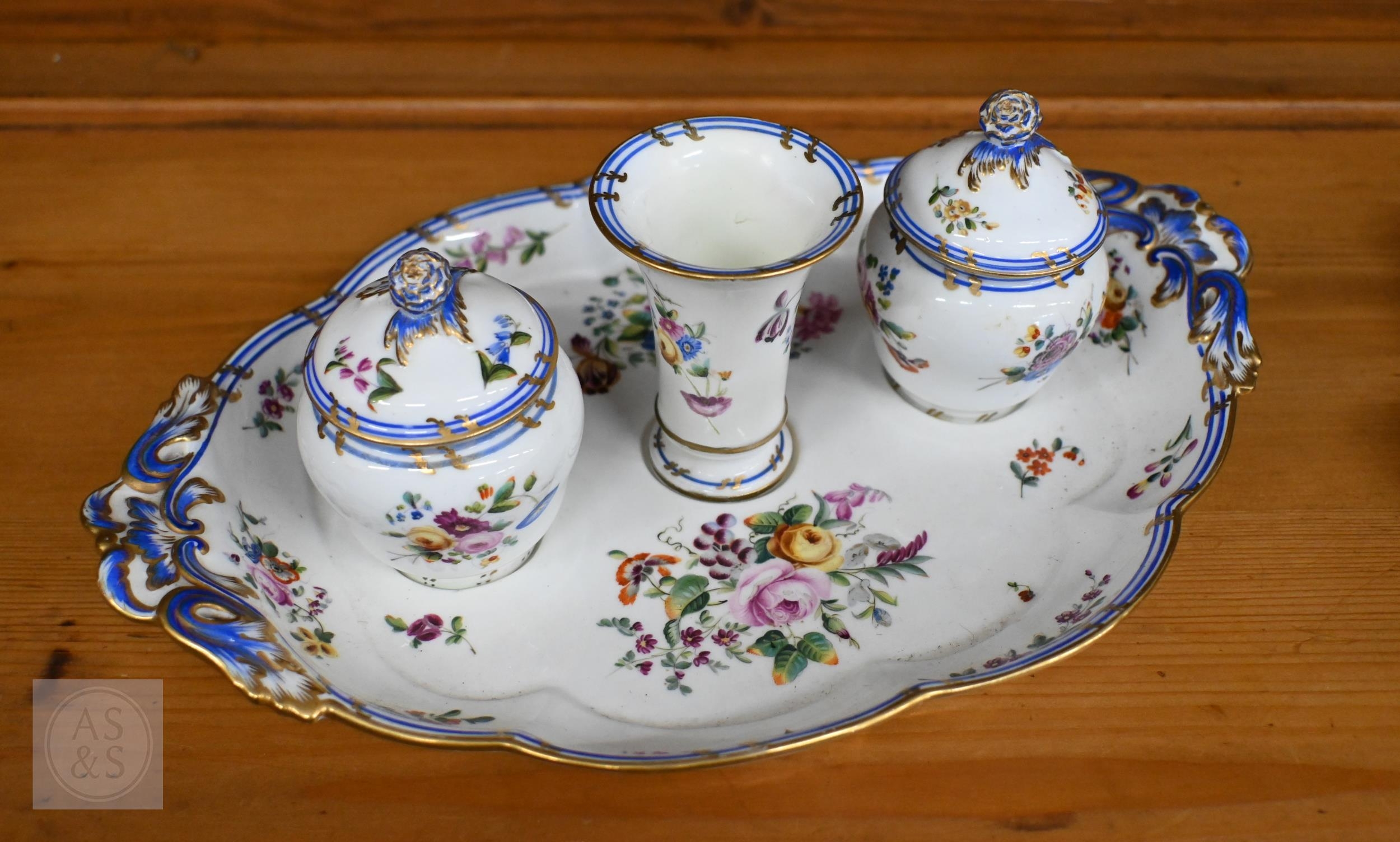 An antique Sèvres porcelain inkstand with floral-painted decoration and posy vase flanked by two inkwells and covers, 31 cm wide
