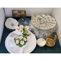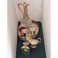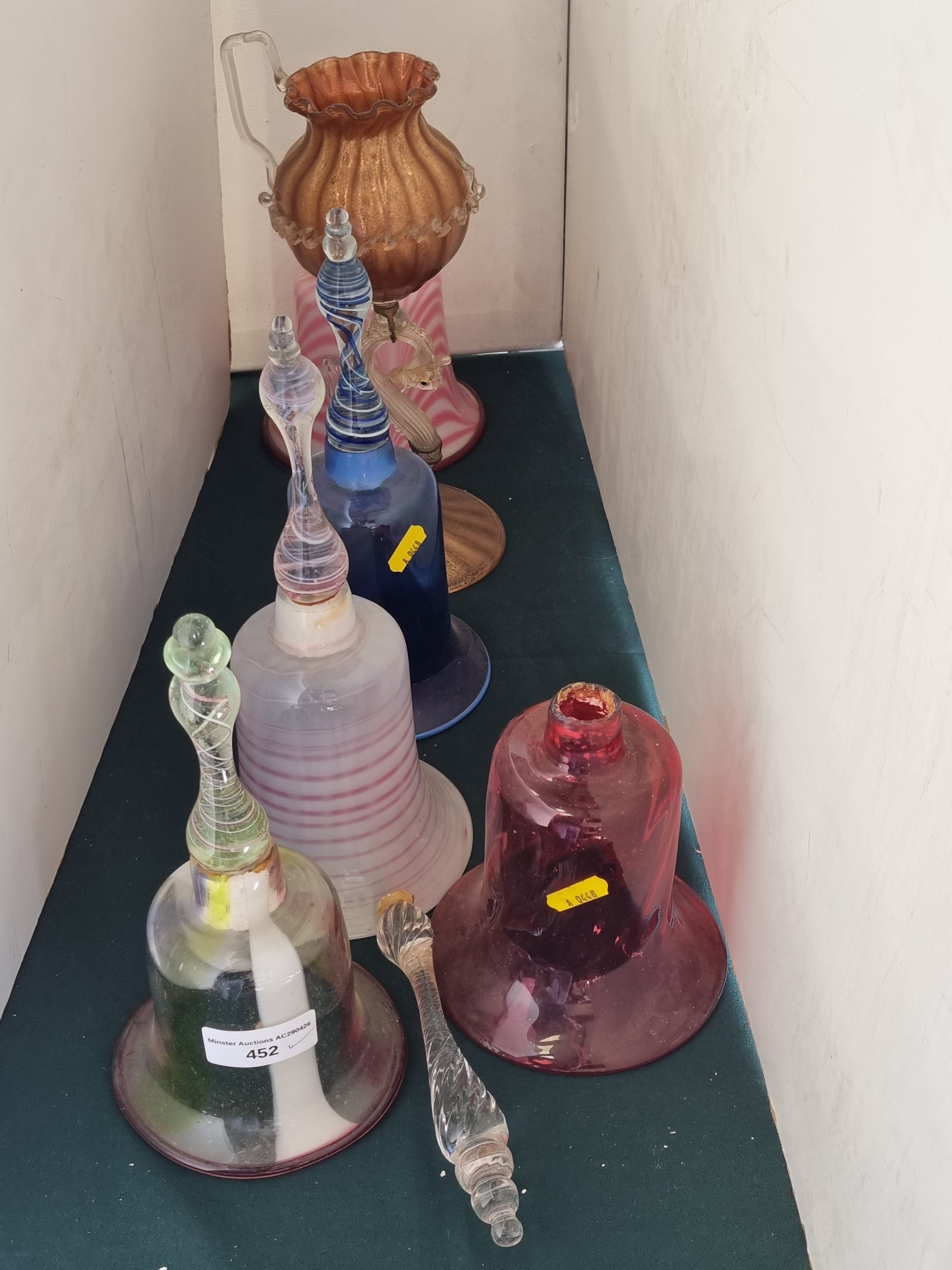 Five various coloured glass Bells, one A/F, a coloured glass Candle Holder with sphinx type support, (R4)