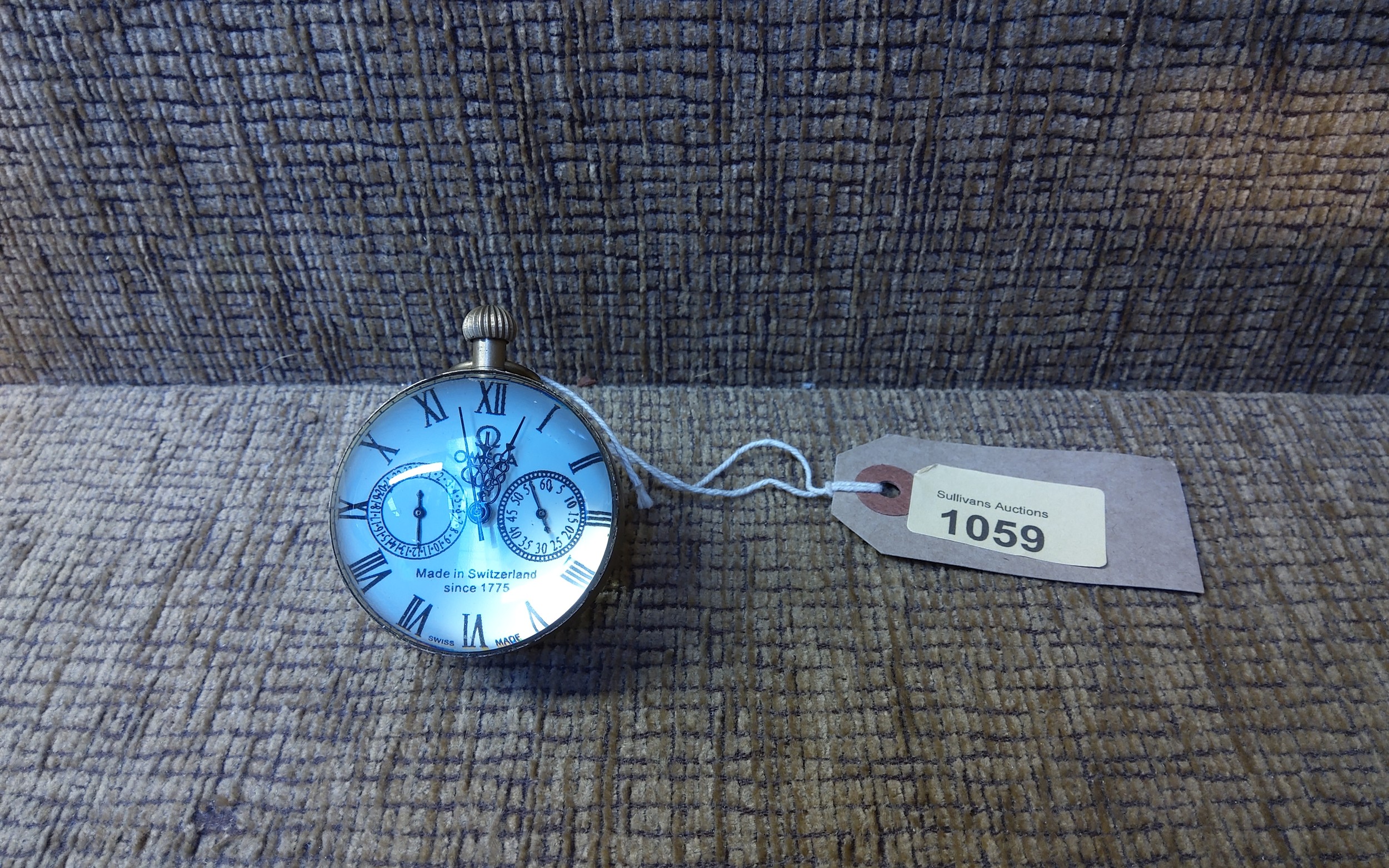Desk Paperweight Clock displaying "Omega Switzerland Made 1772.