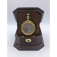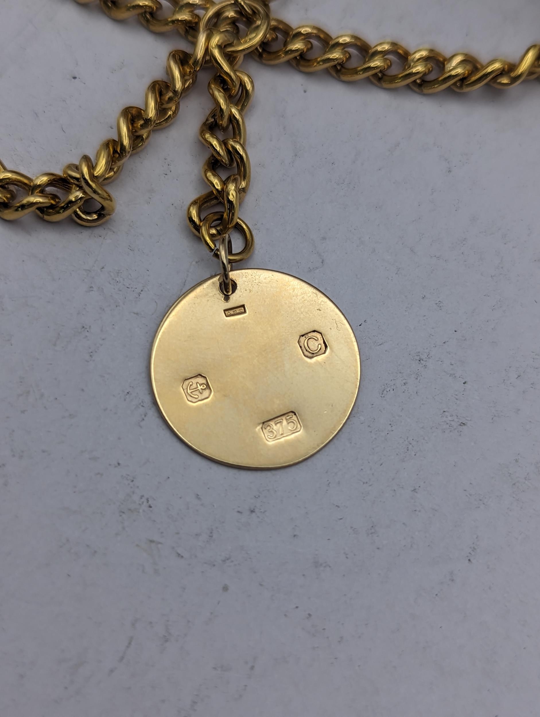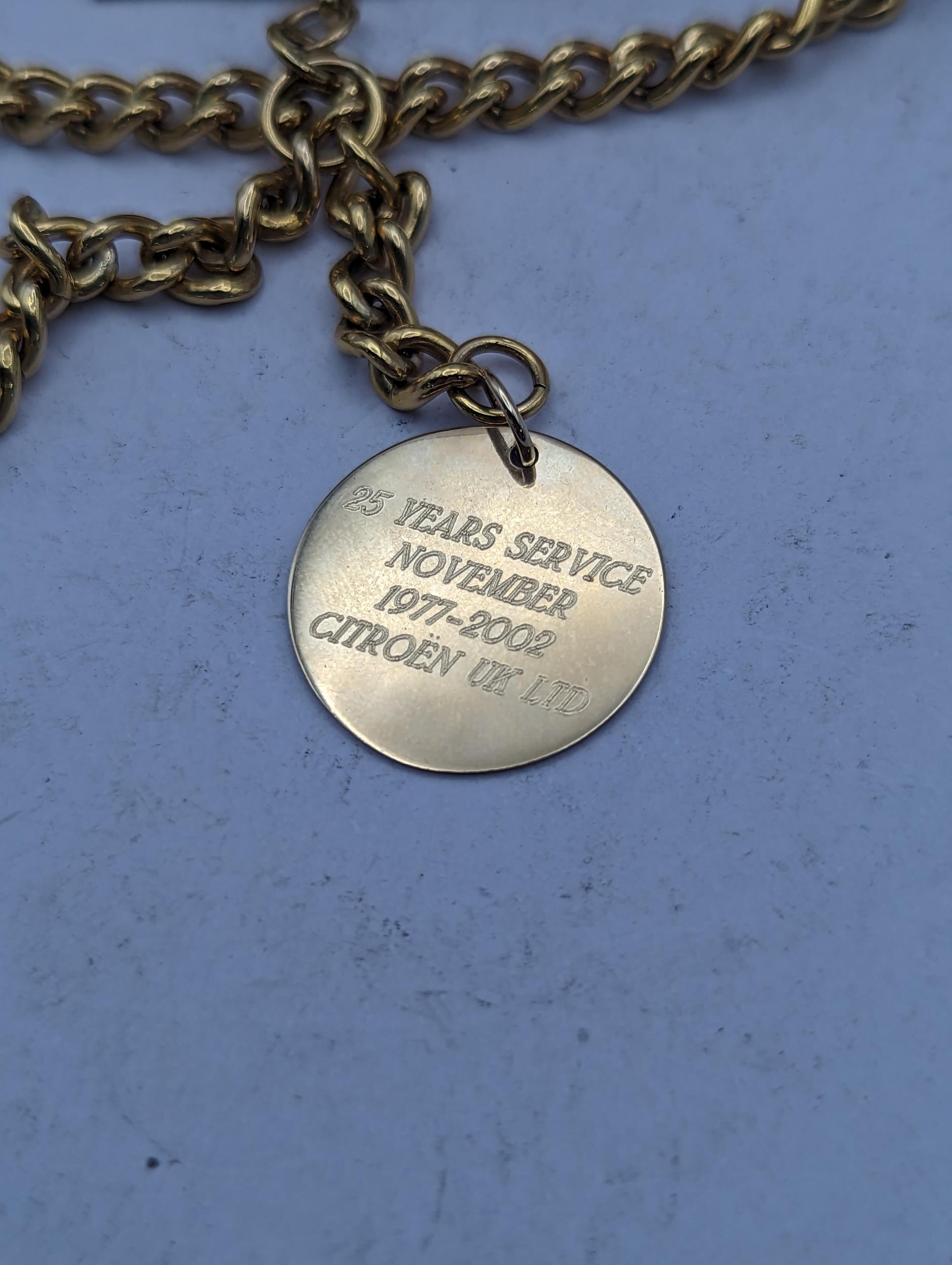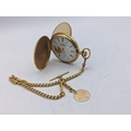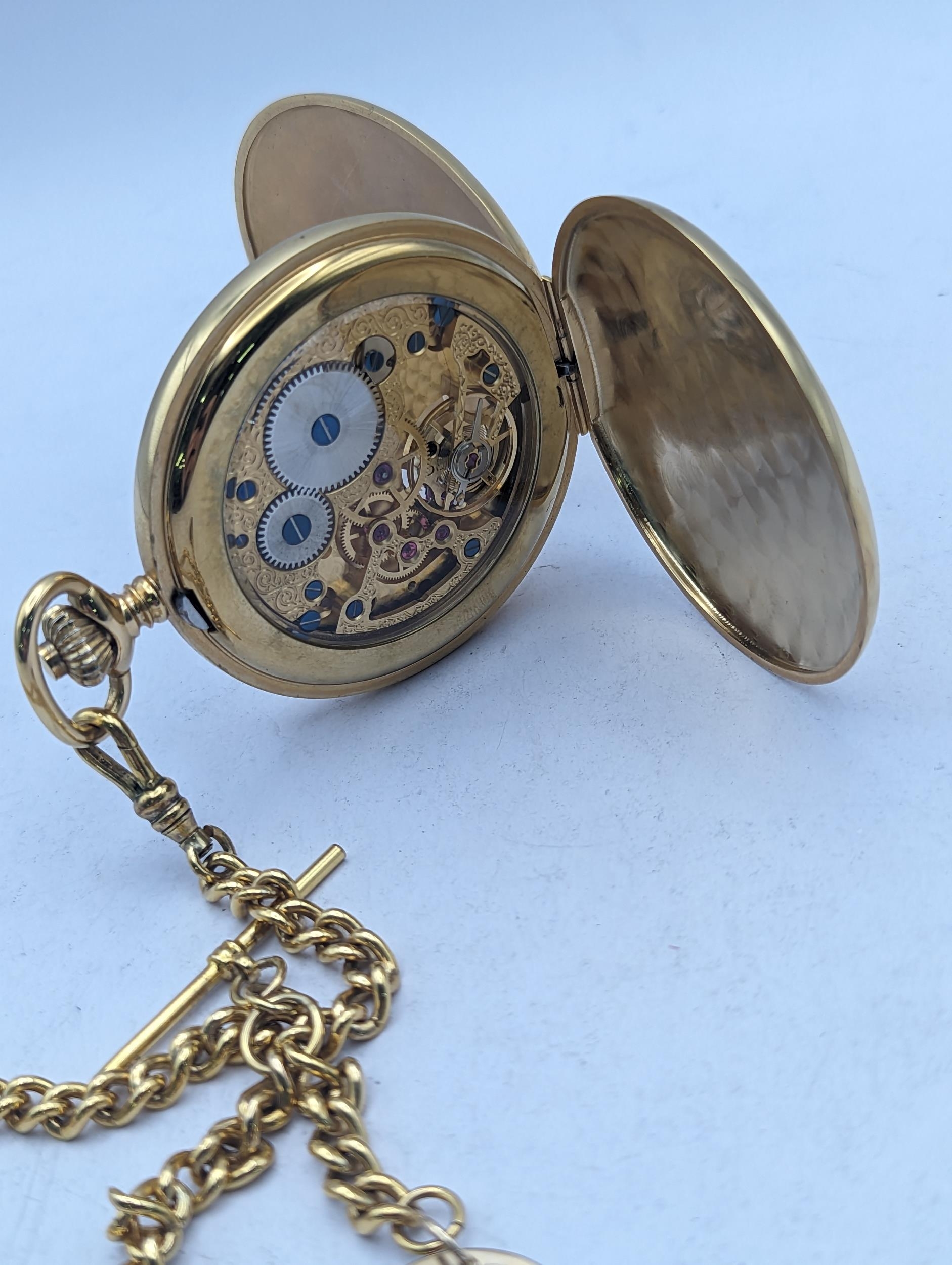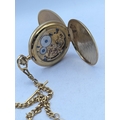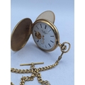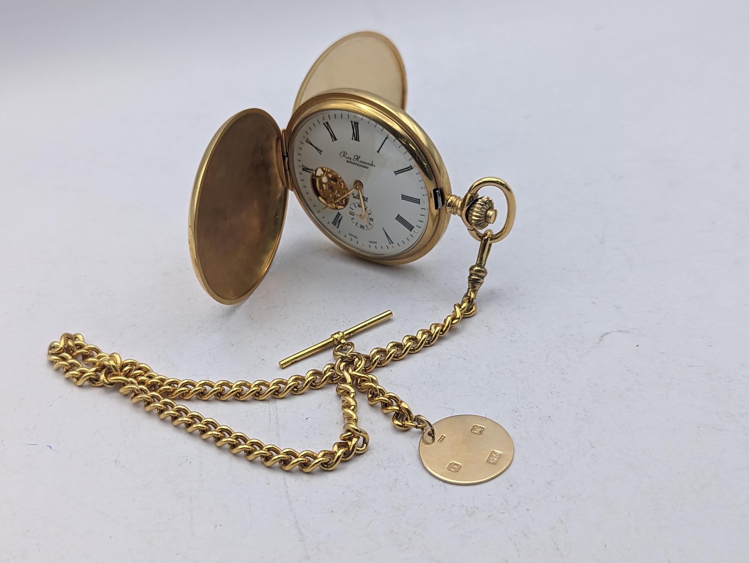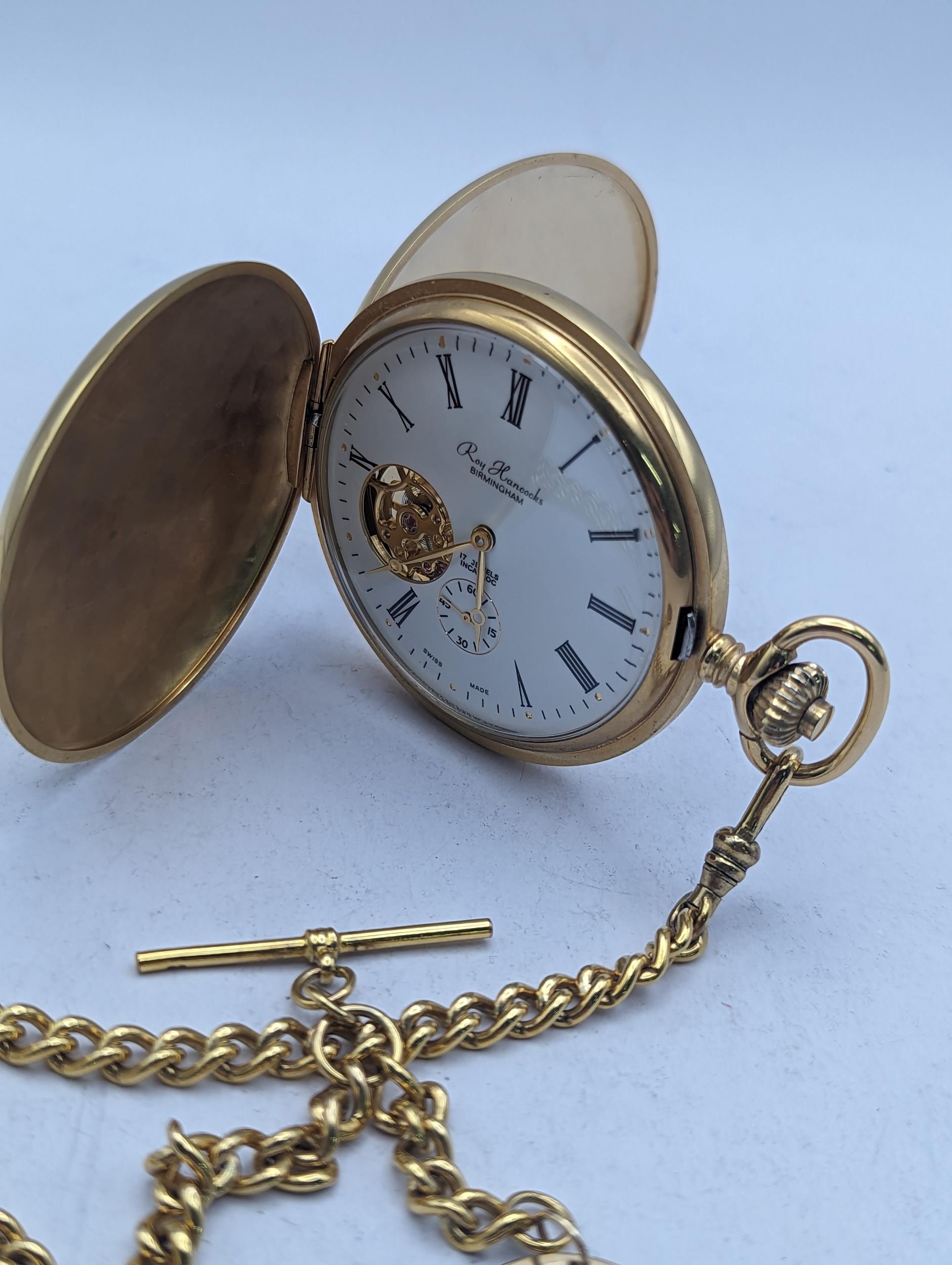 A gold plated Roy Hancocks of Birmingham full handler pocket watch having Roman numerals subsidiary seconds and part exhibition, did on a gold plated watch chain having a 9ct gold pendant with inscription