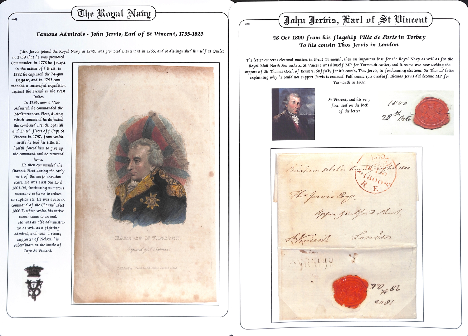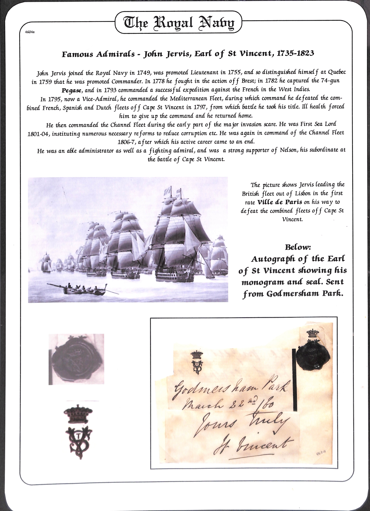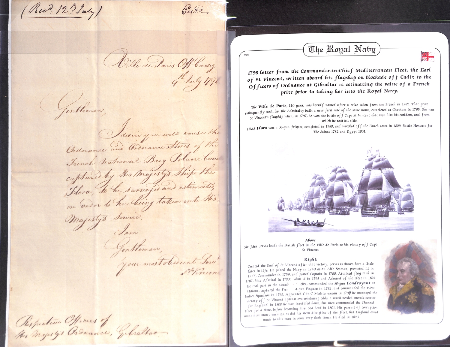 Admiral John Jervis, Earl St. Vincent. 1798 (July 9) Order from the "Ville de Paris off Cadiz" to Officers of H.M Ordnance at Gibraltar requesting a survey and estimate of the ordnance and stores from the French Brig "Polacre Corvette" captured by H.M.S "Flora"; and 1800 (Oct. 28) letter concerning election matters written from the "Ville de Paris" in Torbay enclosing a letter from Sir Thomas Gooch with a copy of his reply, posted as a free frank at Brixham to his cousin in London, all signed "St Vincent". Also an autograph on piece and coloured print of Earl St Vincent. Jervis commanded the 1794 expedition that captured Martinique and Guadeloupe, and was Commander-in-Chief in the Mediterranean at the Battle of St. Vincent in 1797. (4).