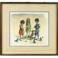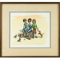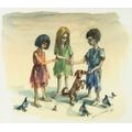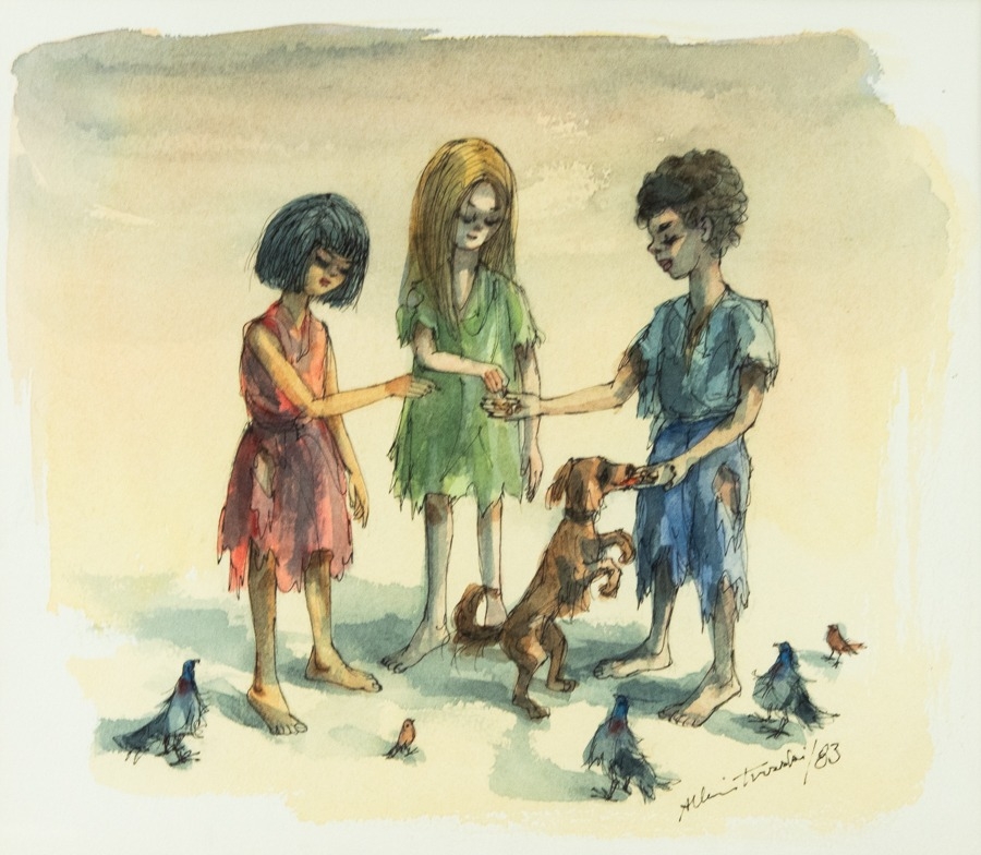 Ragged figures feeding birds