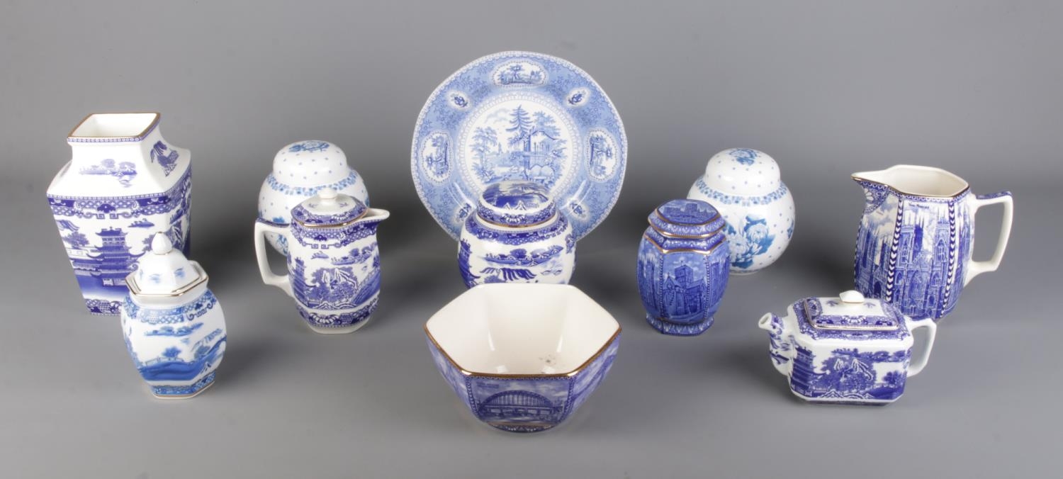 A collection of Ringtons blue and white ceramics, to include a pair of Chrysanthemum ginger jars, Tranquil Garden Plate, Willow Story Vase and Algernon Road, Newcastle examples.