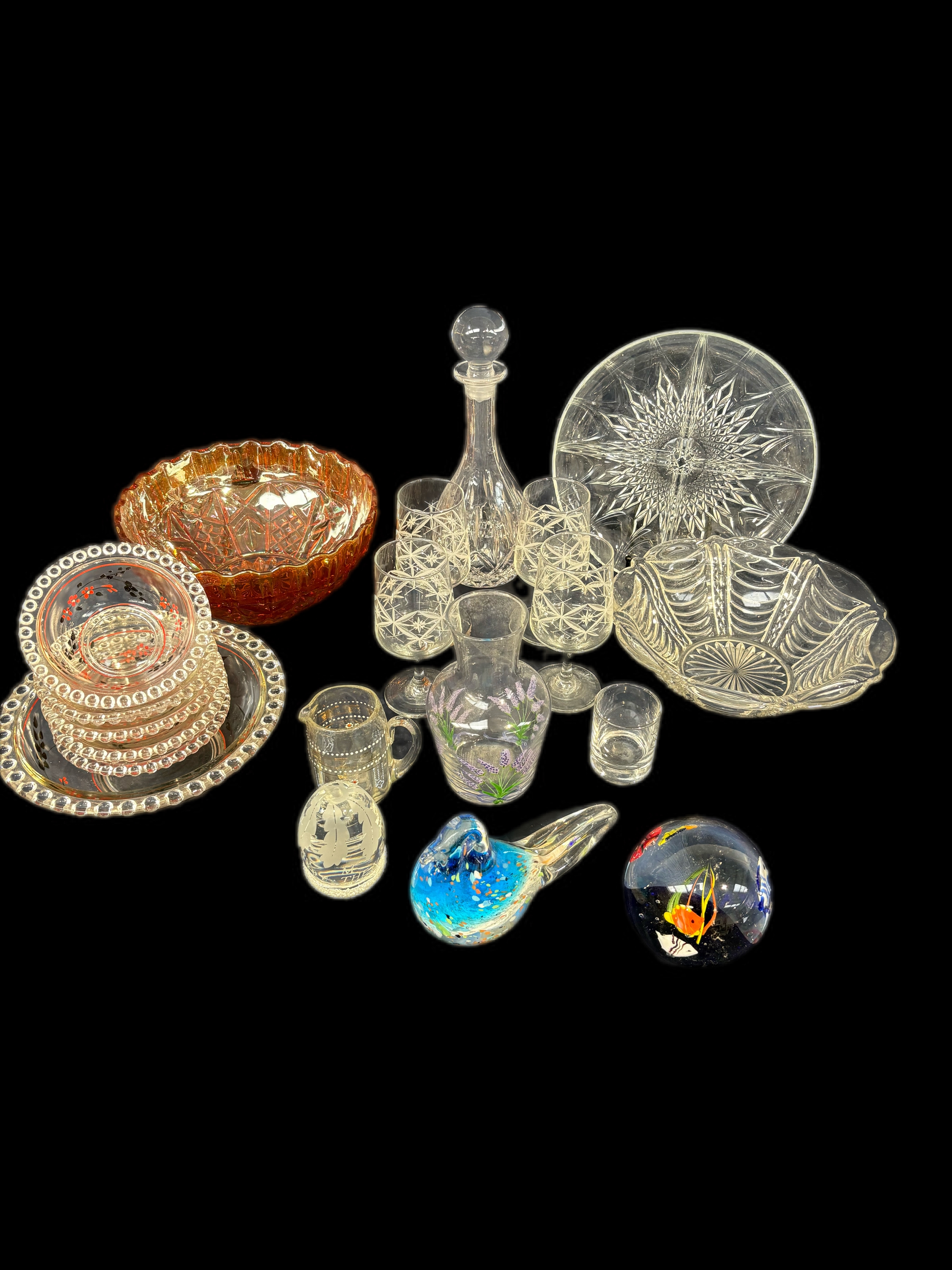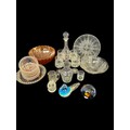 Mixed group of glassware, paperweights, decanter and bowls