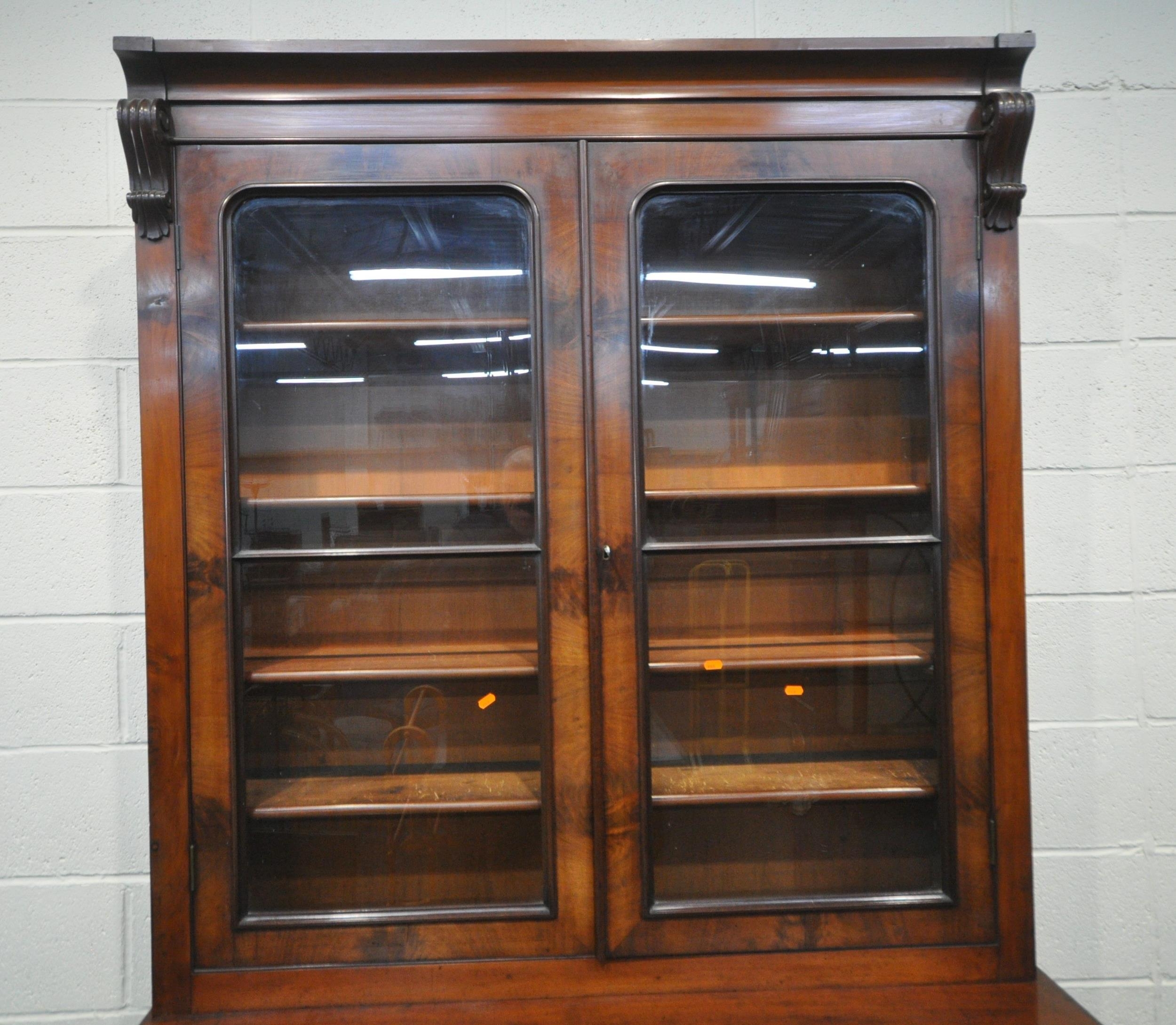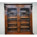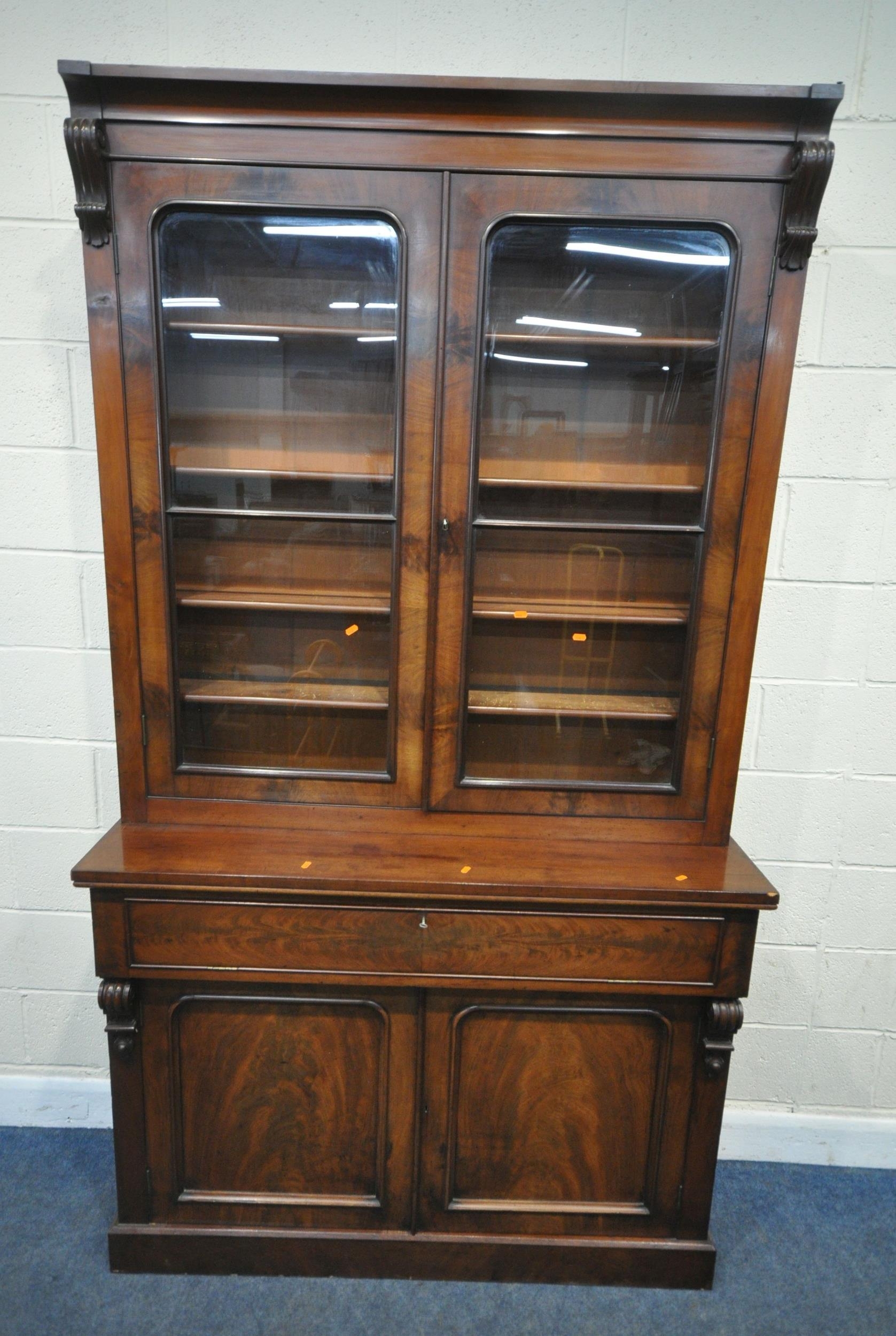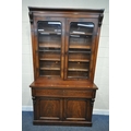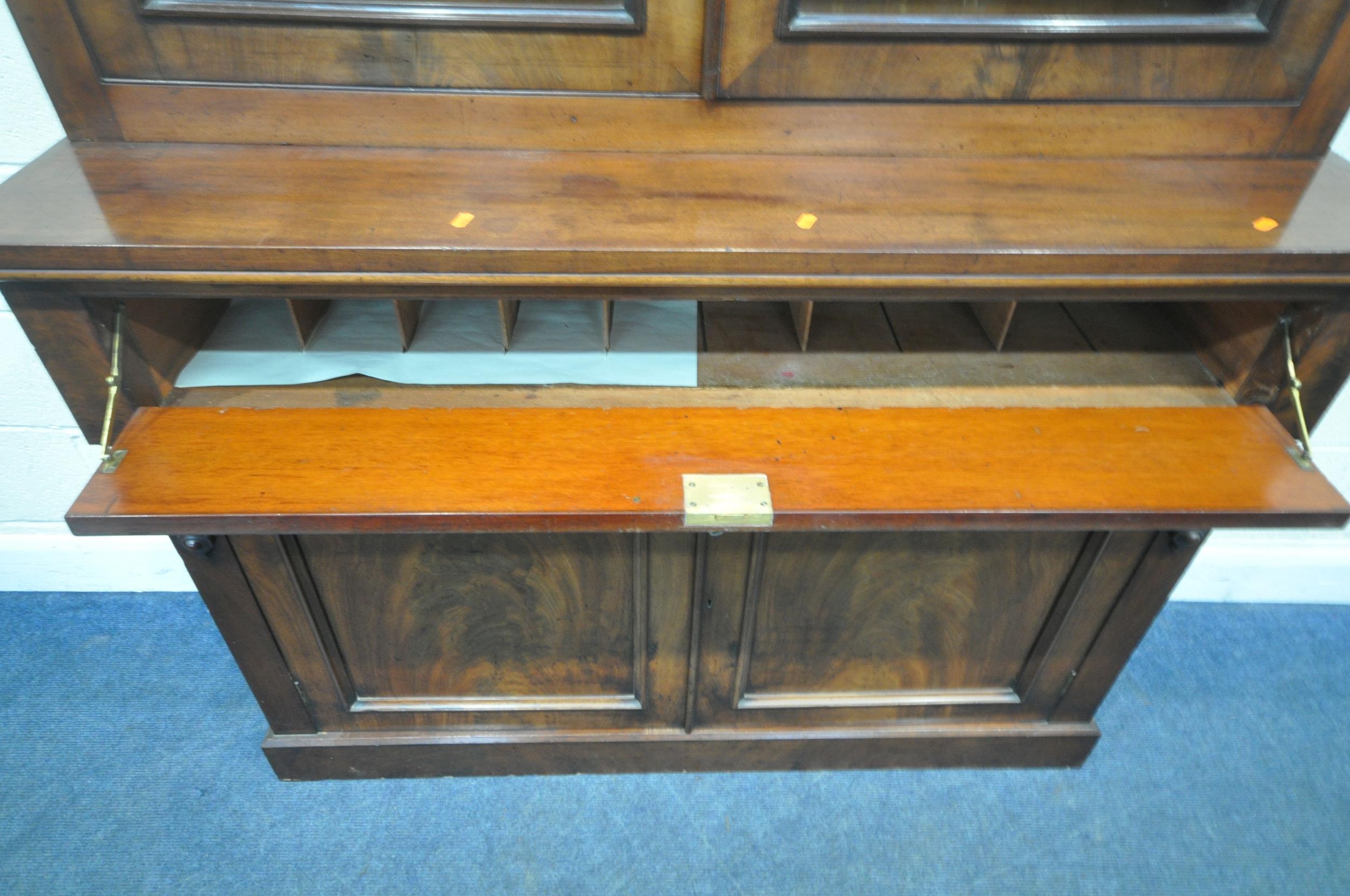 A VICTORIAN MAHOGANY BOOKCASE, the double glass doors enclosing four shelves, atop a base with a fall front door, thats enclosing an arrangement of divisions, over double cupboard doors, width 133cm x depth 43cm x height 236cm x height of base 99cm, condition report: two keys, veneer loss to front right surface, historical signs of usage