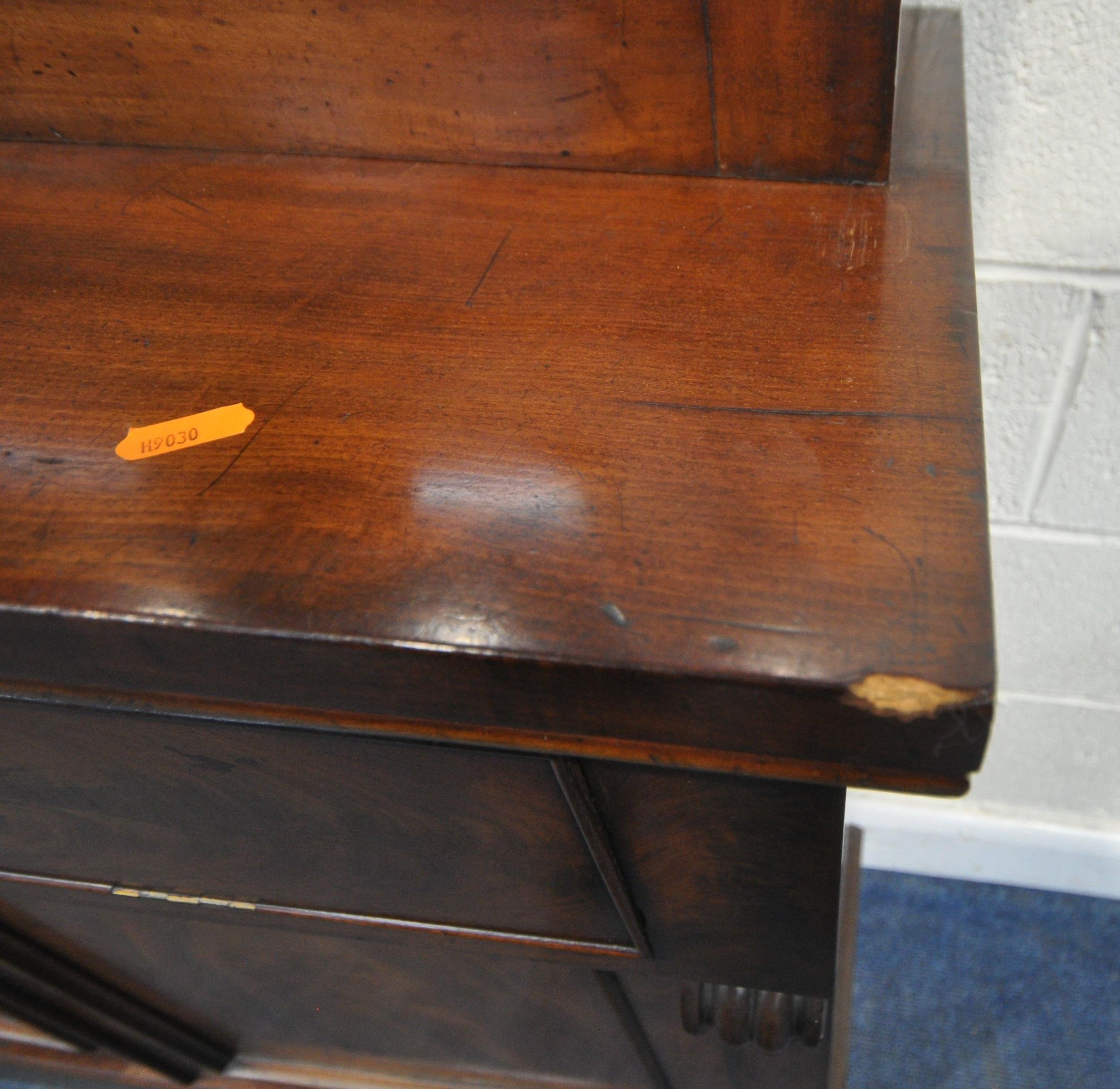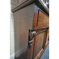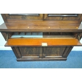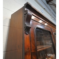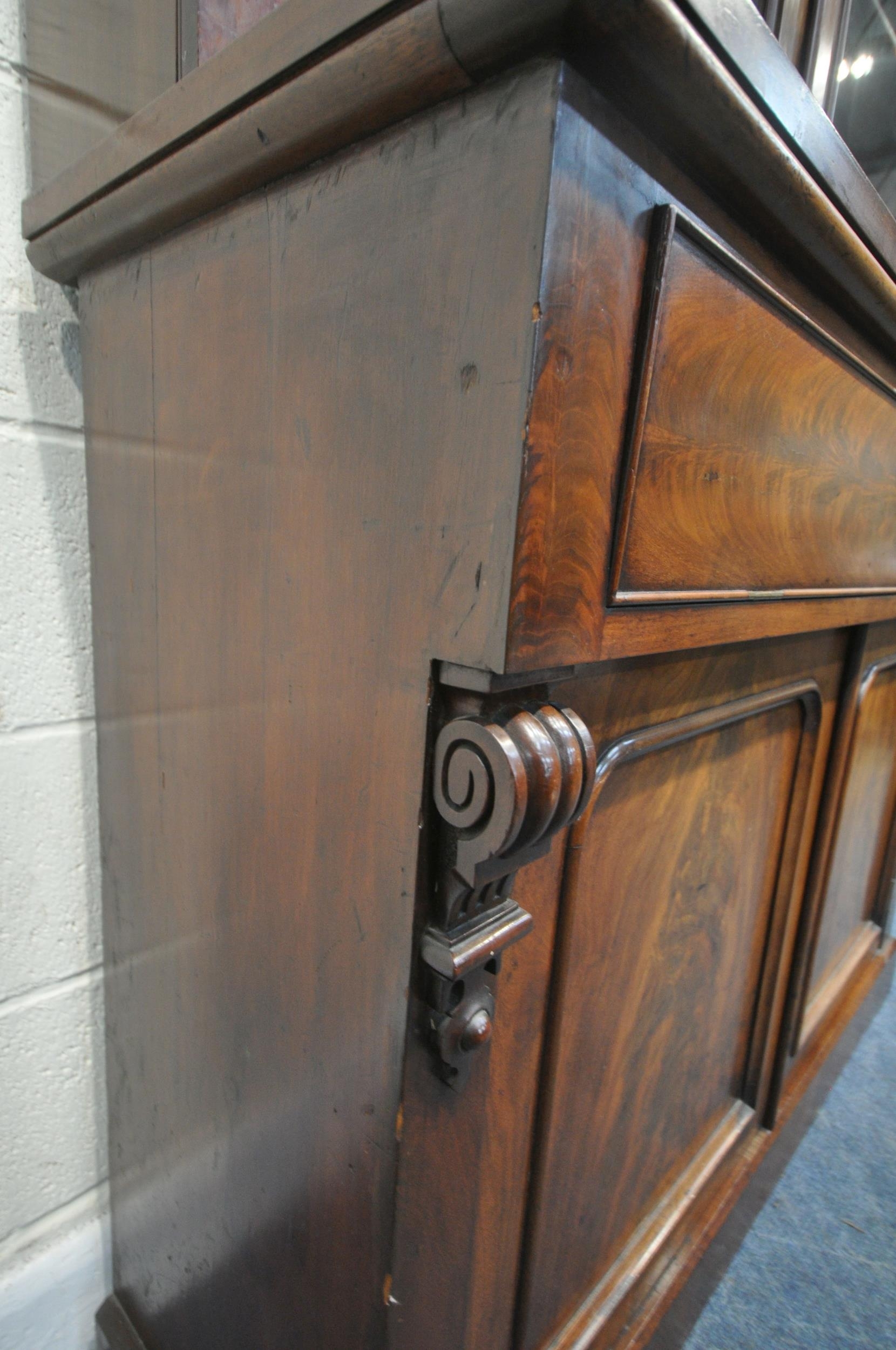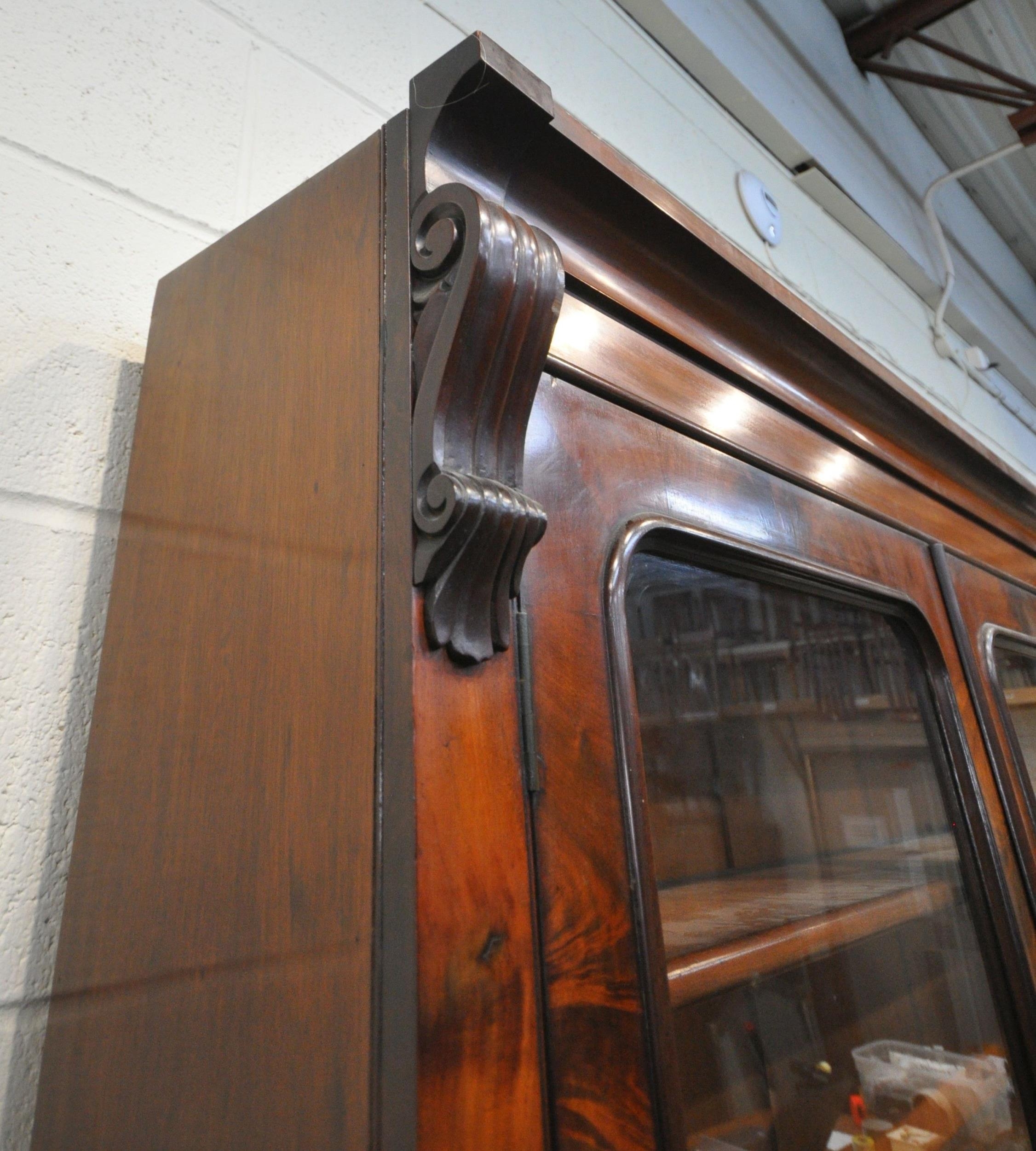 A VICTORIAN MAHOGANY BOOKCASE, the double glass doors enclosing four shelves, atop a base with a fall front door, thats enclosing an arrangement of divisions, over double cupboard doors, width 133cm x depth 43cm x height 236cm x height of base 99cm, condition report: two keys, veneer loss to front right surface, historical signs of usage