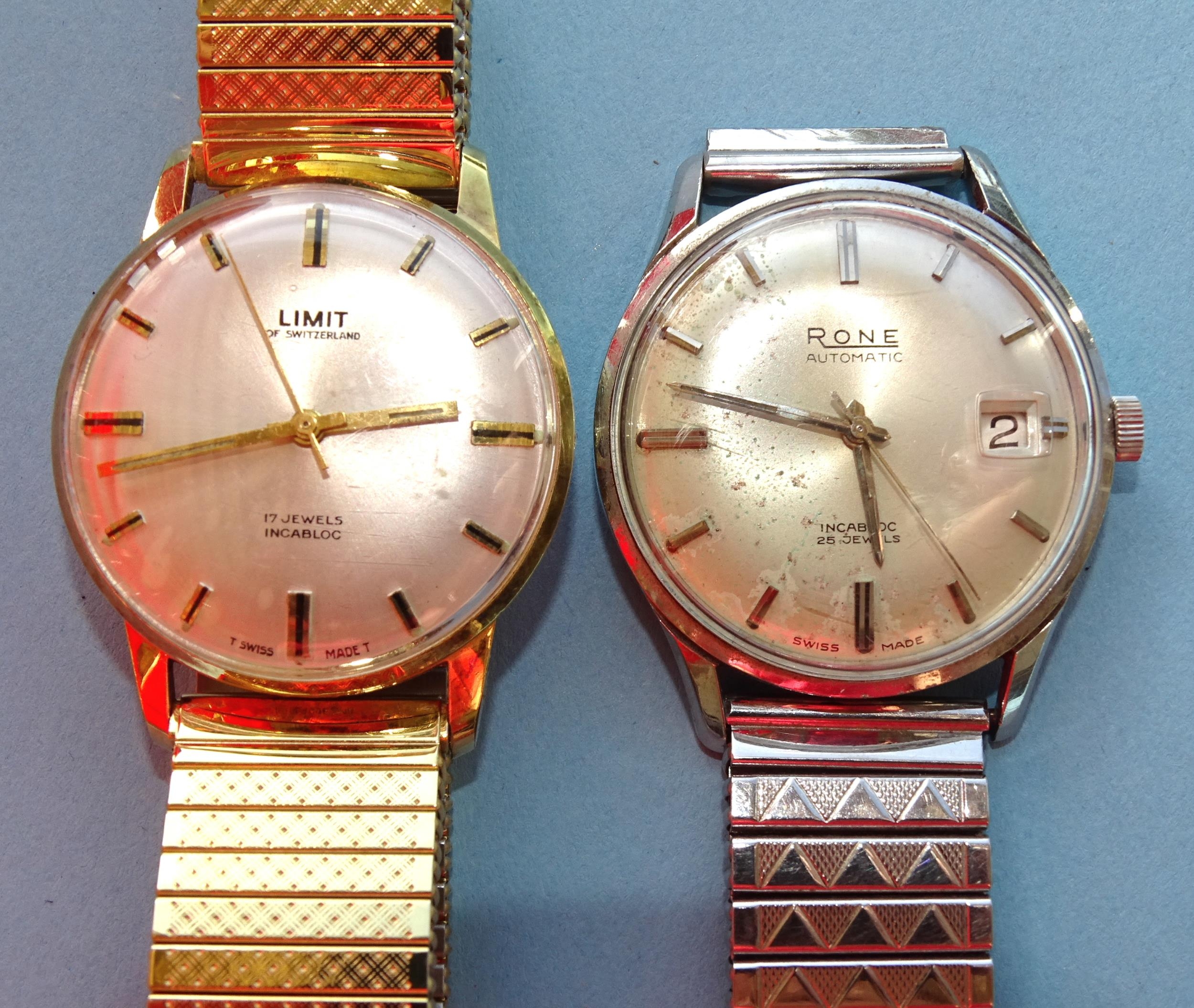 Rone, a gentleman's automatic steel-cased wrist watch, the silvered dial with baton numerals and date aperture and a gent's Limit wrist watch, (crown missing), (2).