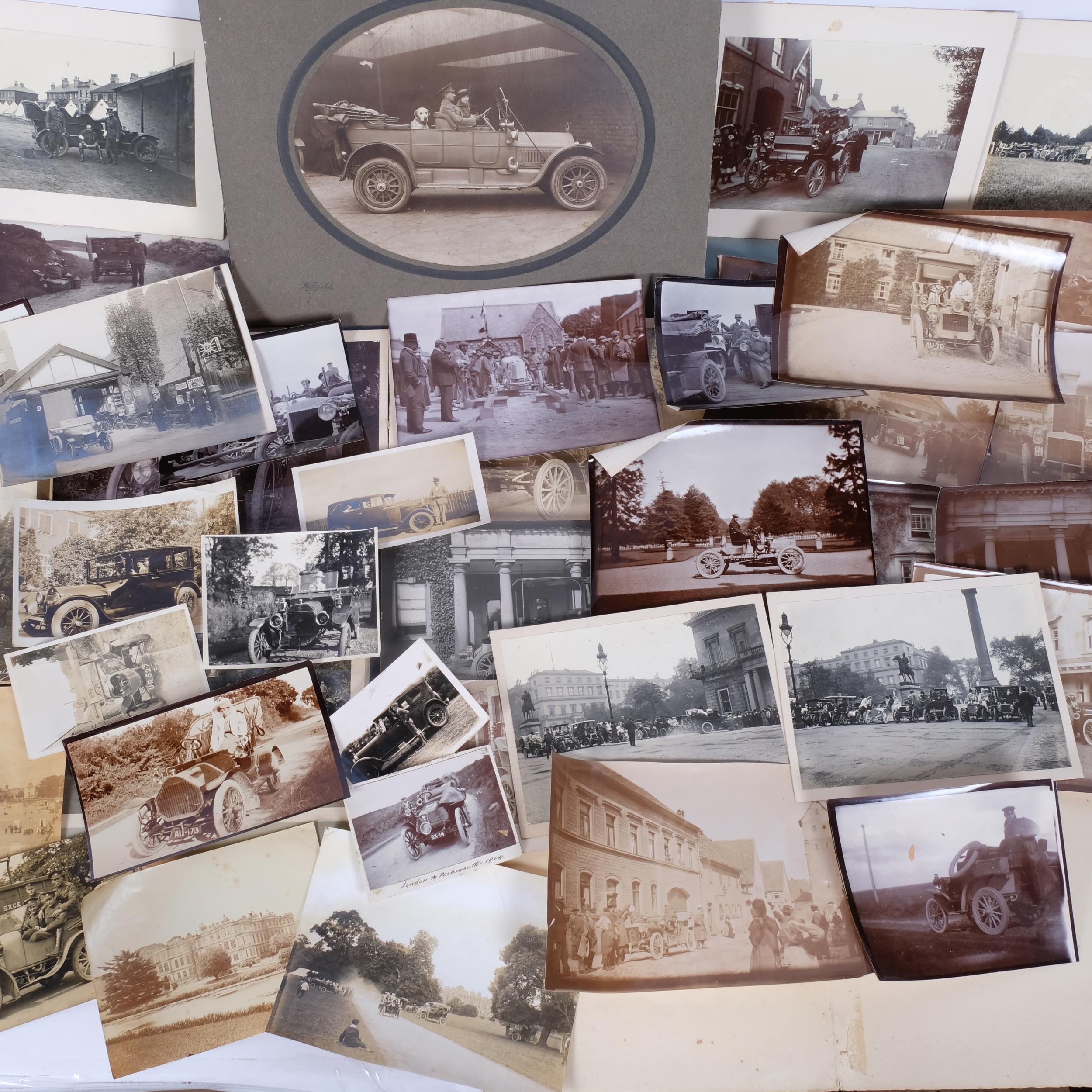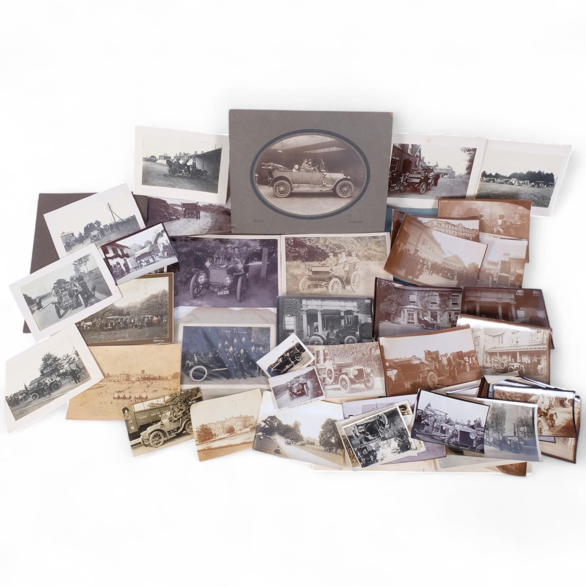 A collection of early 20th century motoring photographs, generally mounted on card, some military, and various loose and unmounted photographs, same subjects