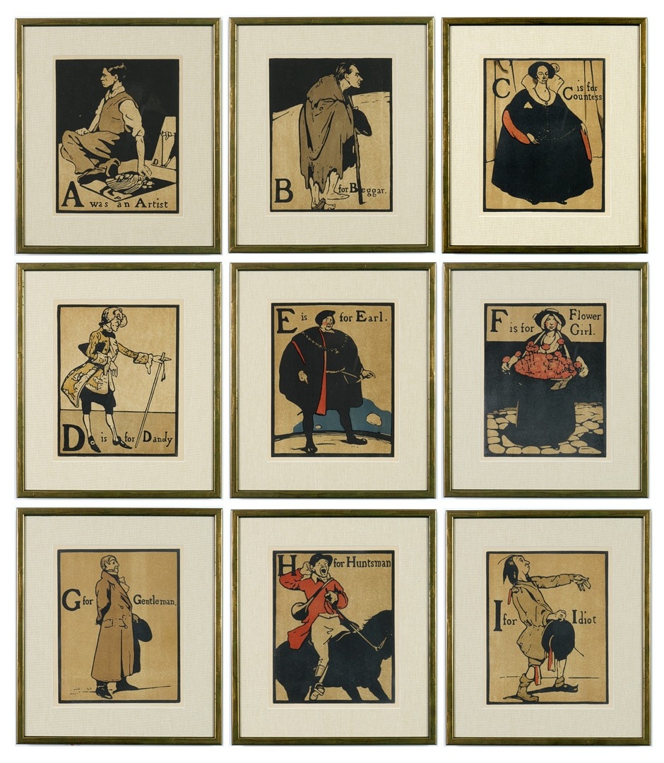 WILLIAM NICHOLSON. A SET OF NINE ALPHABET LITHOGRAPHS. suite: Alphabet series 1898, 24.7cm x 19.8cm.