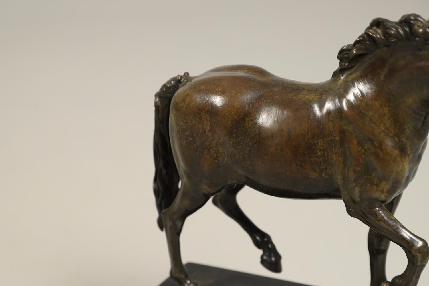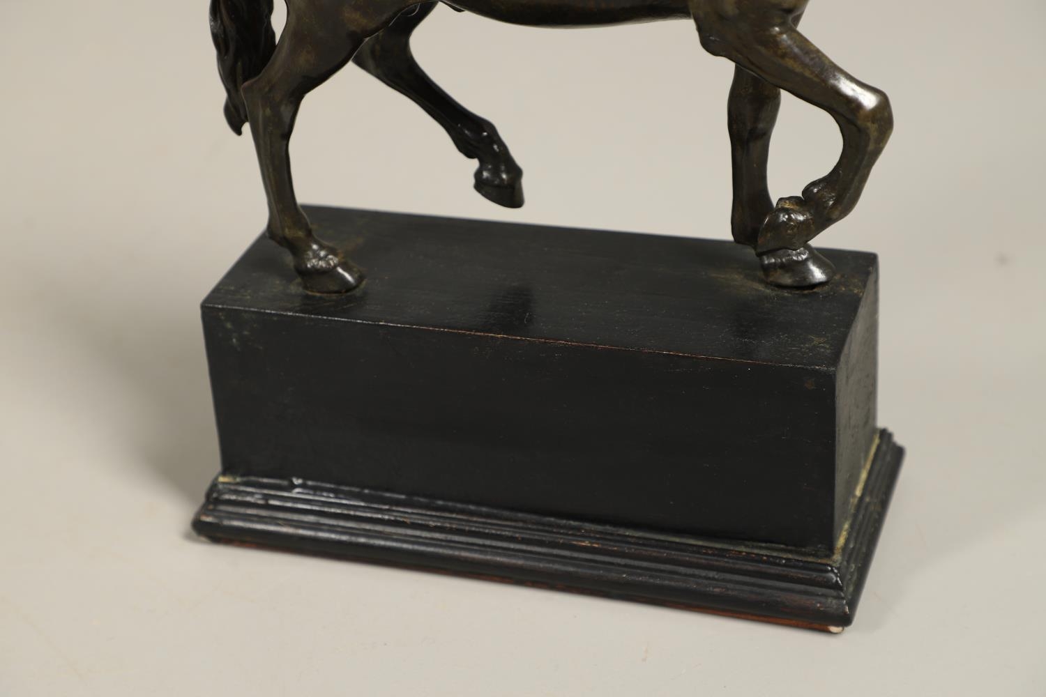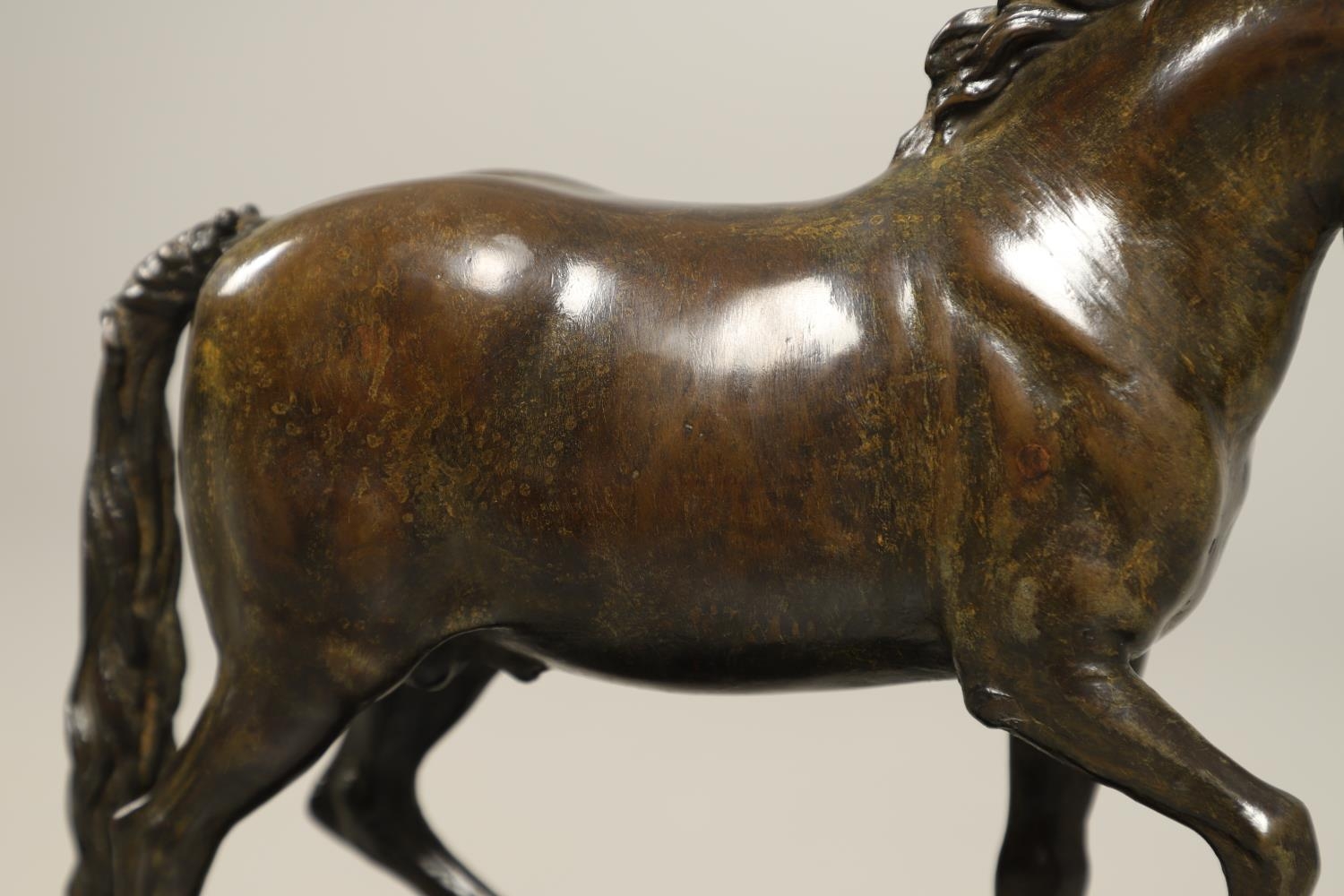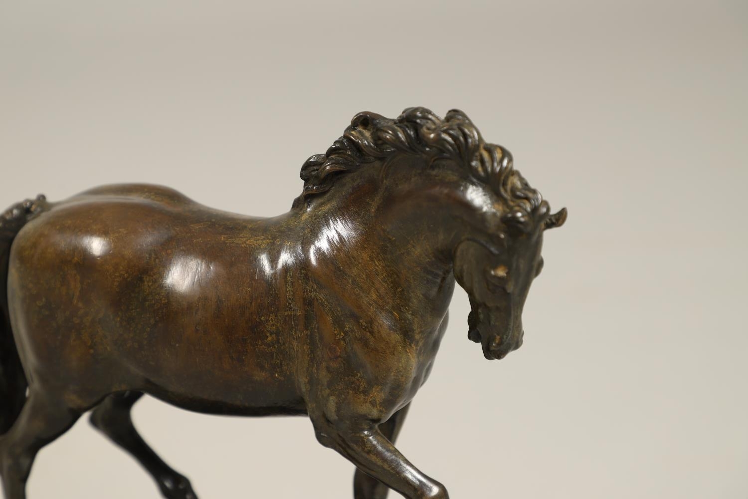AFTER GIAMBOLOGNA (1529-1608), BRONZE OF A PACING HORSE. early 20th century, light brown patina, upon a later wooden plinth, overall height 33cm, overall width 26cm.