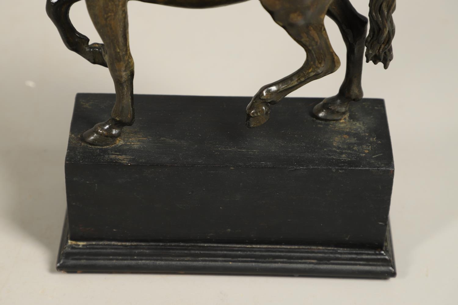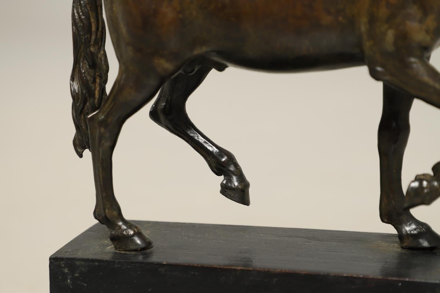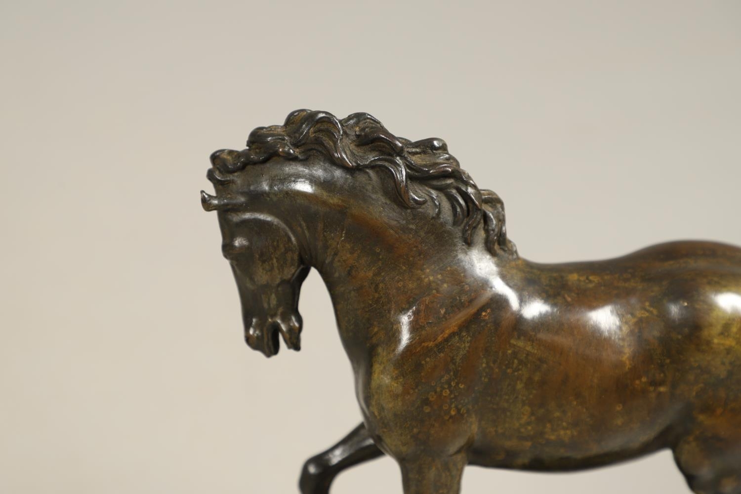 AFTER GIAMBOLOGNA (1529-1608), BRONZE OF A PACING HORSE. early 20th century, light brown patina, upon a later wooden plinth, overall height 33cm, overall width 26cm.