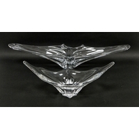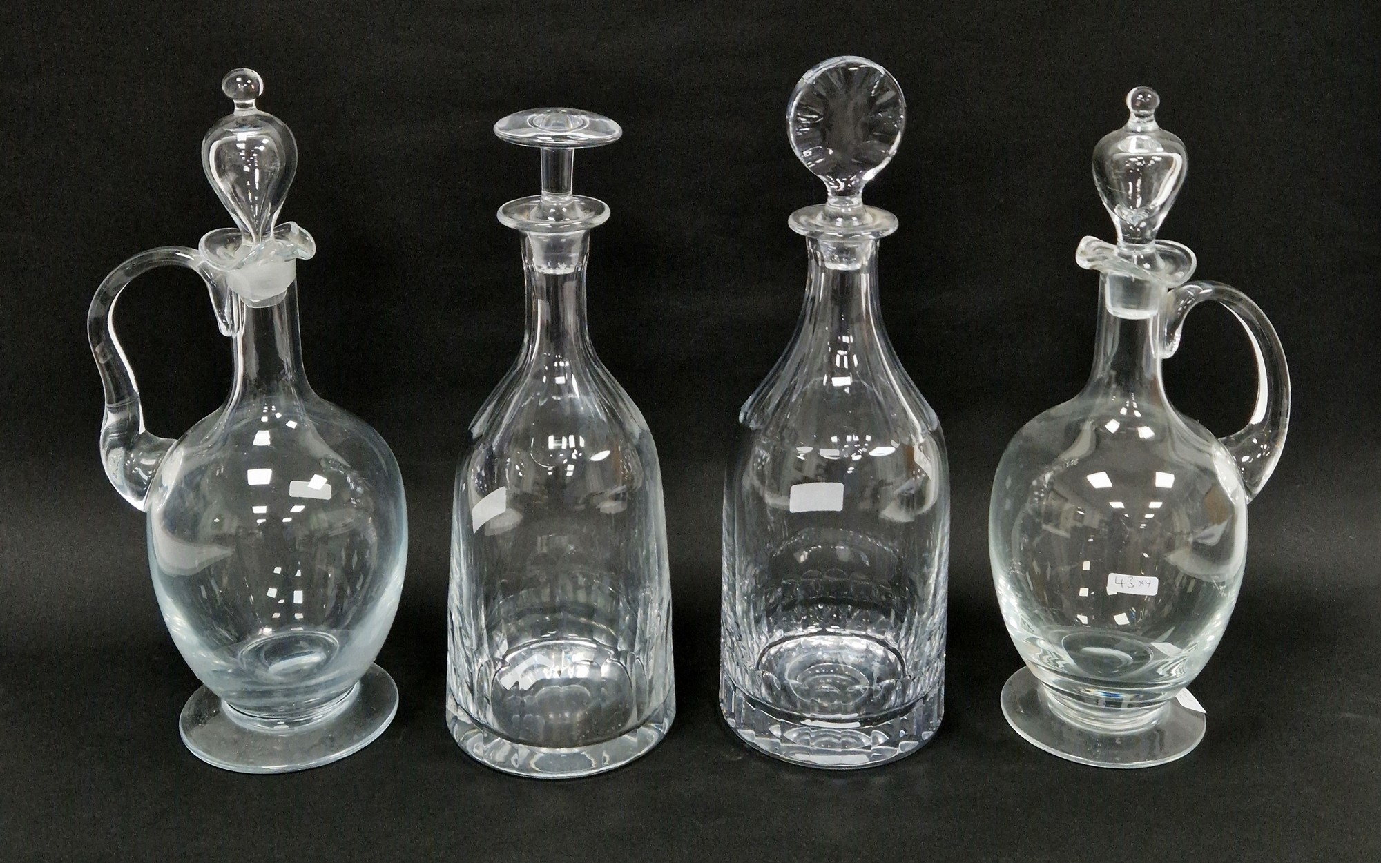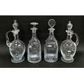 Ralph Lauren cut glass decanter with a faceted compressed bullseye stopper and a William Yeoward example similar with compressed mushroom stopper, etched marks together with two oviform carafes with tear-shaped stoppers, tallest 39cm high (4)