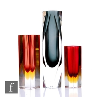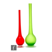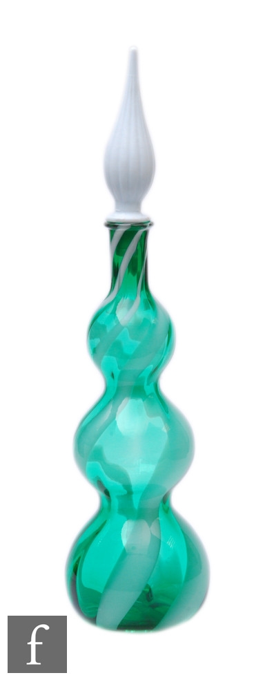 Cristalleria Artistica Toscana - A mid 20th Century Italian Empoli decorative glass decanter of triple gourd form with optic ribbing and tall collar neck, decorated with spiralling white stripes over a green ground and cased in clear, complete with white fluted spire stopper, height 58cm.