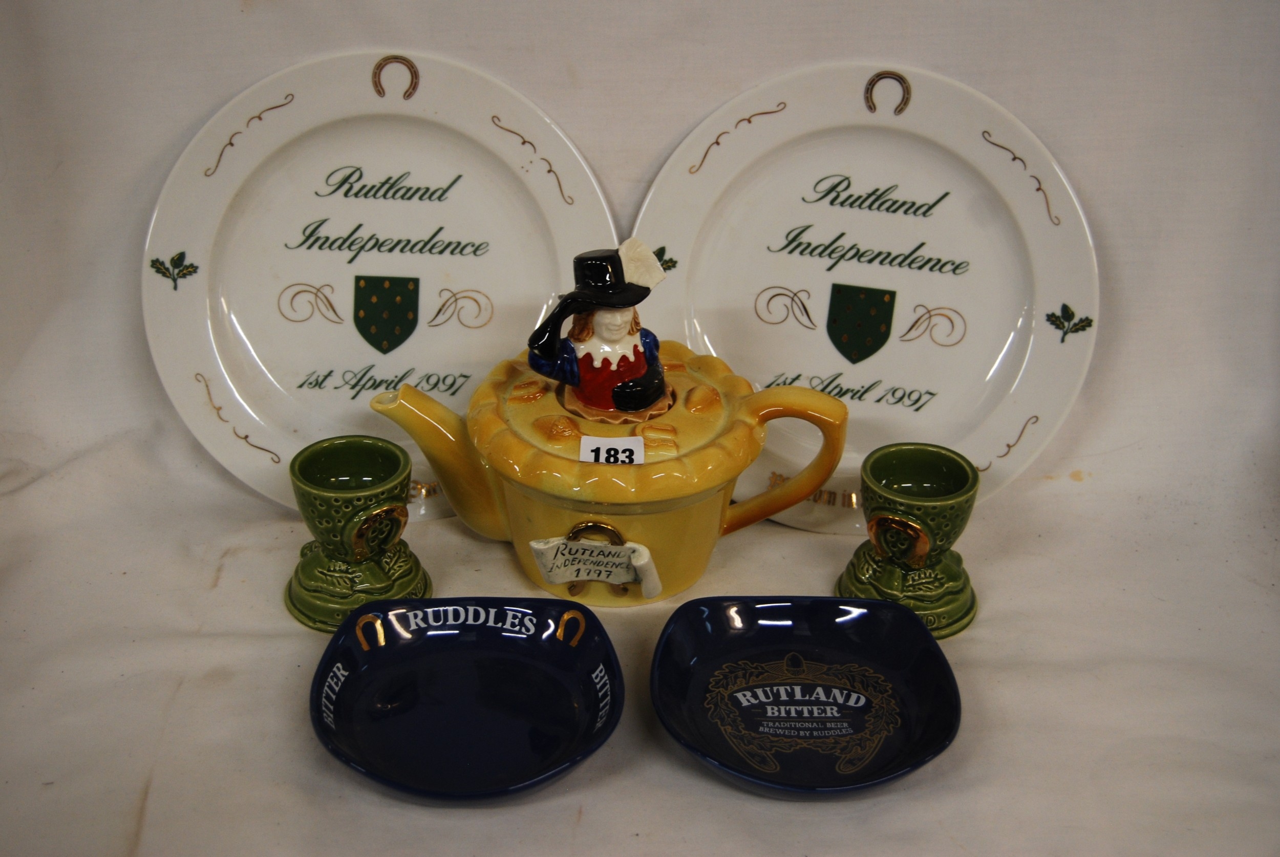 RUTLAND INDEPENDENCE 1997 COMMEMORATIVE TEAPOT, PAIR OF RUTLAND EGG CUPS, 2 RUTLAND DISHES AND TWO 1977 RUTLAND COMMEMORATIVE PLATES