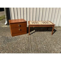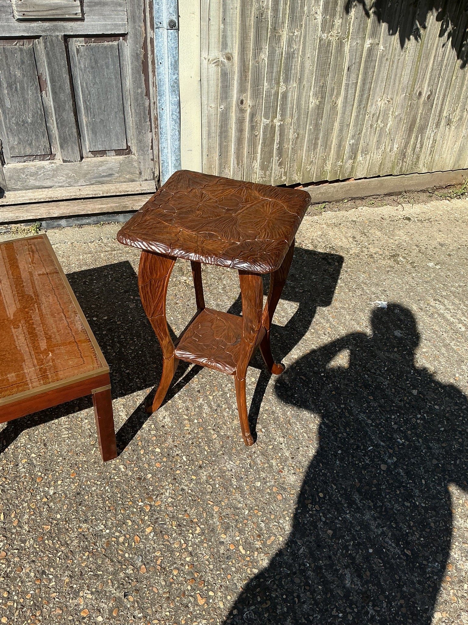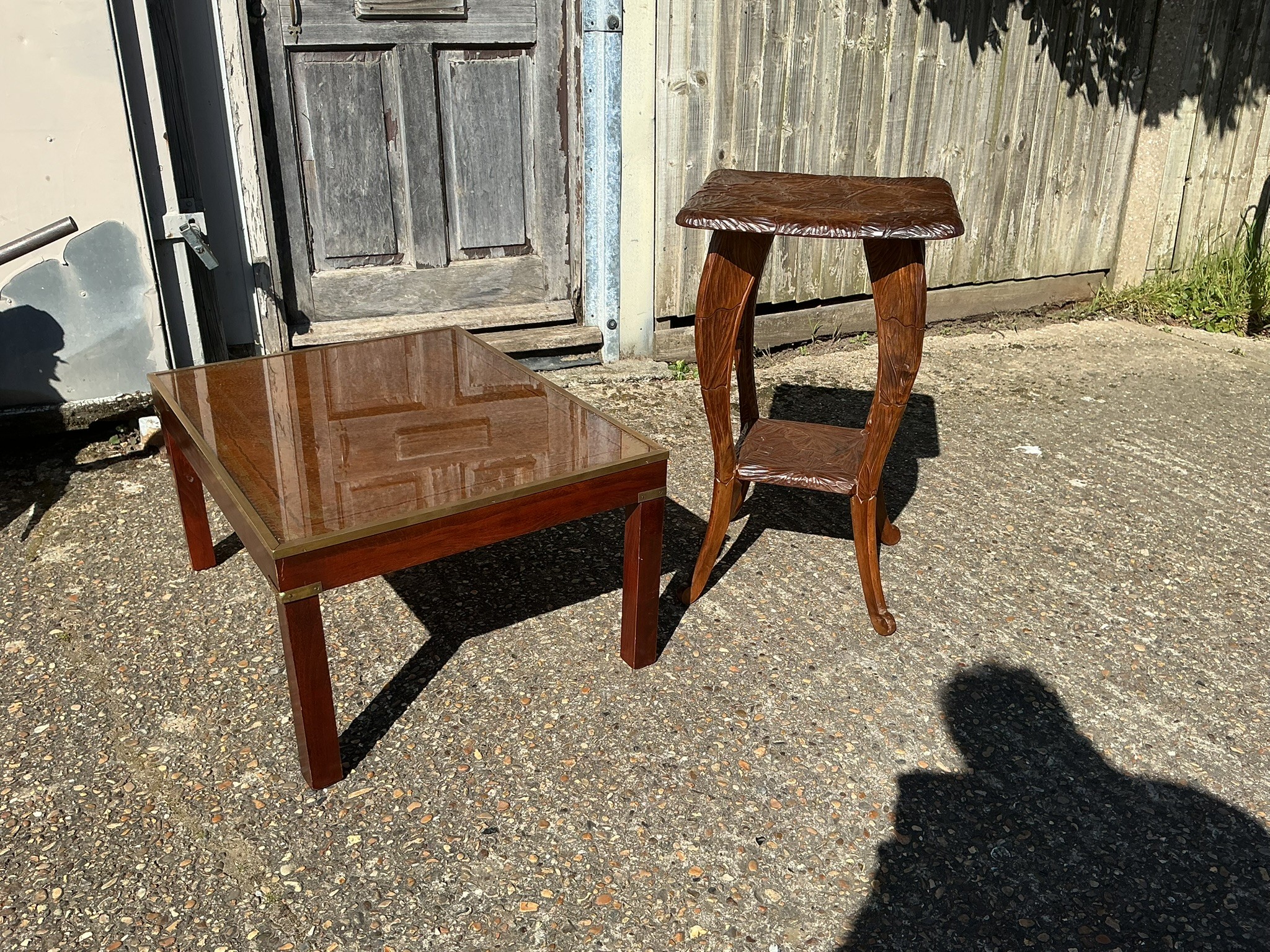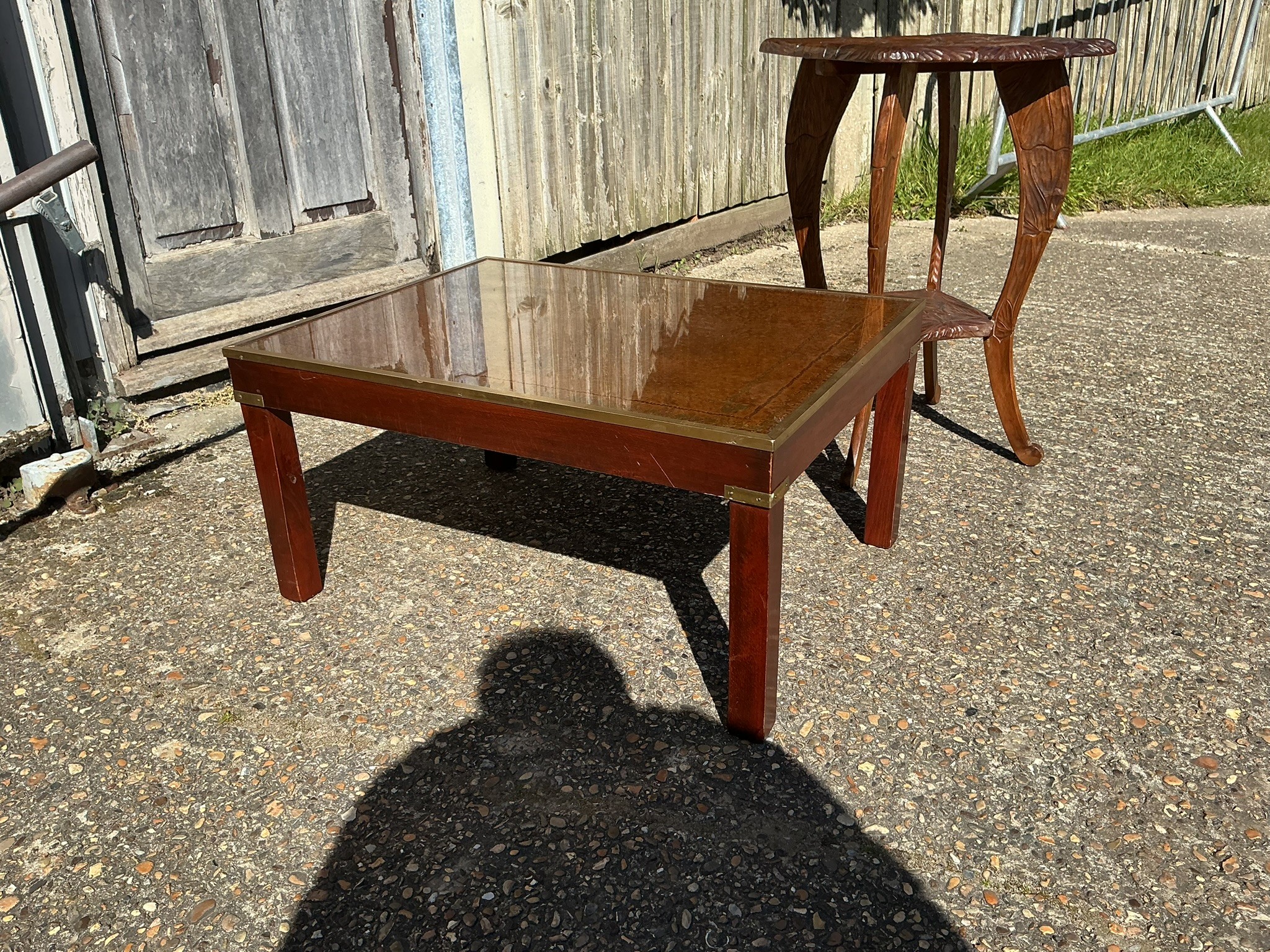 A carved oak occasional table together with a reproduction military style coffee table