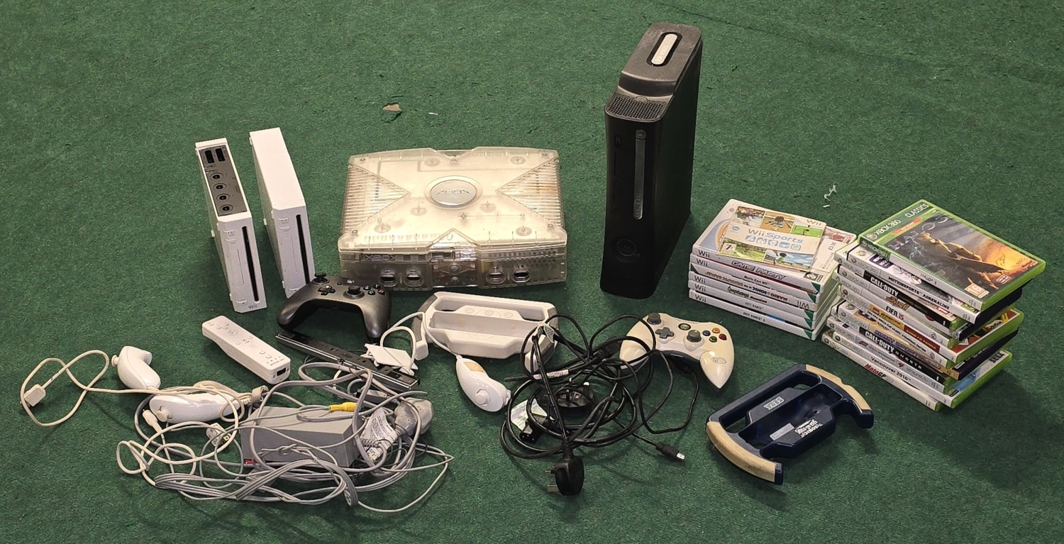 Large collection of mixed games consoles, games, controllers and accessories to include Wii and Xbox.