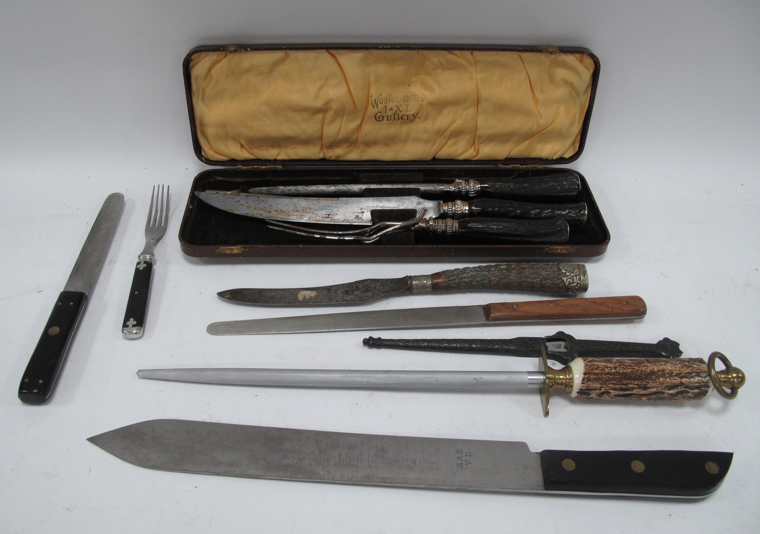 Wostenholm XL German Carving Set in Fitted Case, other carving knives, letter opener etc:- One Tray.