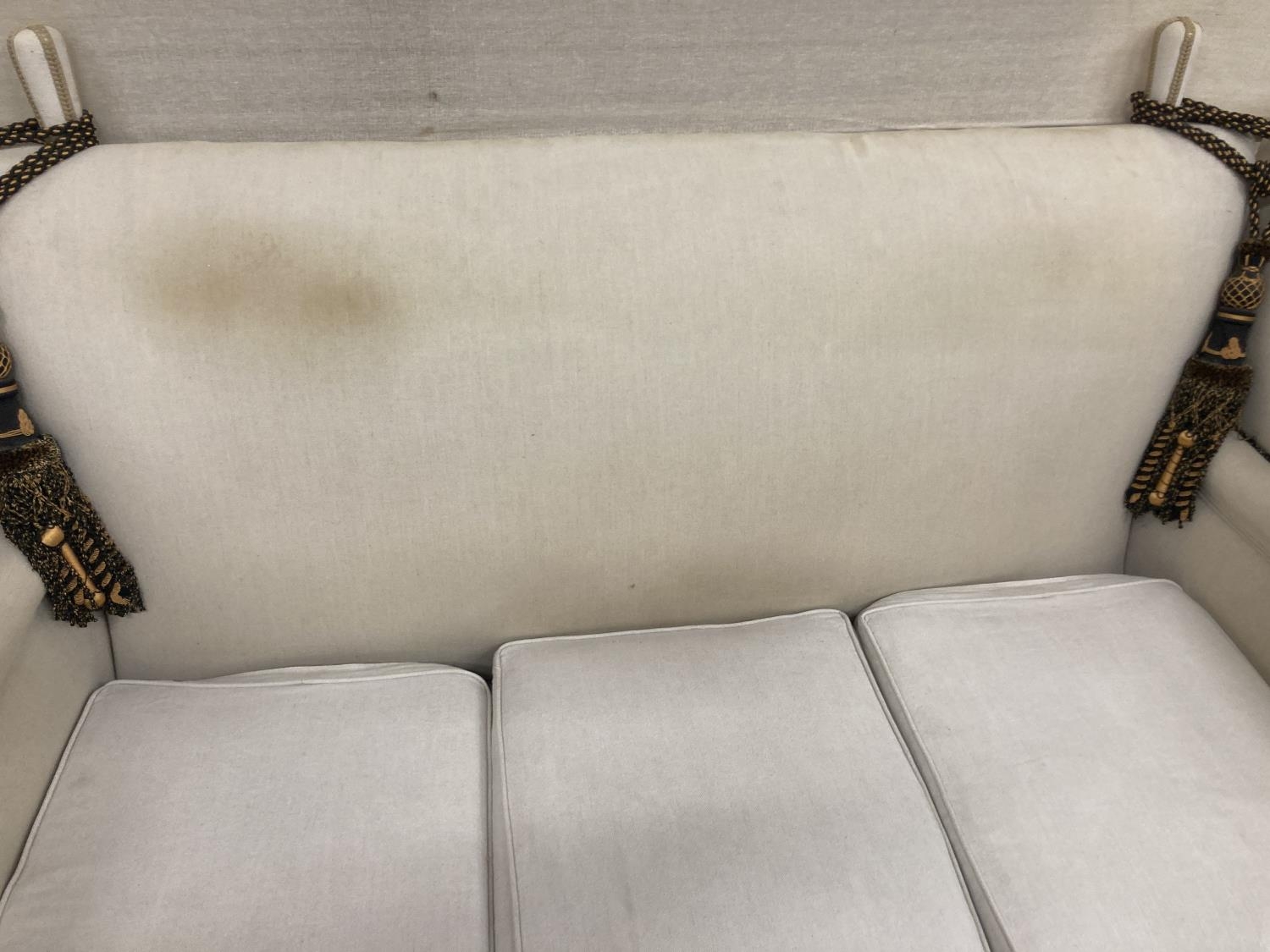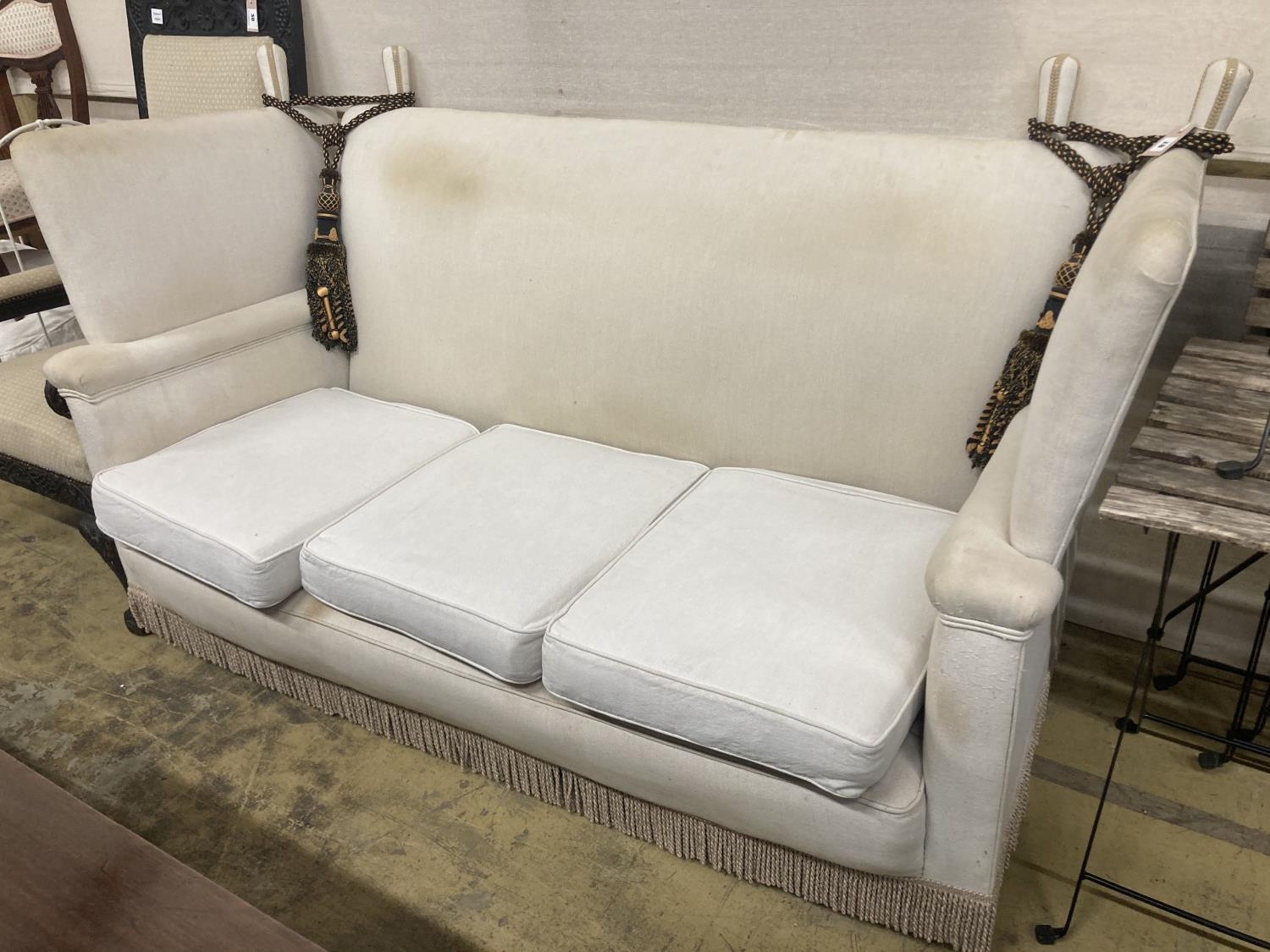 An upholstered Knowle settee, length 184cm, depth 80cm, height 104cm