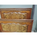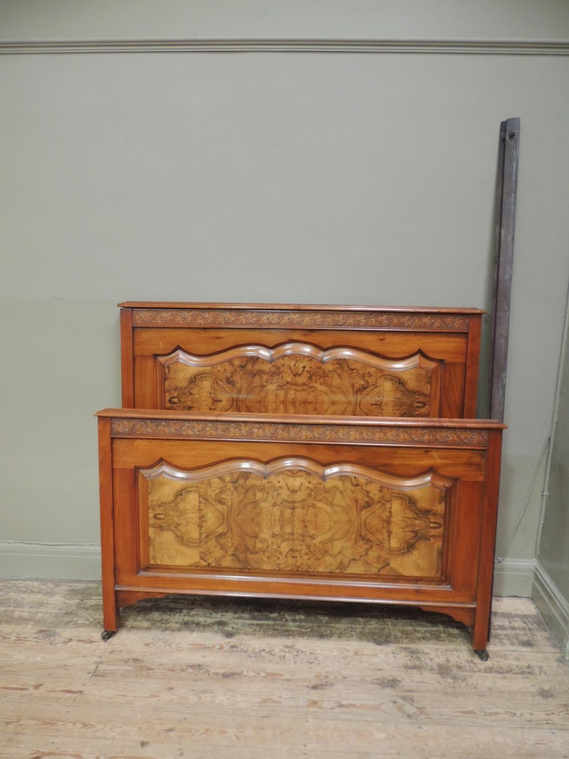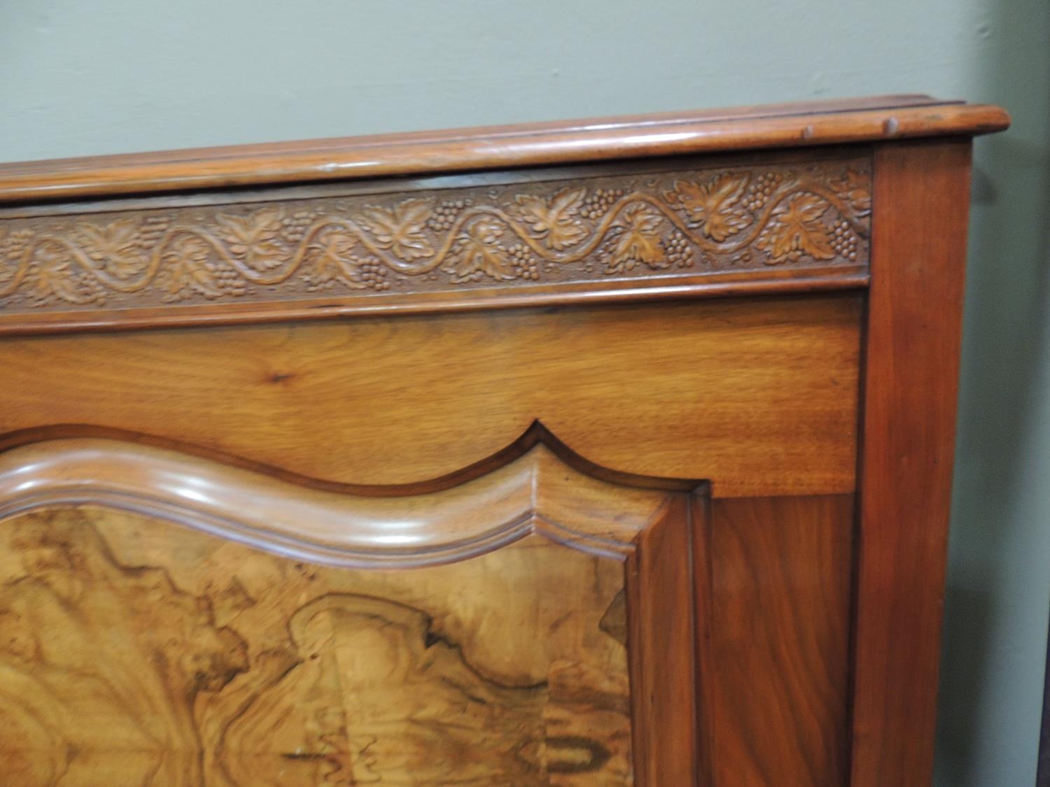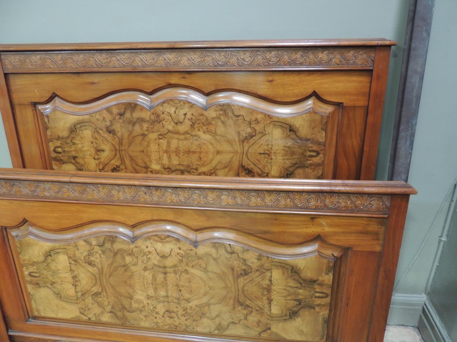 A Victorian walnut double bedstead with grape and leaf carved frieze, figured panel under the foot board conforming, 140cm wide
