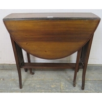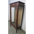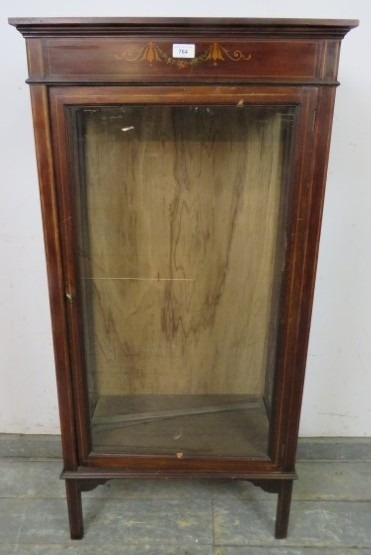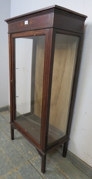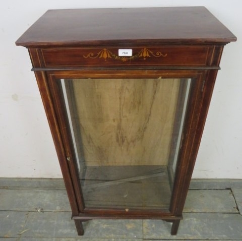 An Edwardian mahogany glazed display cabinet of small proportions, satinwood strung and with marquetry inlay, having two loose shelves, on square supports.