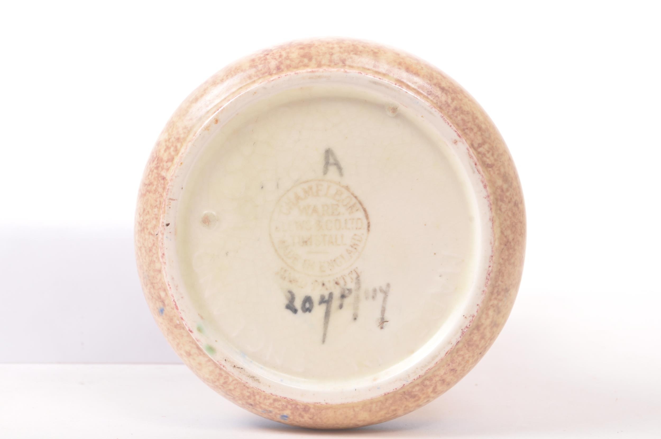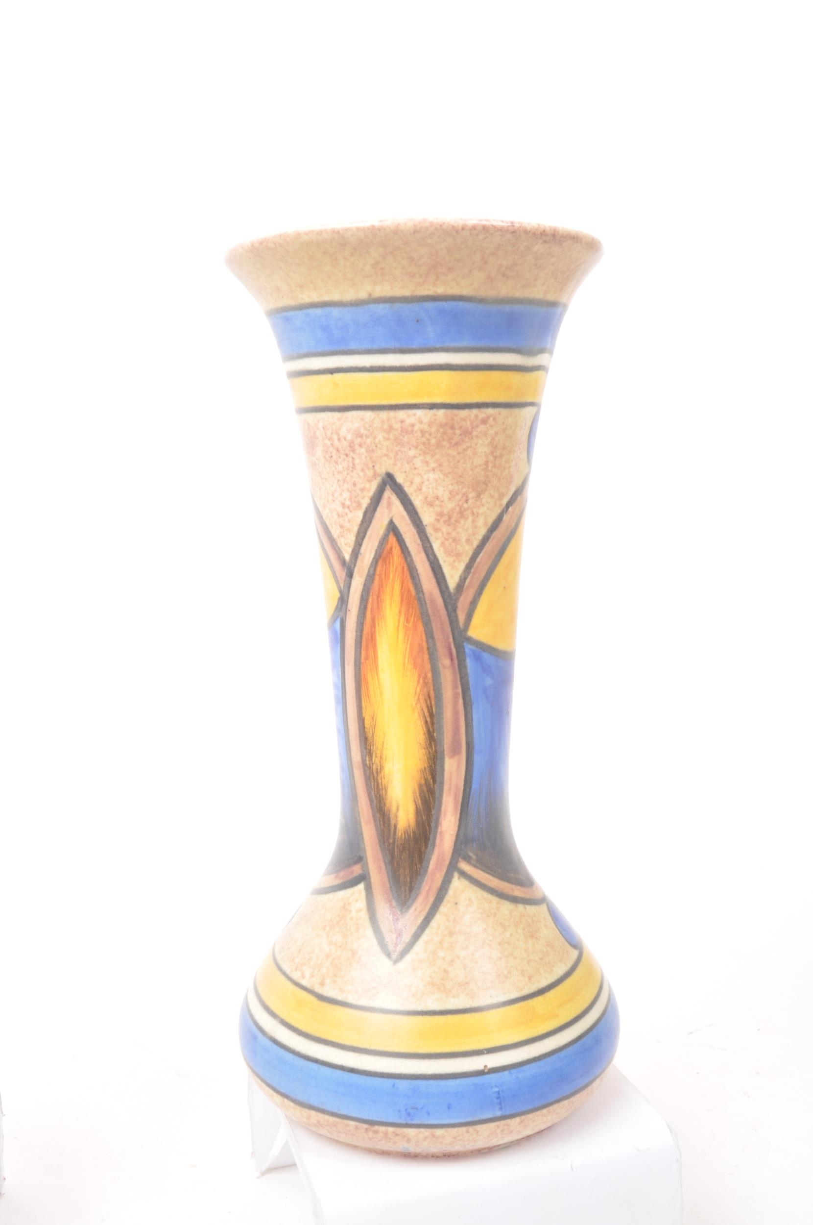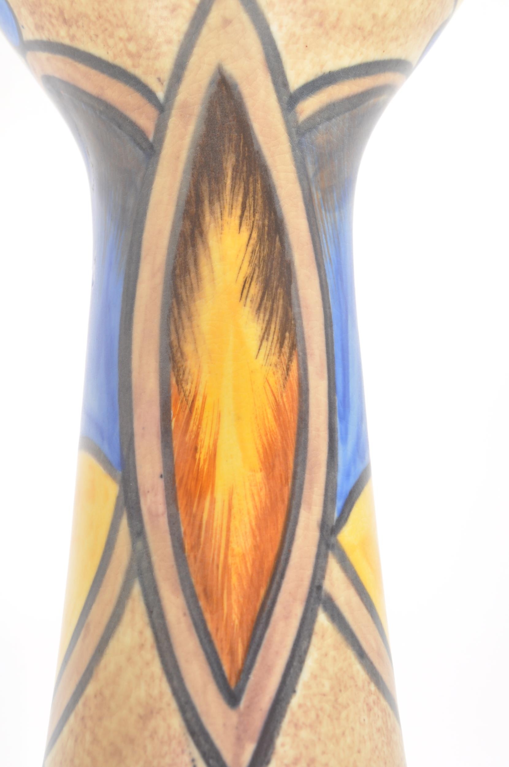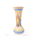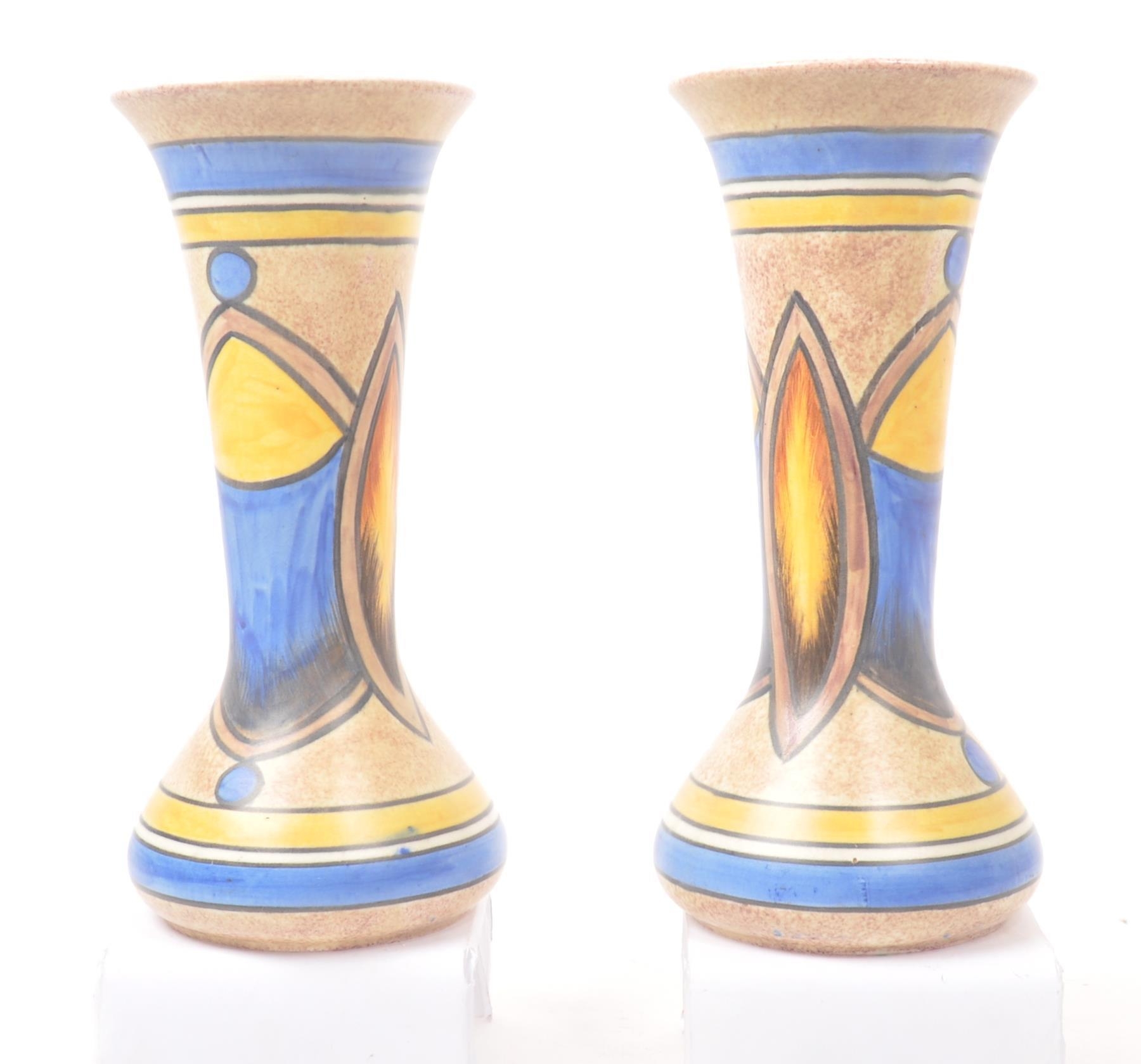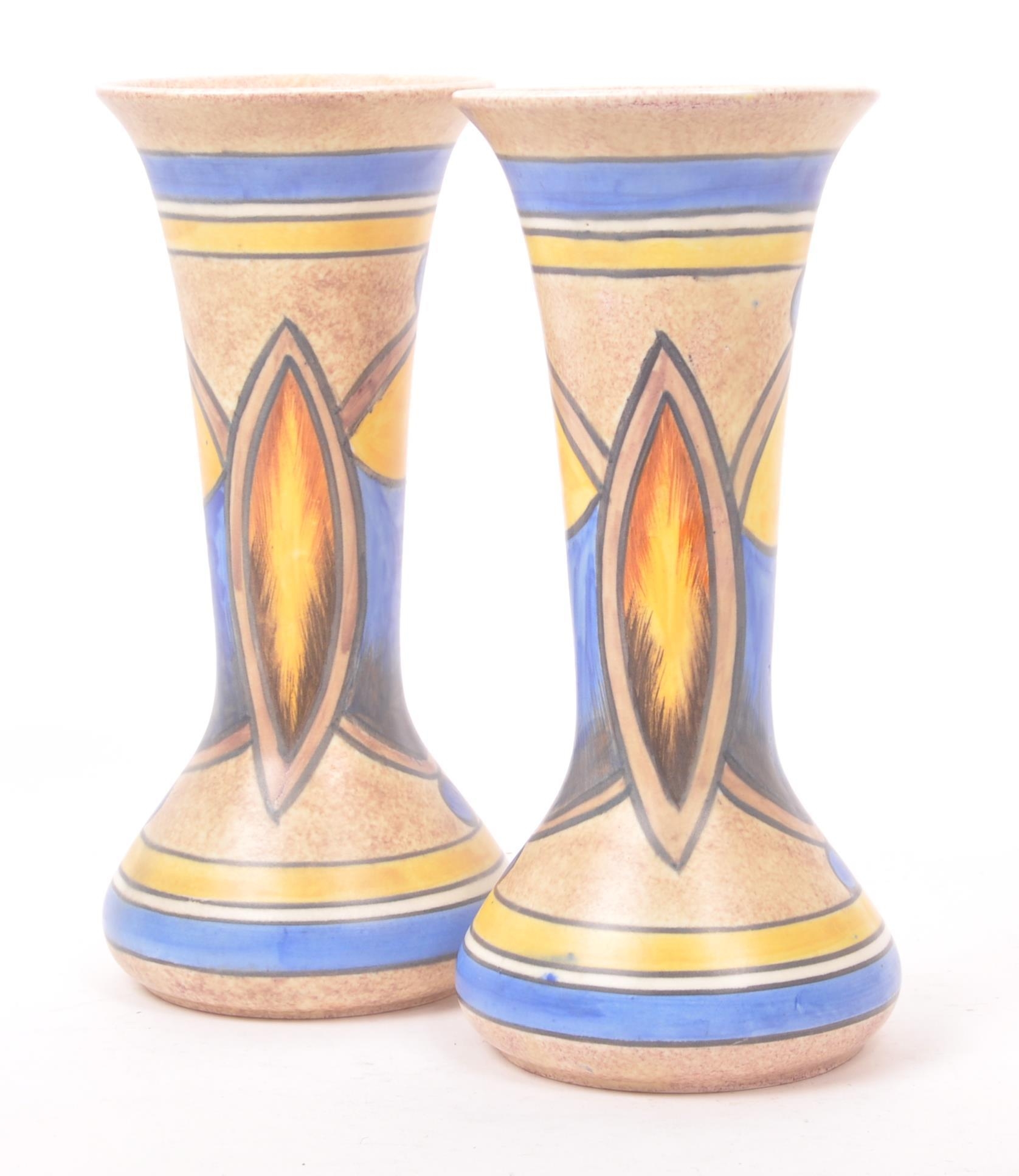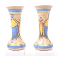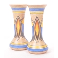 Clews & Co Ltd of Tunstall, Chameleon Ware - A pair of mid 20th century ceramic pottery table top vases. Having a flared top into a tapering neck with flat bottom circular bases. With earthly tones and broad strokes. Measures approx. 24cm