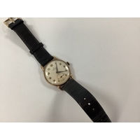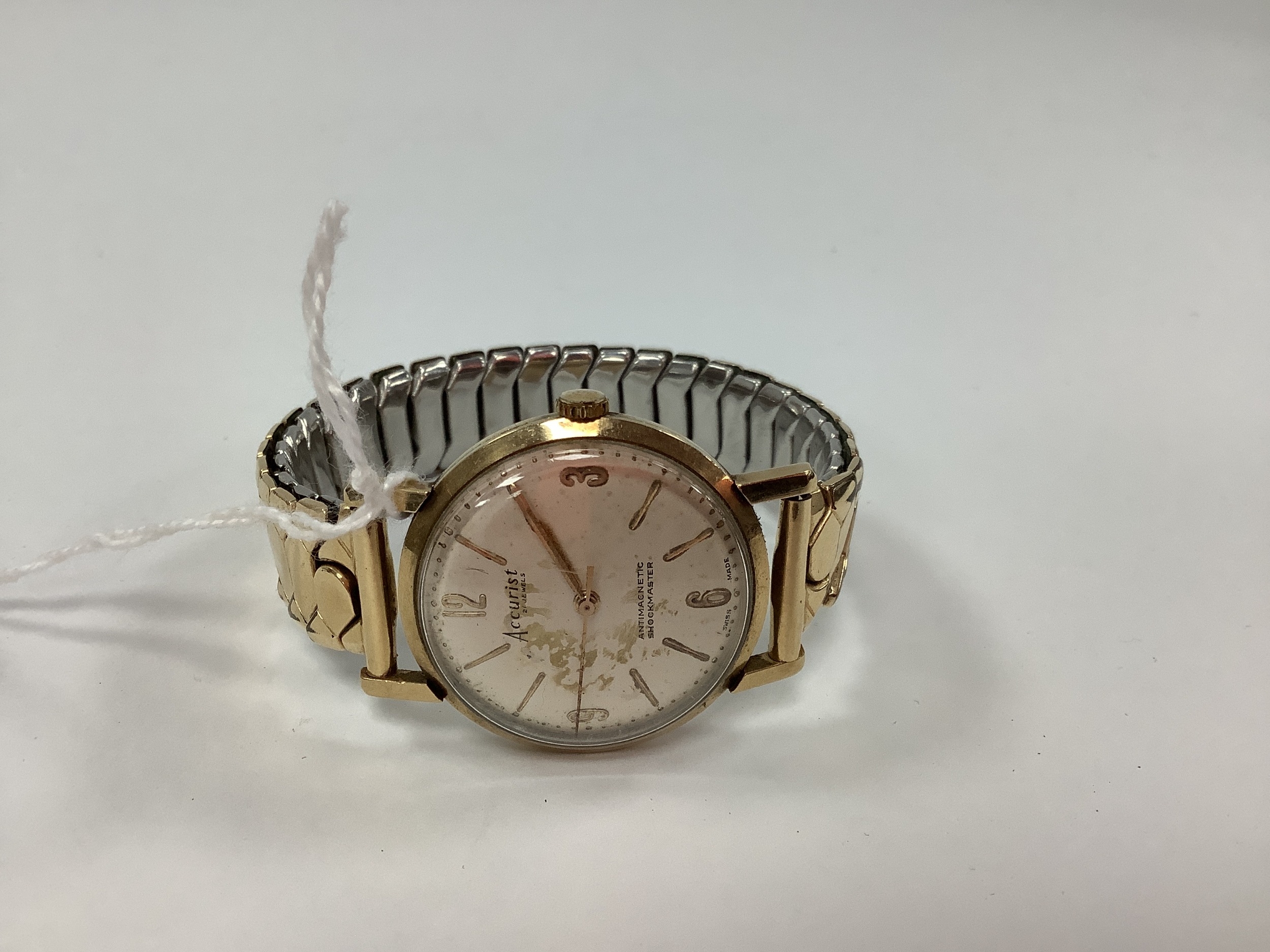 Accurist; A Gent's 9ct Gold Cased Wristwatch, the circular signed dial with Arabic numerals and line markers, 'Antimagnetic Shockmaster', with centre seconds, within plain 9ct gold case, hallmarked 1961 inside caseback, 72586, with signed gilt movement, to later added expanding bracelet.