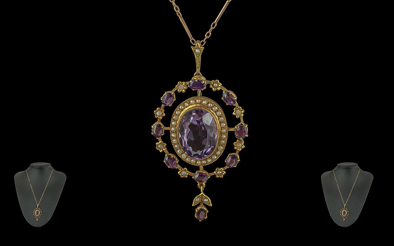 Late Victorian Period Pleasing Quality Ladies 9ct Gold Open worked Pendant Drop Set with Amethysts and Seed Pearls, Excellent Design, Brushed 18ct Gold Finish with Attached 9ct Gold Chain. The Large Amethyst of Excellent Colour, Est Weight 8.00 cts, Length 24 Inches - 60 cms. Weight 12.7 grams.