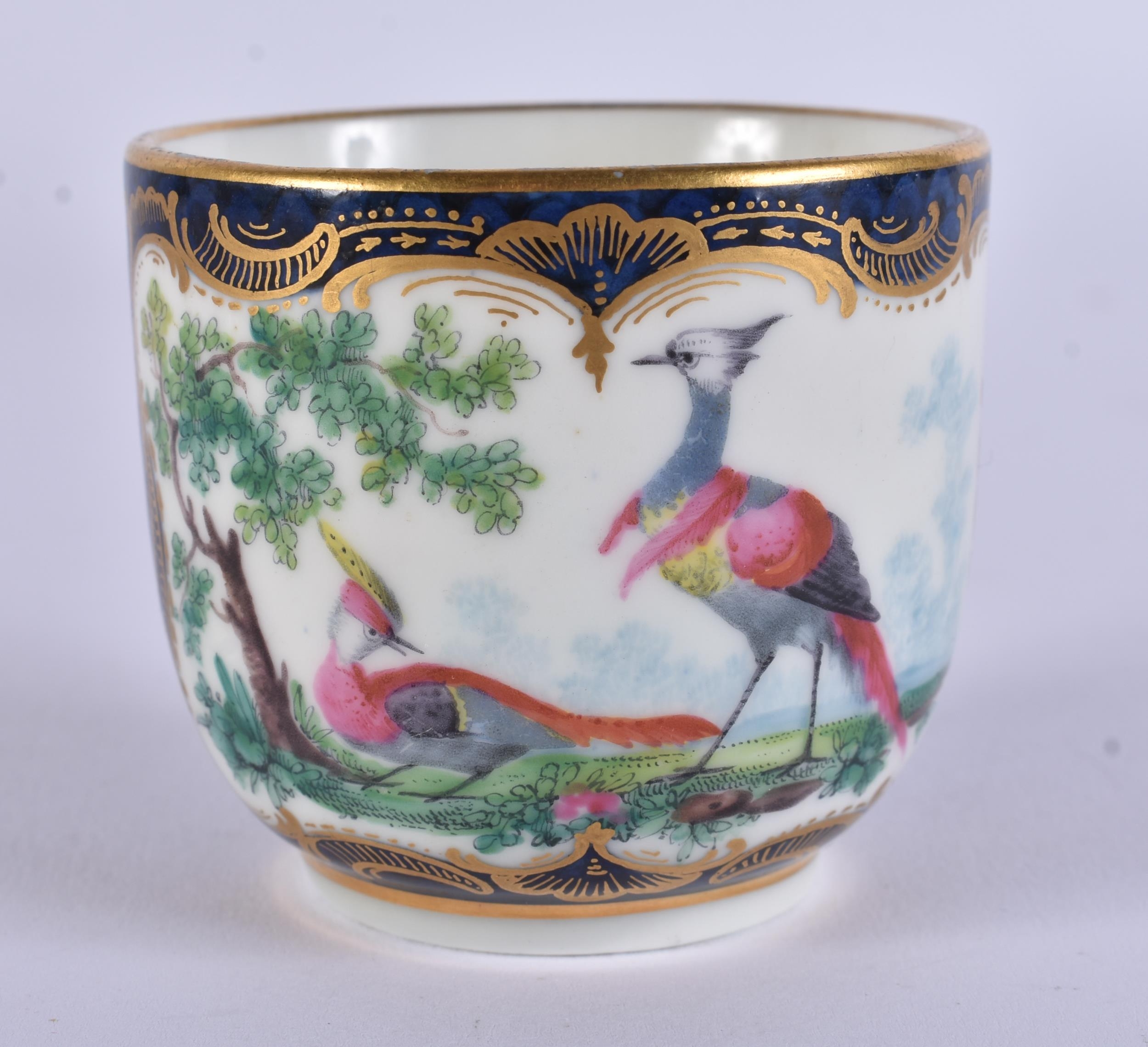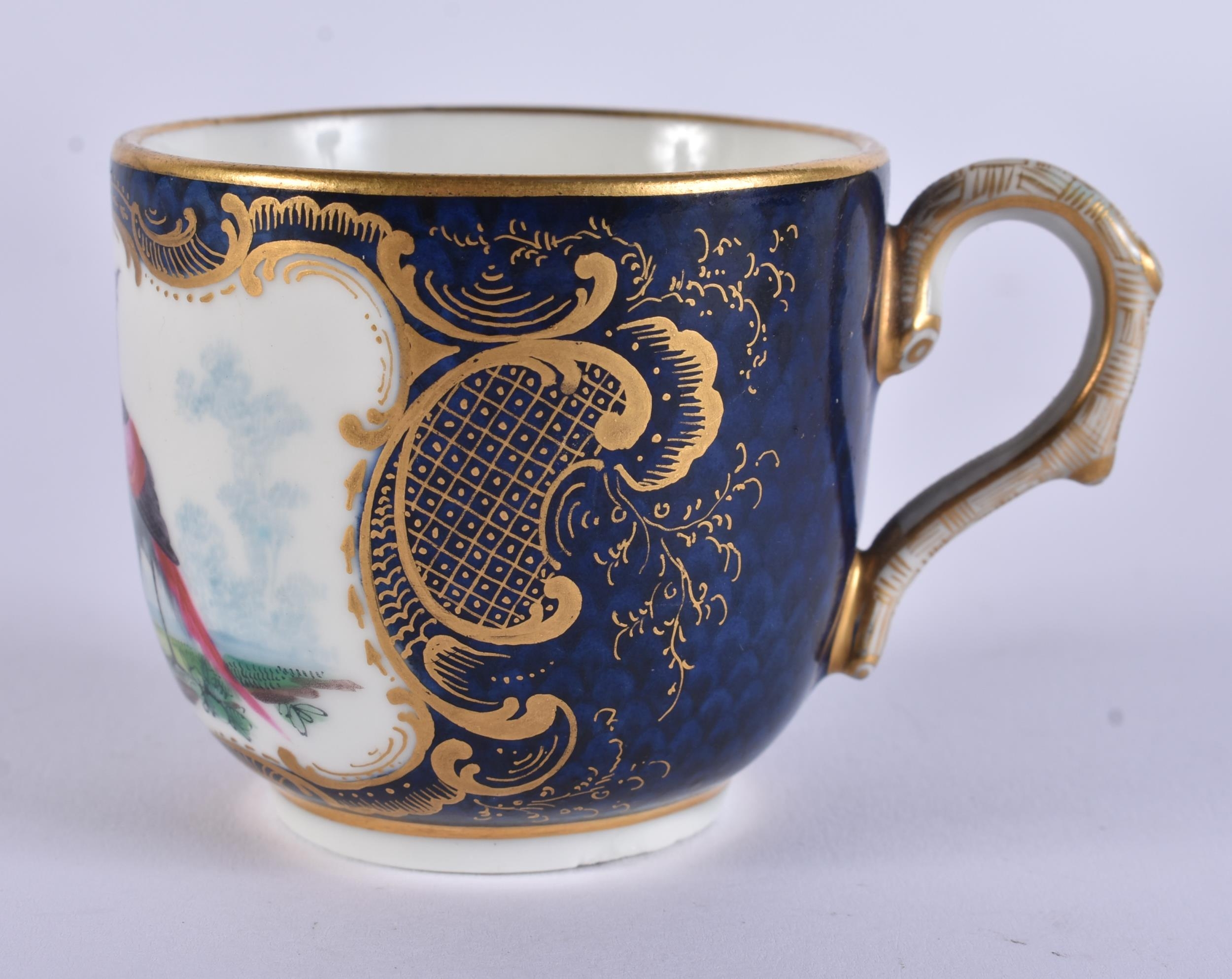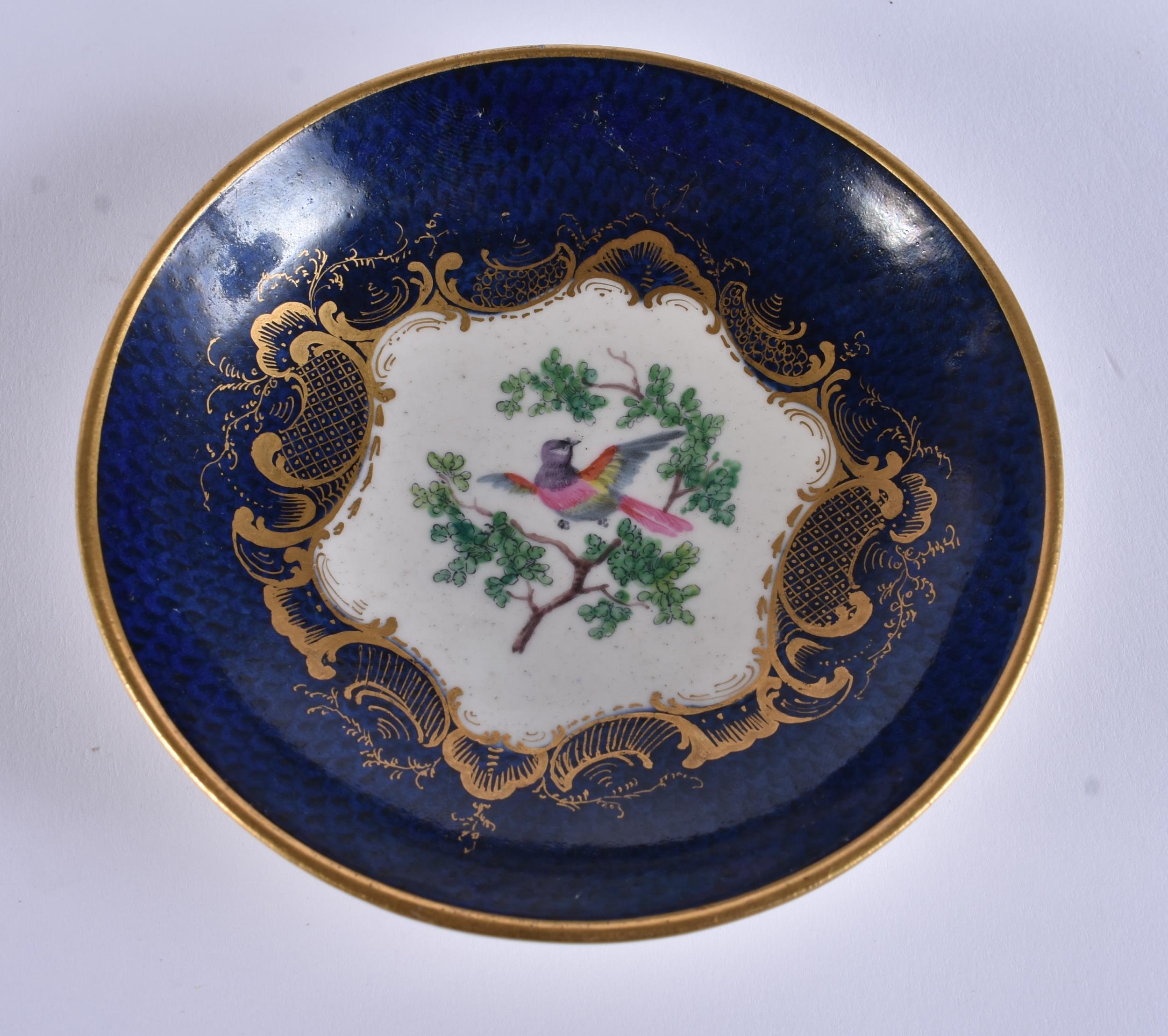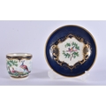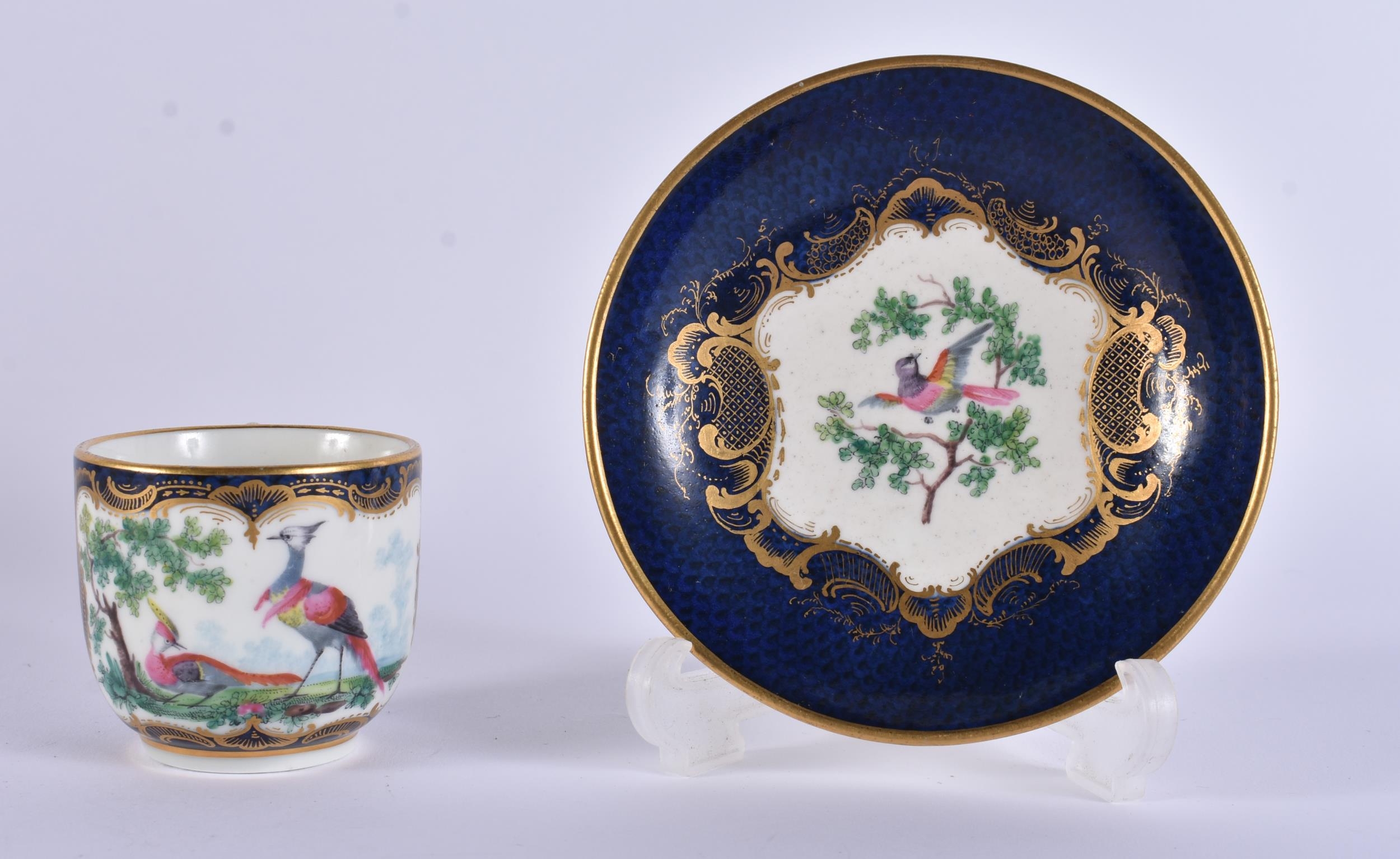 AN EXTREMELY RARE 18TH CENTURY FRENCH VINCENNES PORCELAIN CUP AND SAUCER painted with blue scale birds. 10 cm diameter. (2) Note: See the Wallace collection for a very similar cup and saucer.