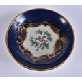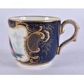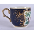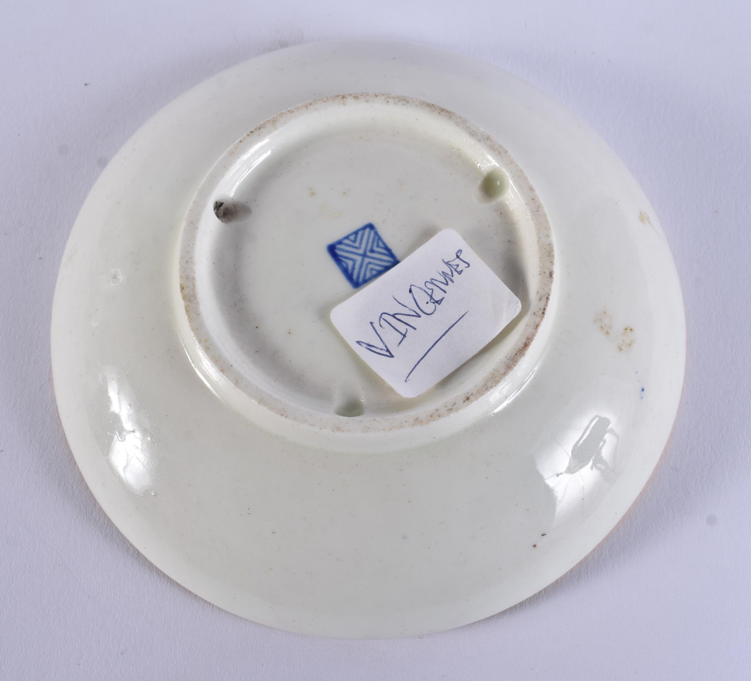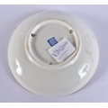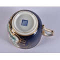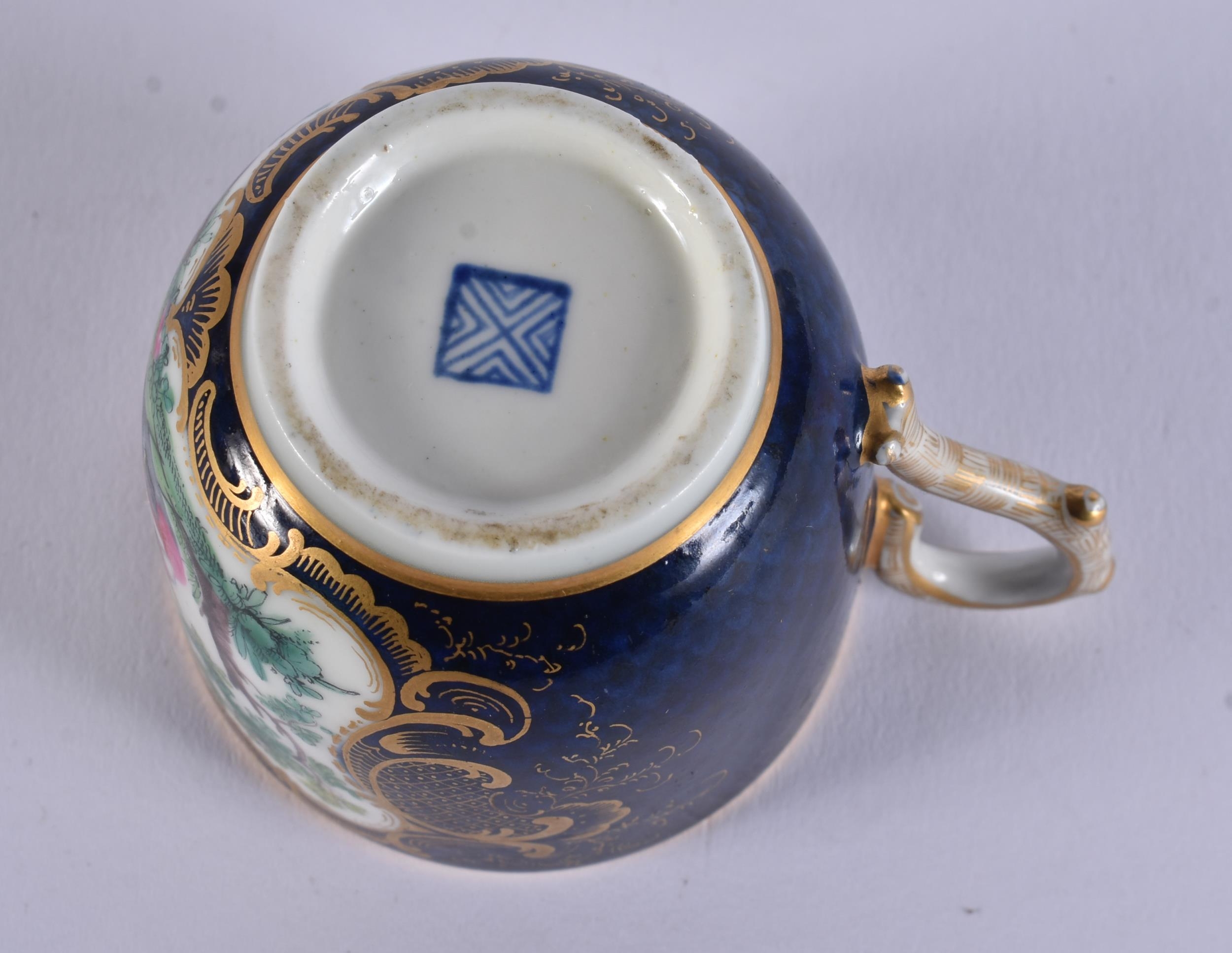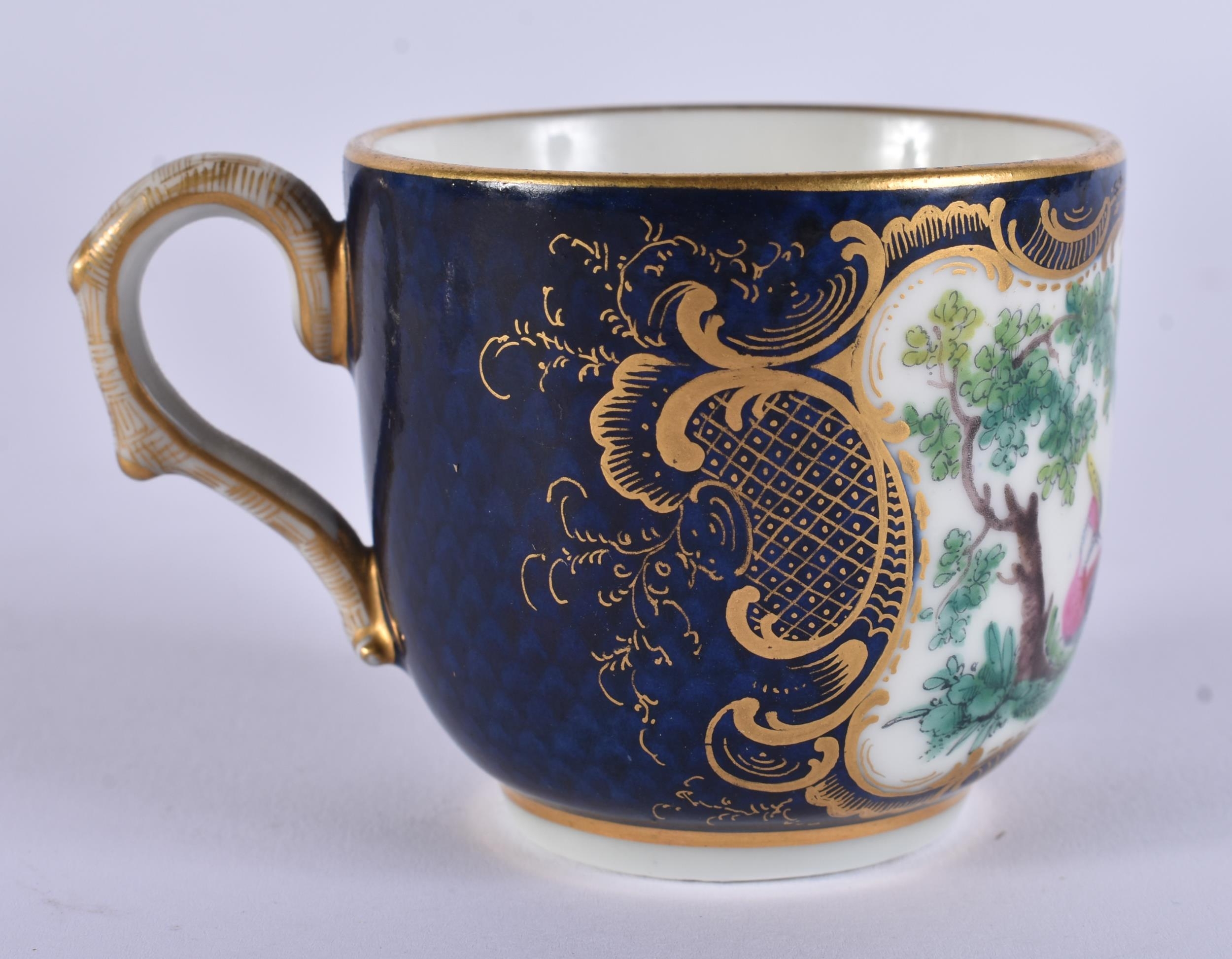 AN EXTREMELY RARE 18TH CENTURY FRENCH VINCENNES PORCELAIN CUP AND SAUCER painted with blue scale birds. 10 cm diameter. (2) Note: See the Wallace collection for a very similar cup and saucer.