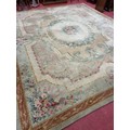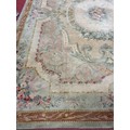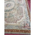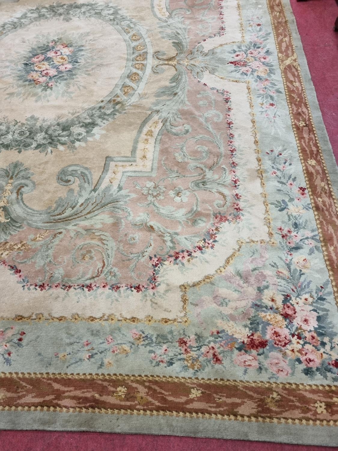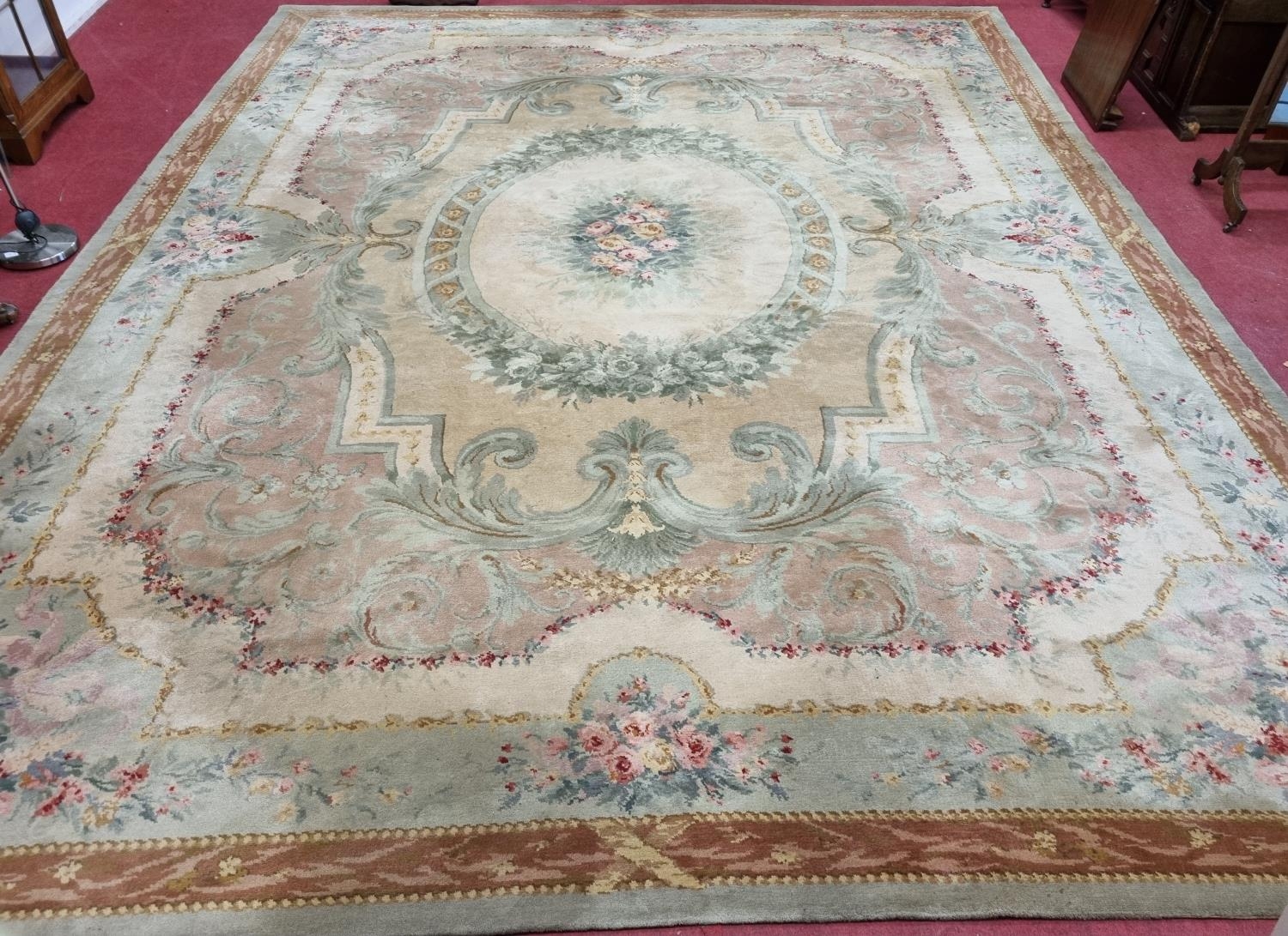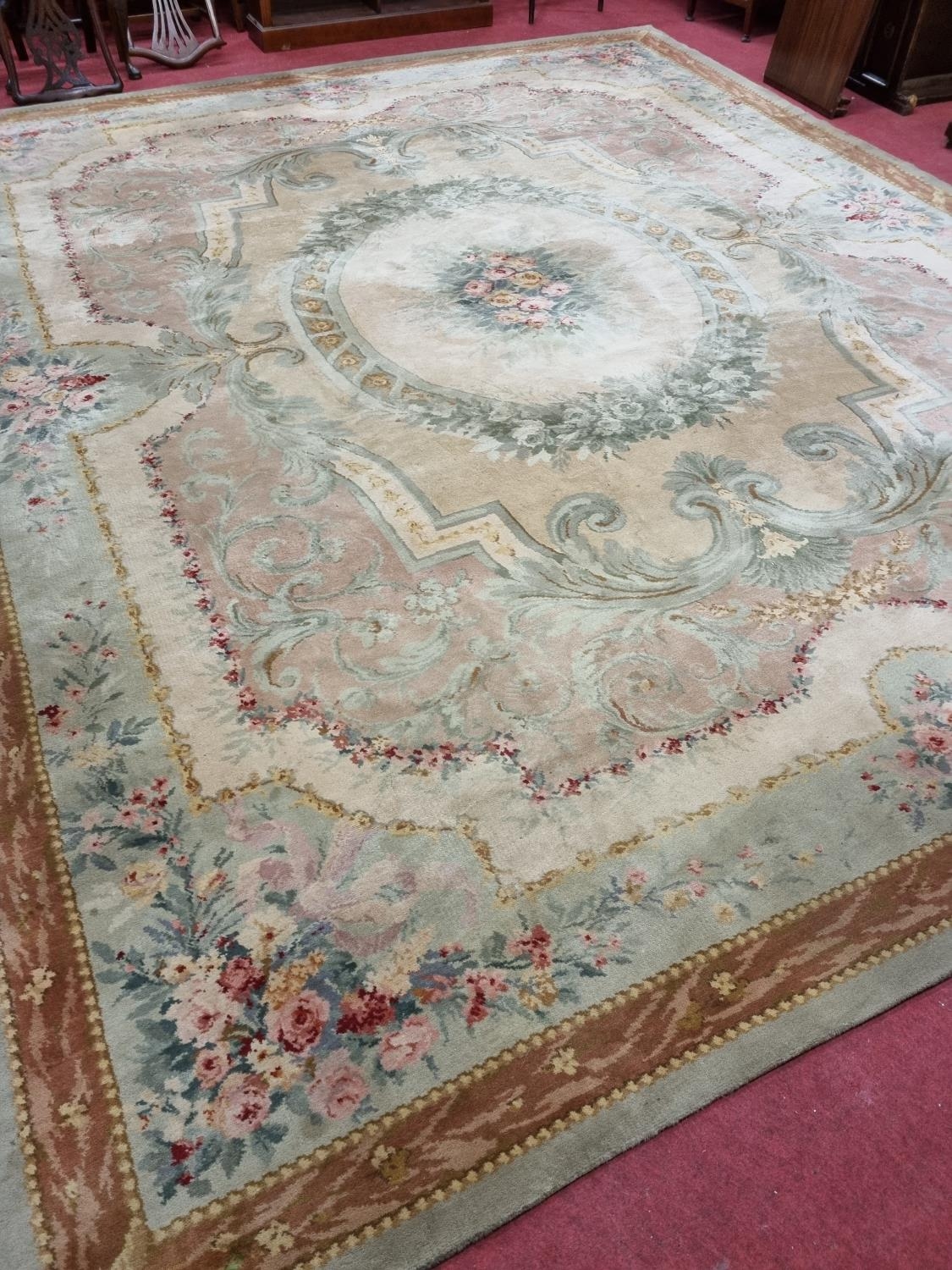 A Large Aubusson style cream and green ground Carpet with central floral motif surrounded by floral decoration and floral border 468 x 362 cm approx.