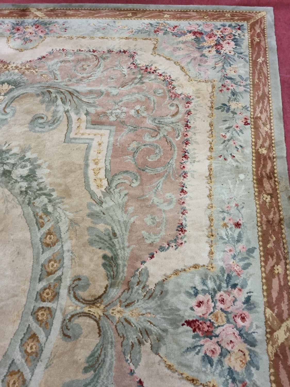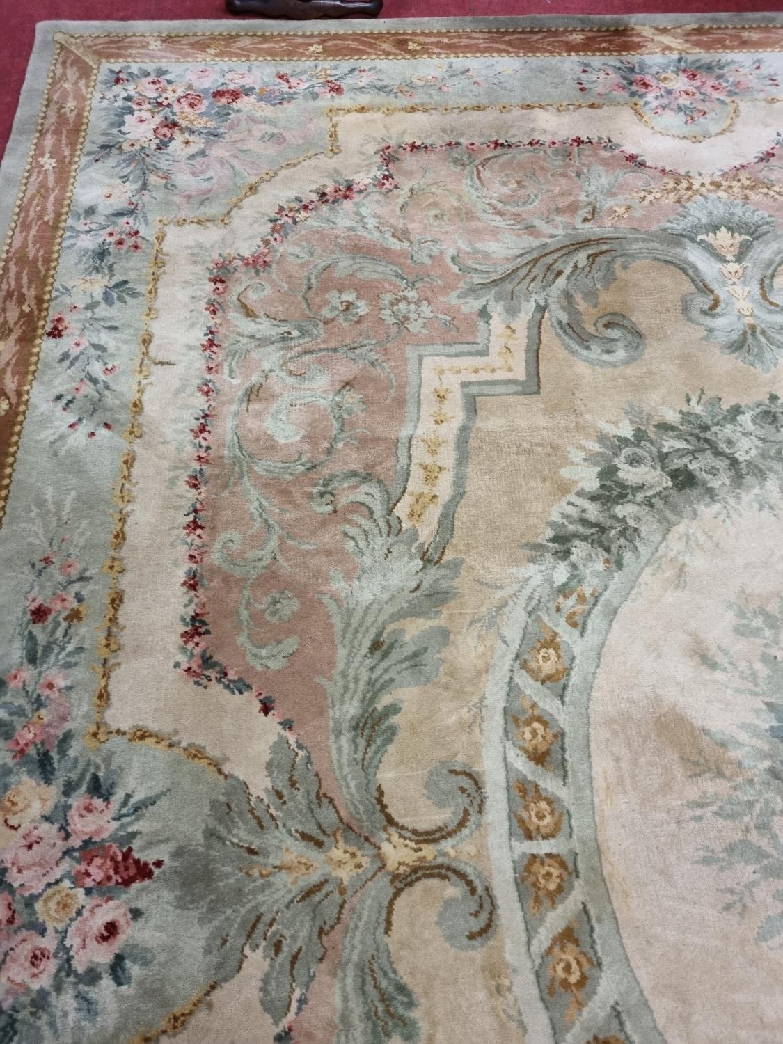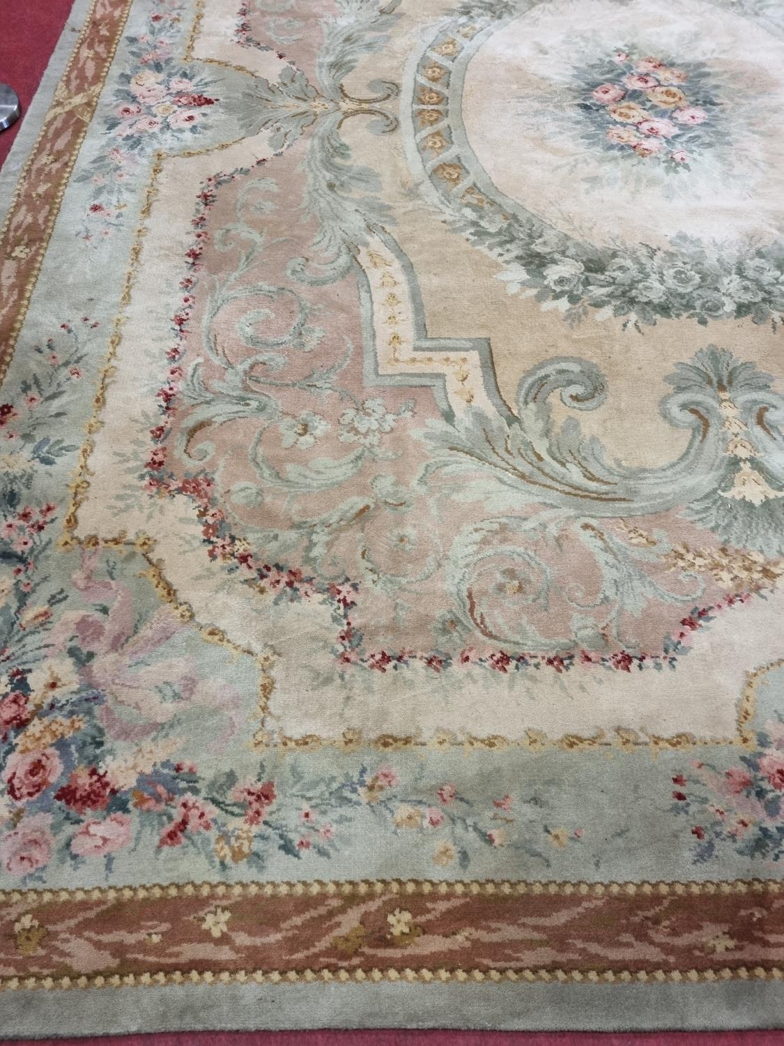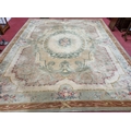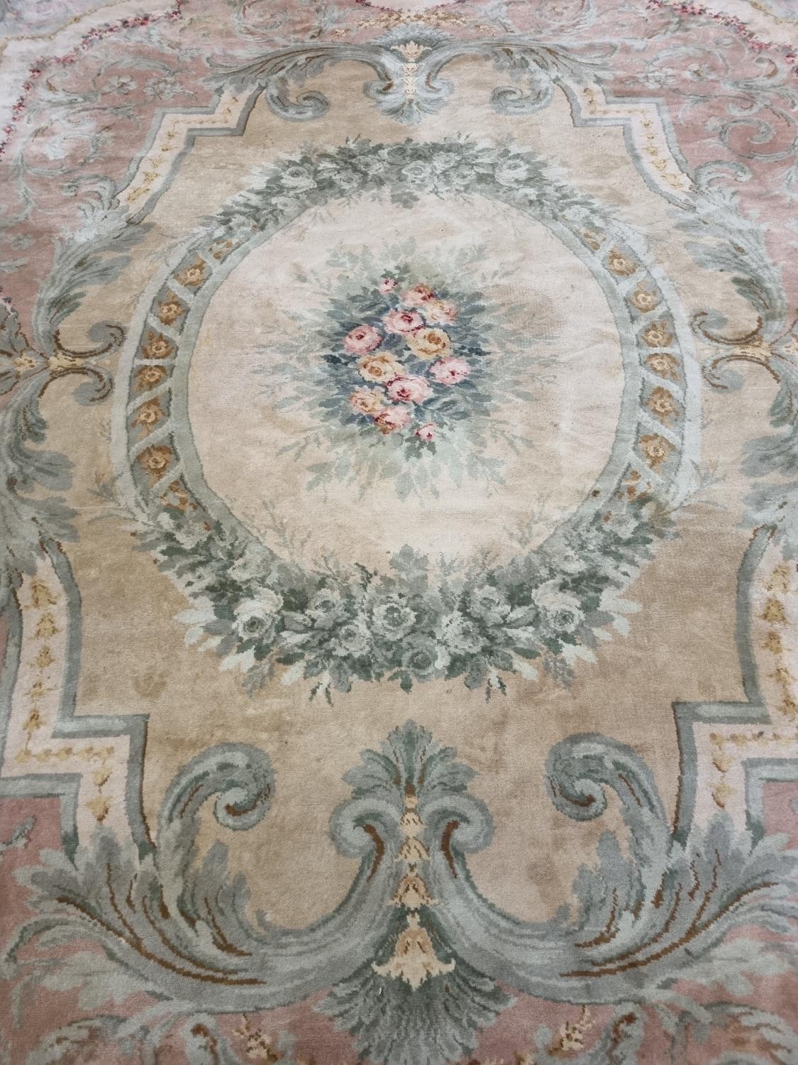 A Large Aubusson style cream and green ground Carpet with central floral motif surrounded by floral decoration and floral border 468 x 362 cm approx.