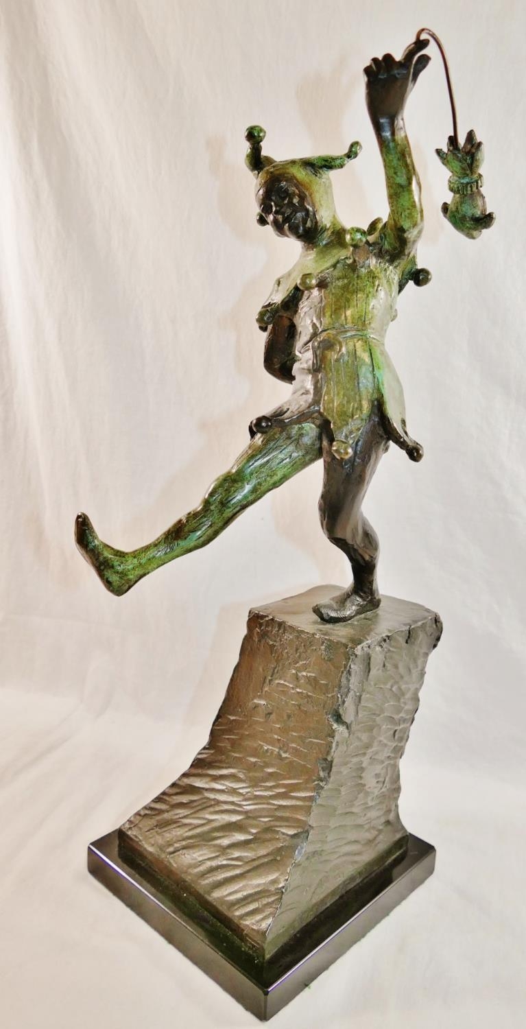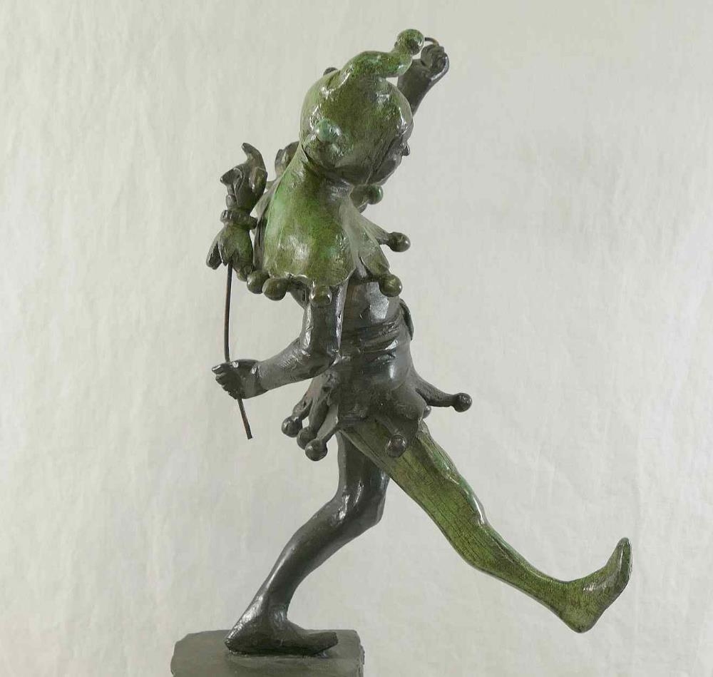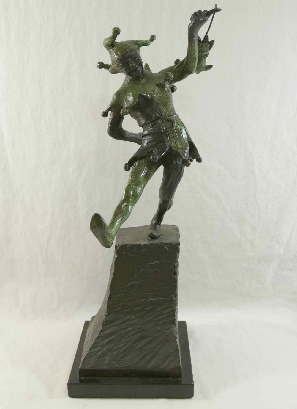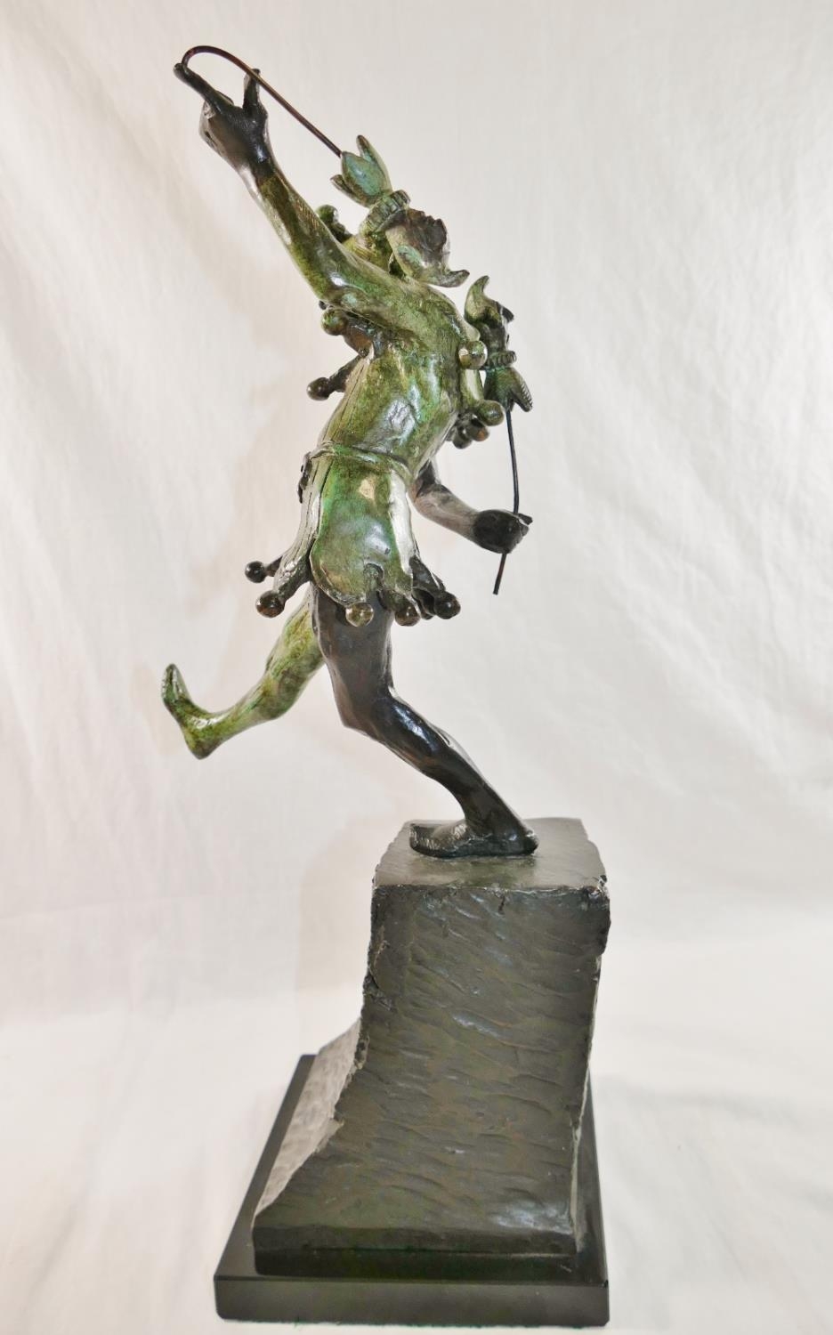 James Butler RA (b.1931), 'The Stratford Jester', patinated bronze, signed to base, dated '95 and numbered AC/IV, on square plinth (upheld jester's puppet bent)