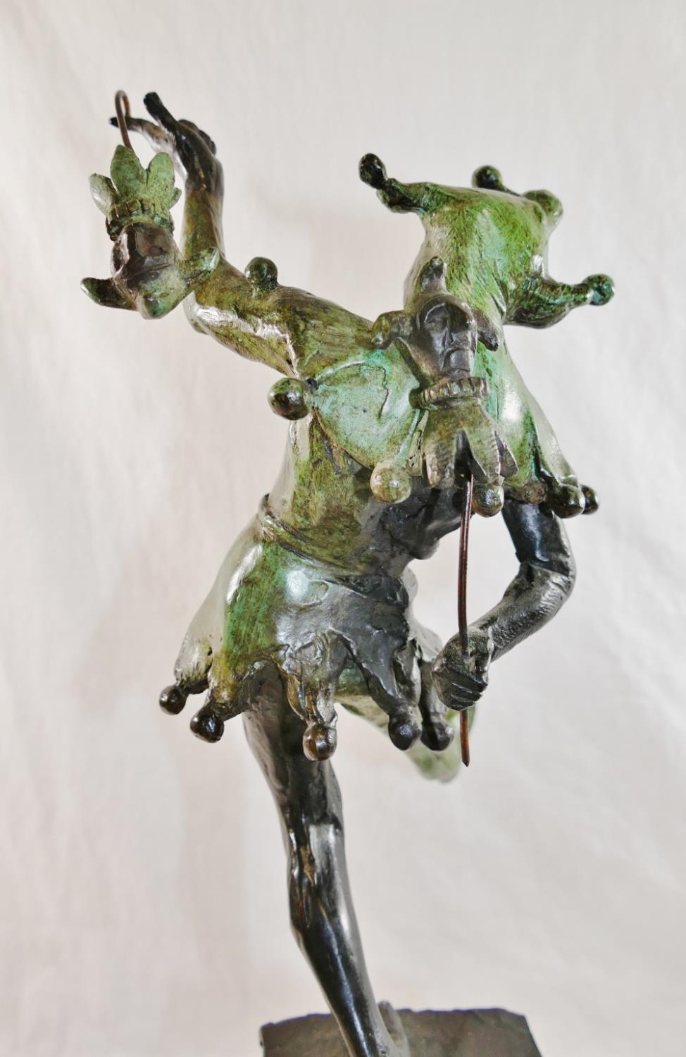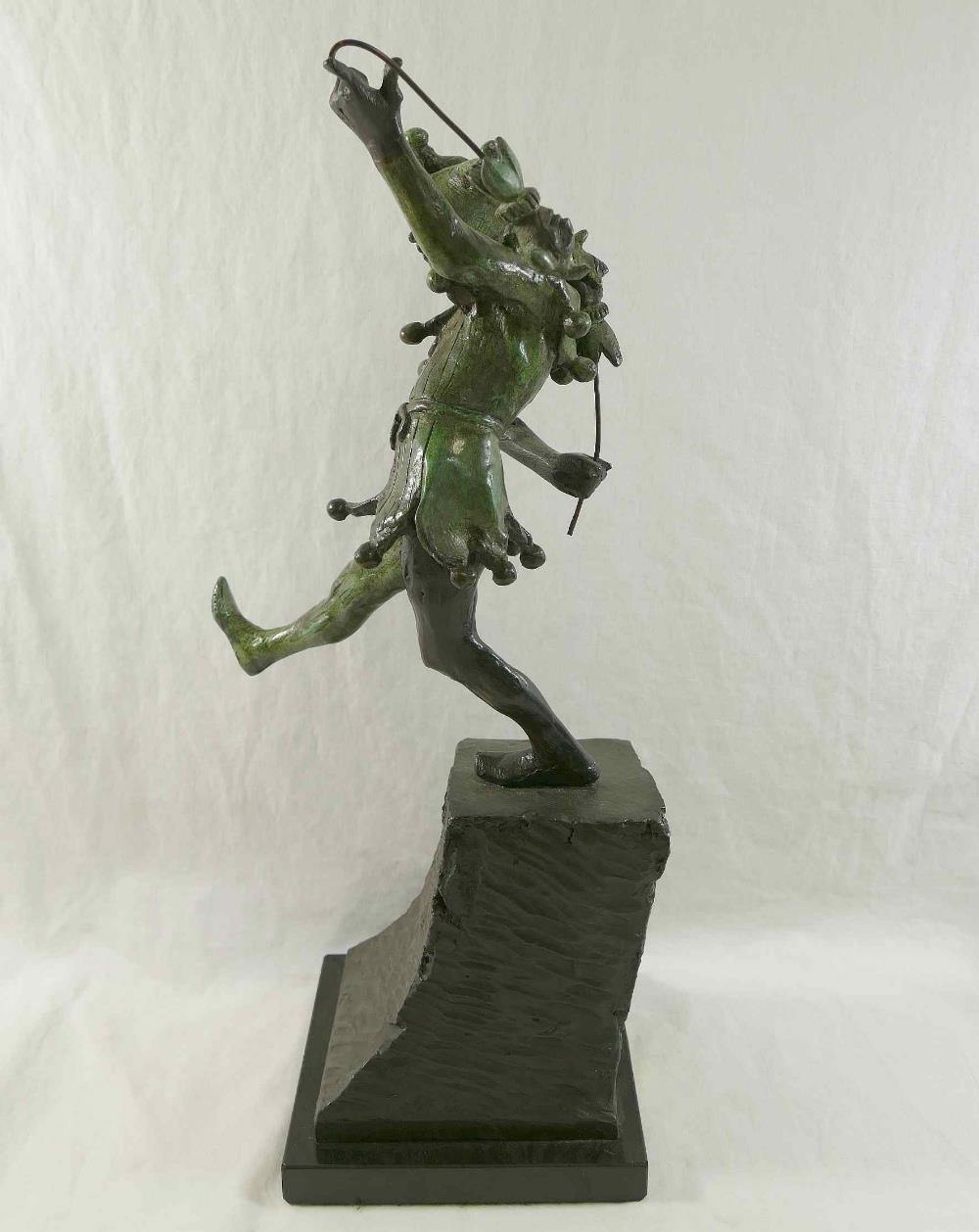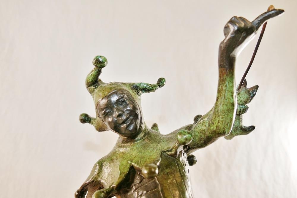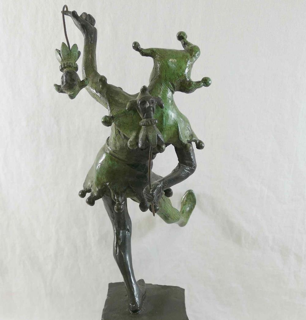 James Butler RA (b.1931), 'The Stratford Jester', patinated bronze, signed to base, dated '95 and numbered AC/IV, on square plinth (upheld jester's puppet bent)