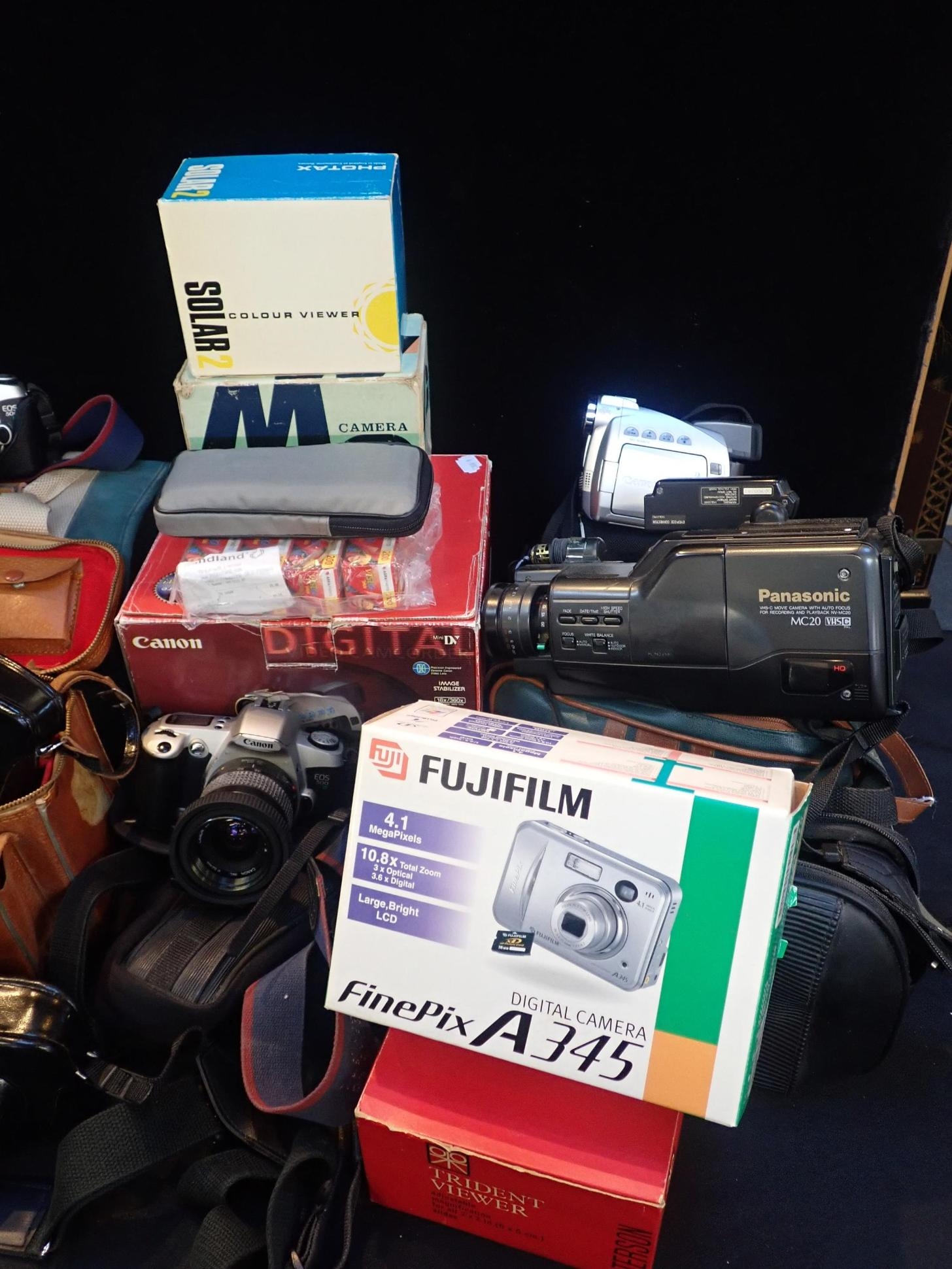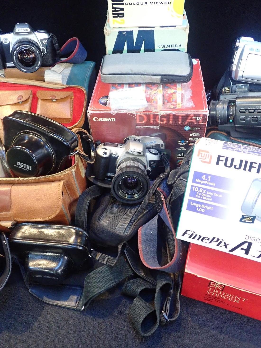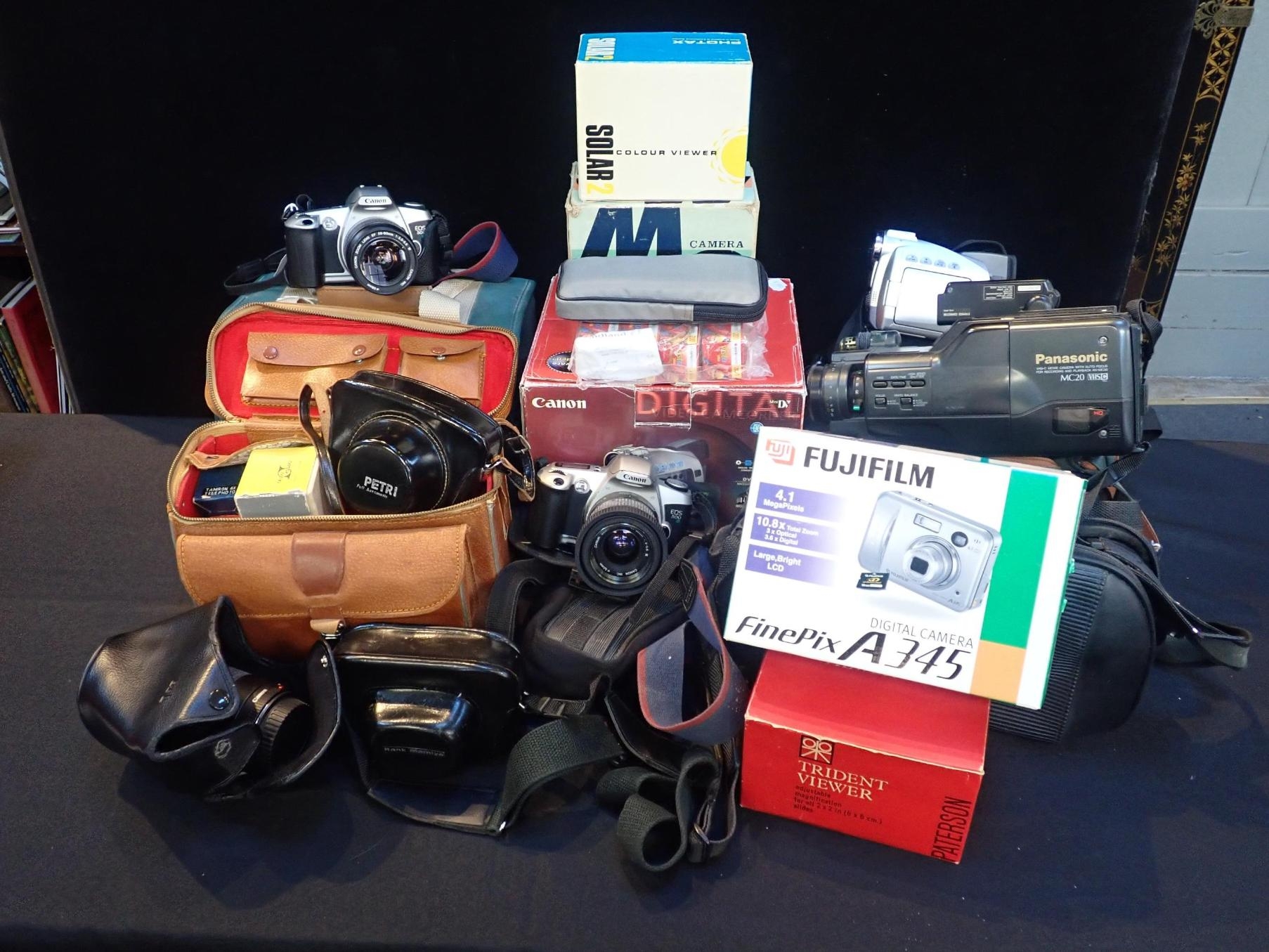 to include a Canon EOS 500 with 52mm lense, another with 58mm lense, together with a Canon Ultrasonic zoom lense, with other vintage cameras and accessories