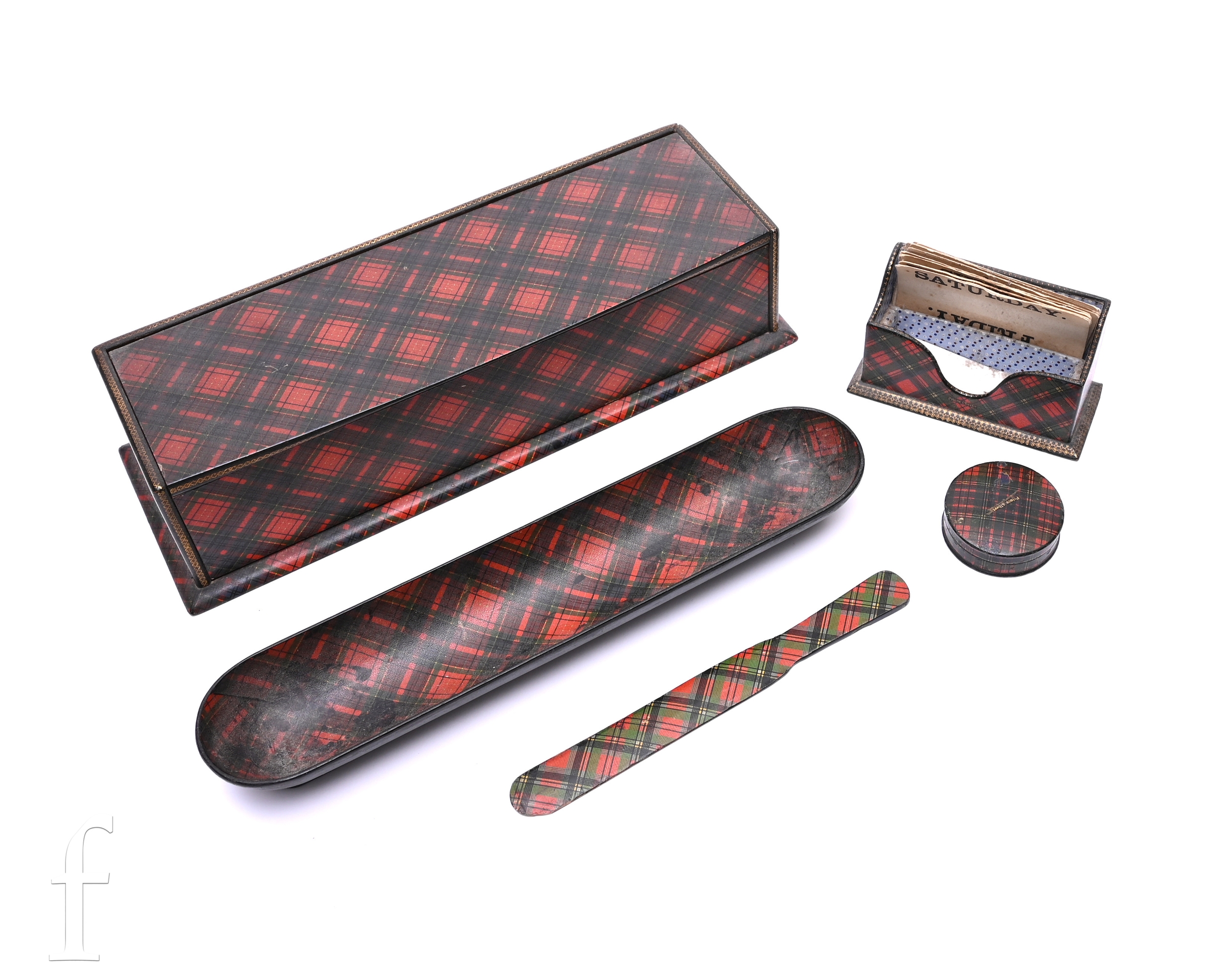 A tartan ware rectangular glove box, width 25cm, a small calendar box and paper knife, clan Prince Charlie, width 9.5cm, a pen tray and a small circular box and cover. (5)