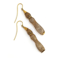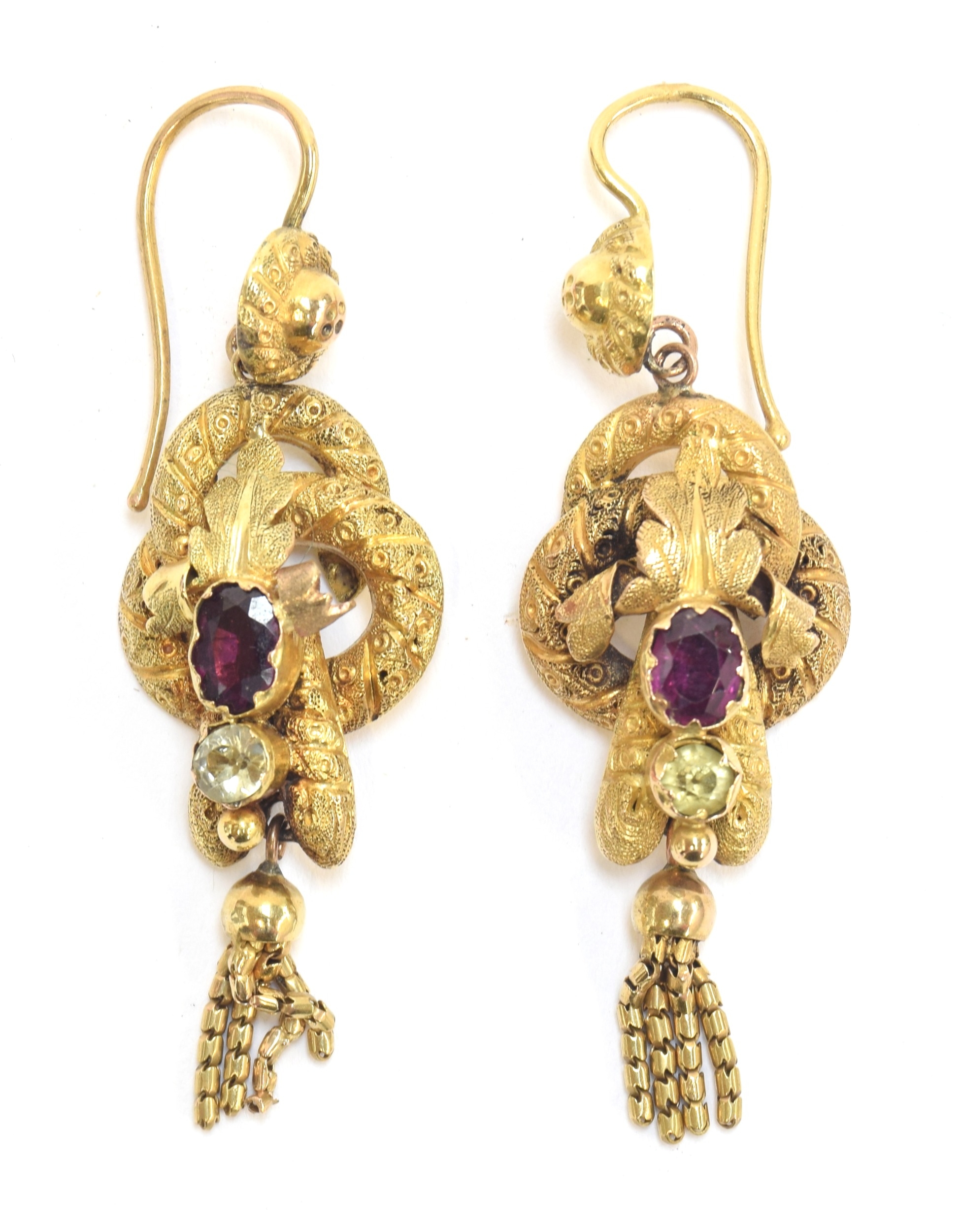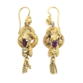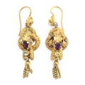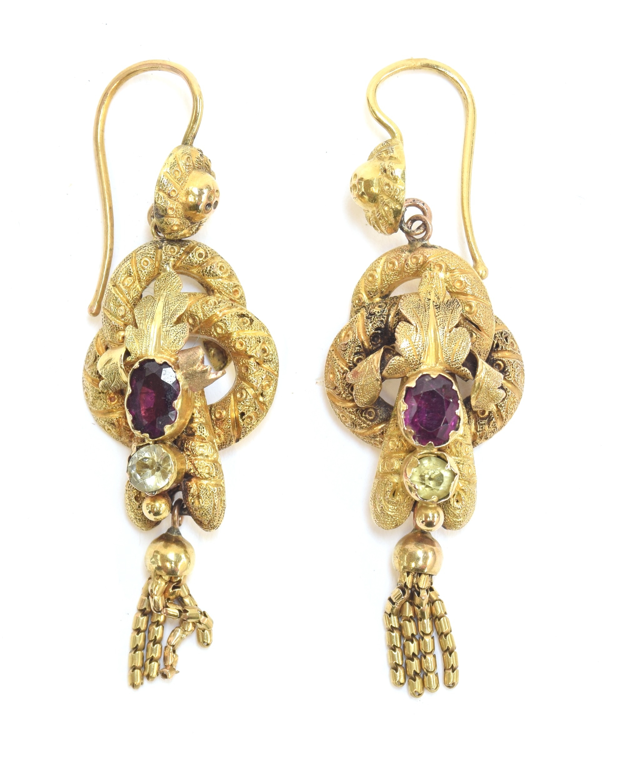 A pair of Victorian yellow metal drop earrings earrings set with almandine garnets and yellow topaz, of repousse knotted form with oak leaf detail and tassel drops, 4.6cm long, 7.5g