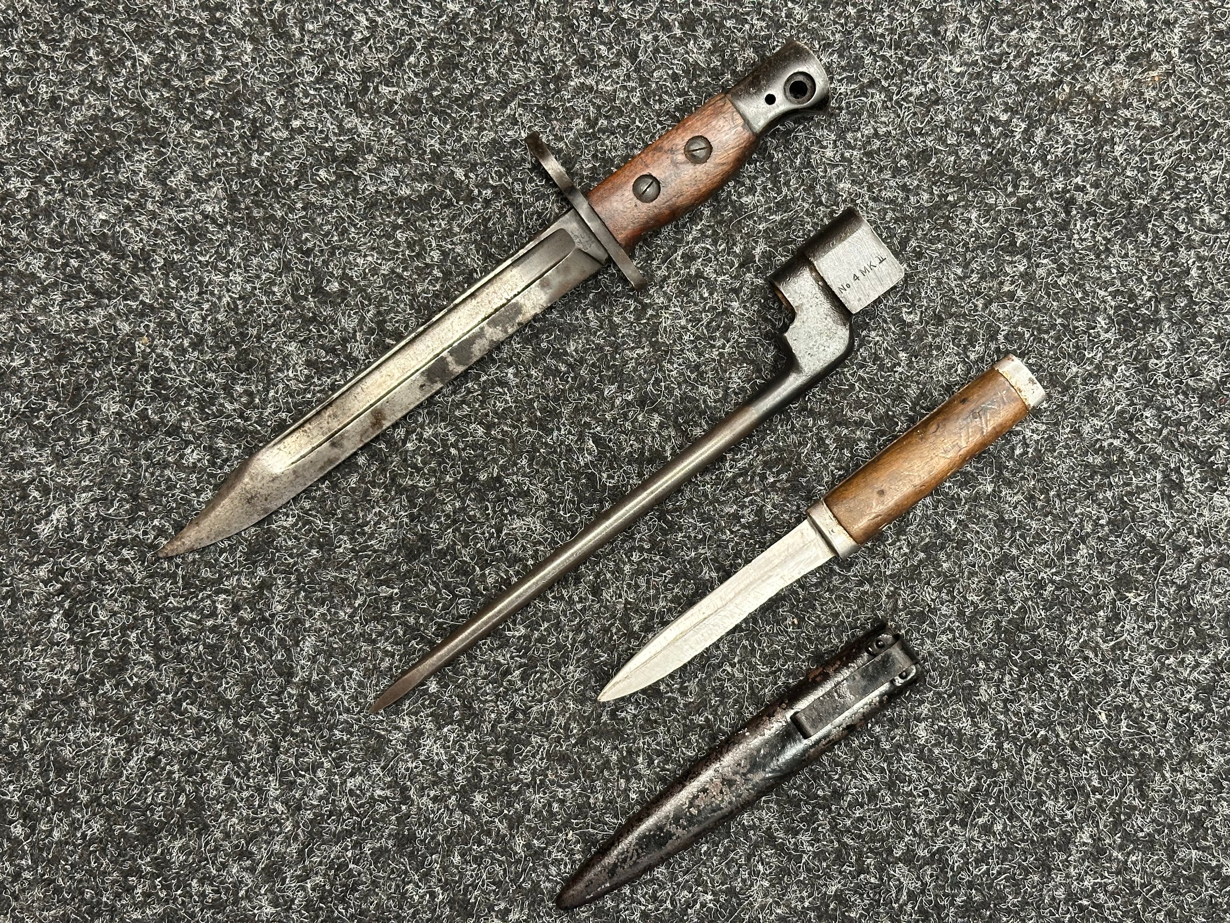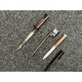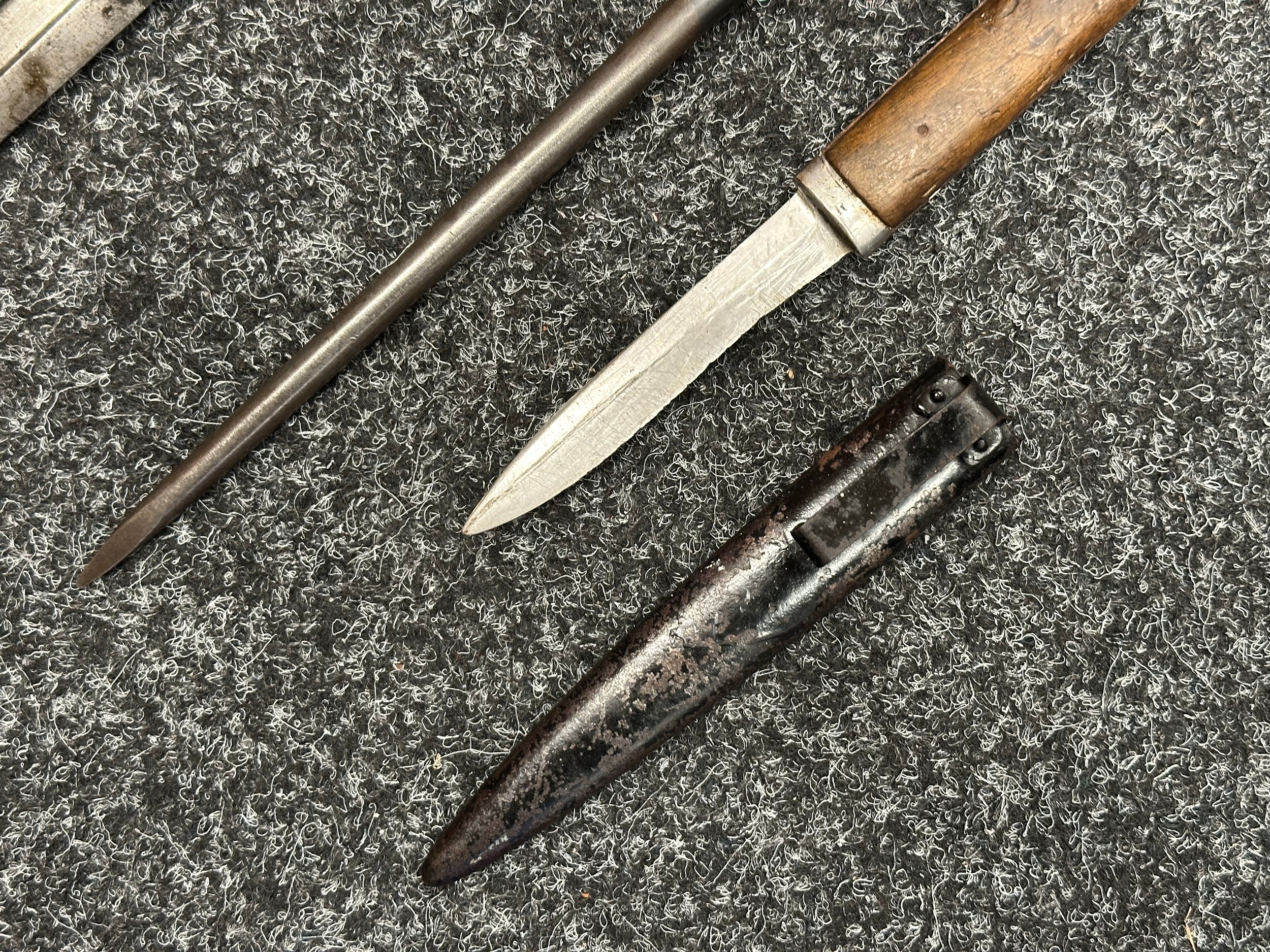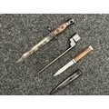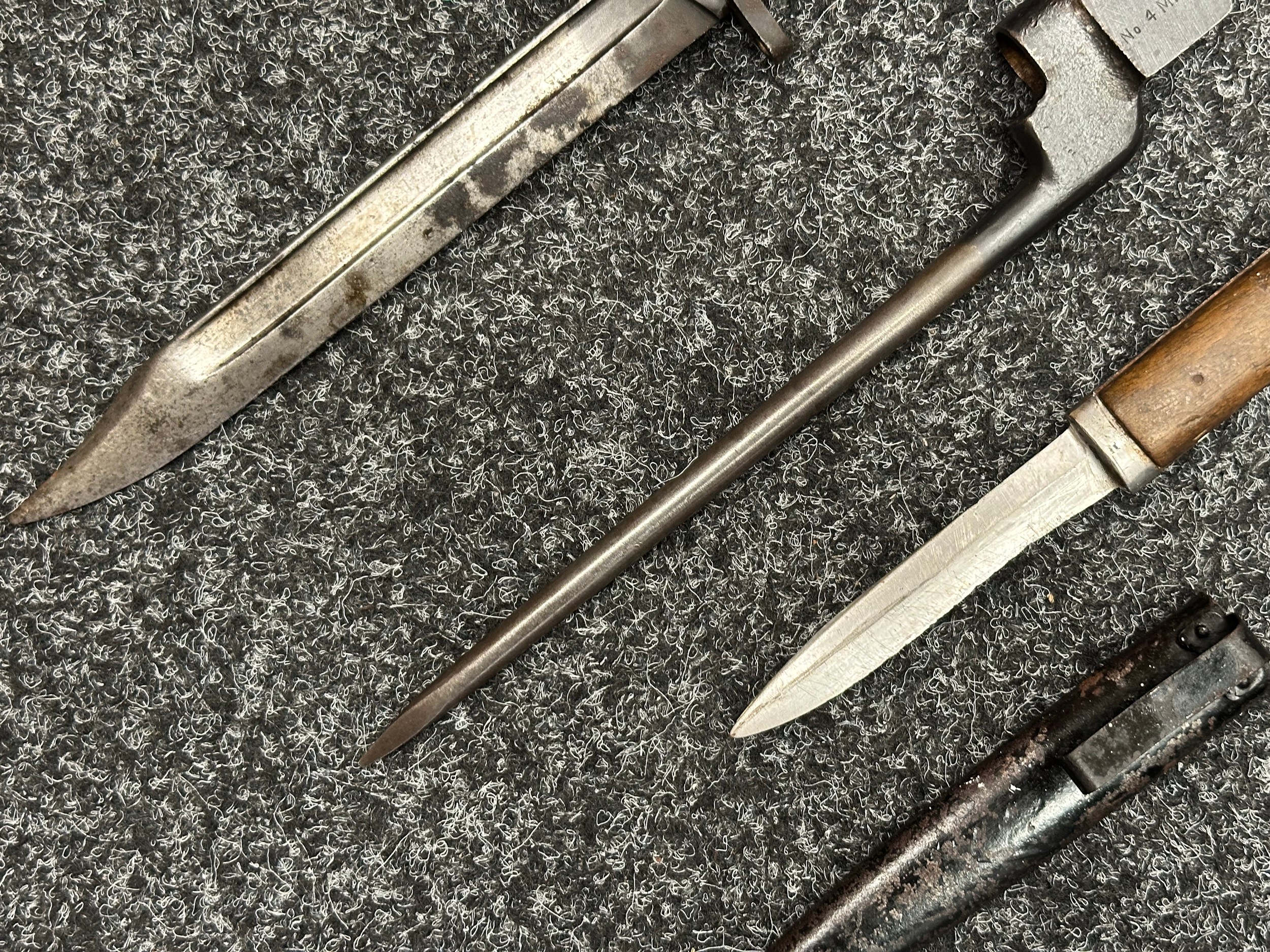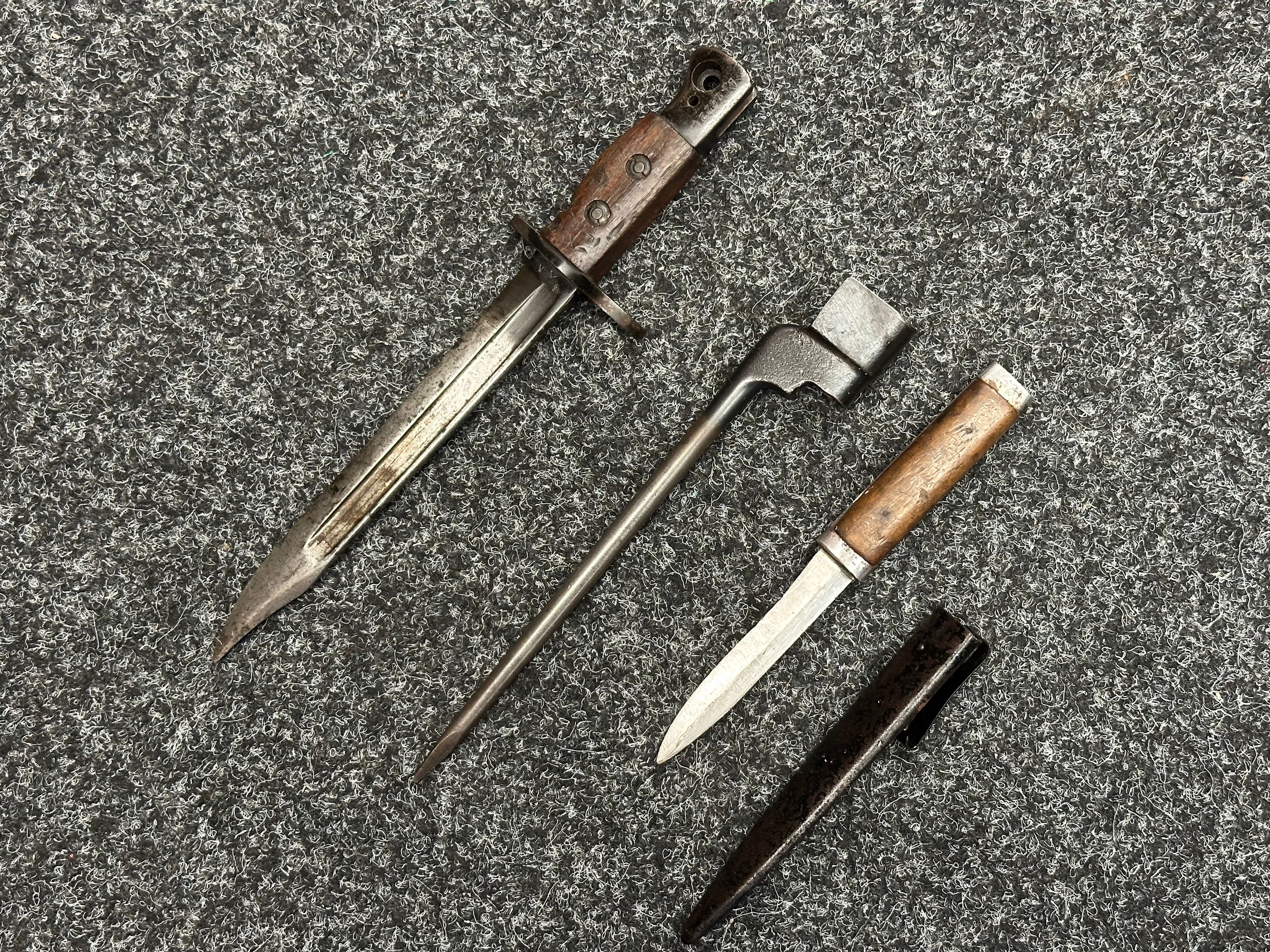 Three Edged weapons to include: WW2 British No 5 Jungle Carbine Bayonet with fullered singled edged Bowie style blade 200mm in length, maker marked "294 WS". Wooden grips, release catch missing, no scabbard: WW2 British No 4 MKII Spike Bayonet, no scabbard: WW1 German Trench Knife with single edged blade100mm in length, wooden grips, pommel marked "Rostfrei", overall length 195mm, complete with metal scabbard. (3)