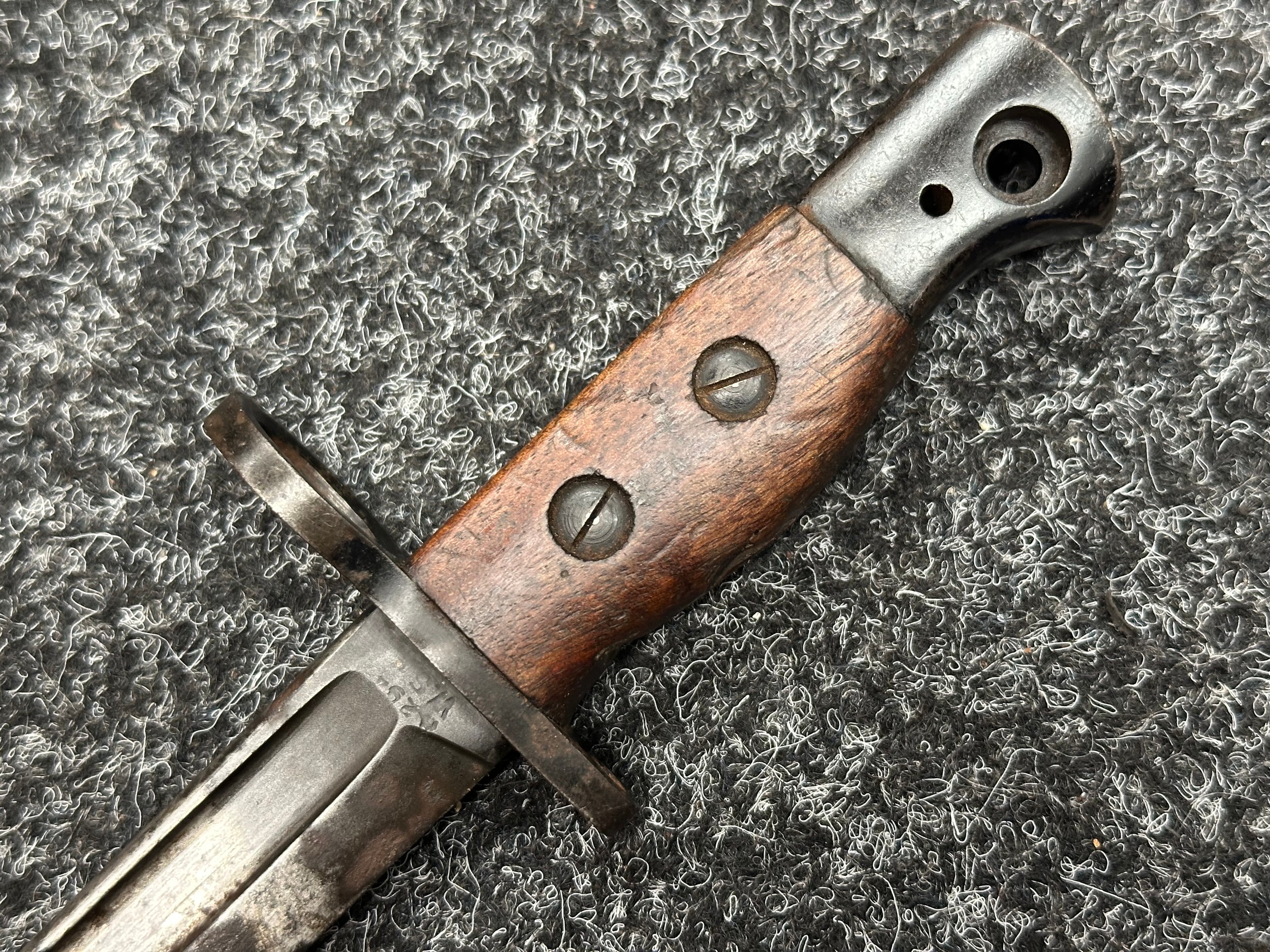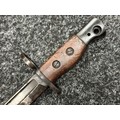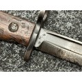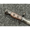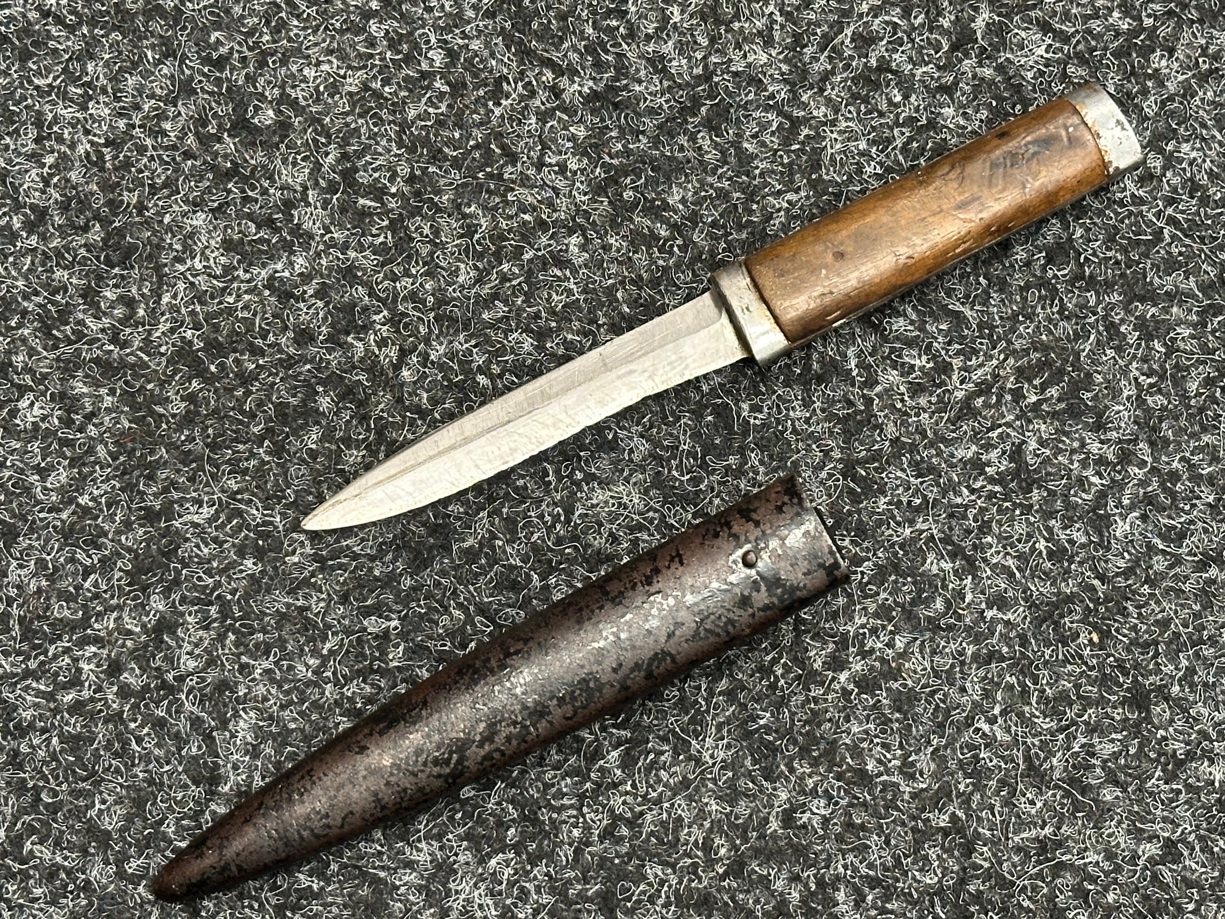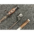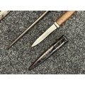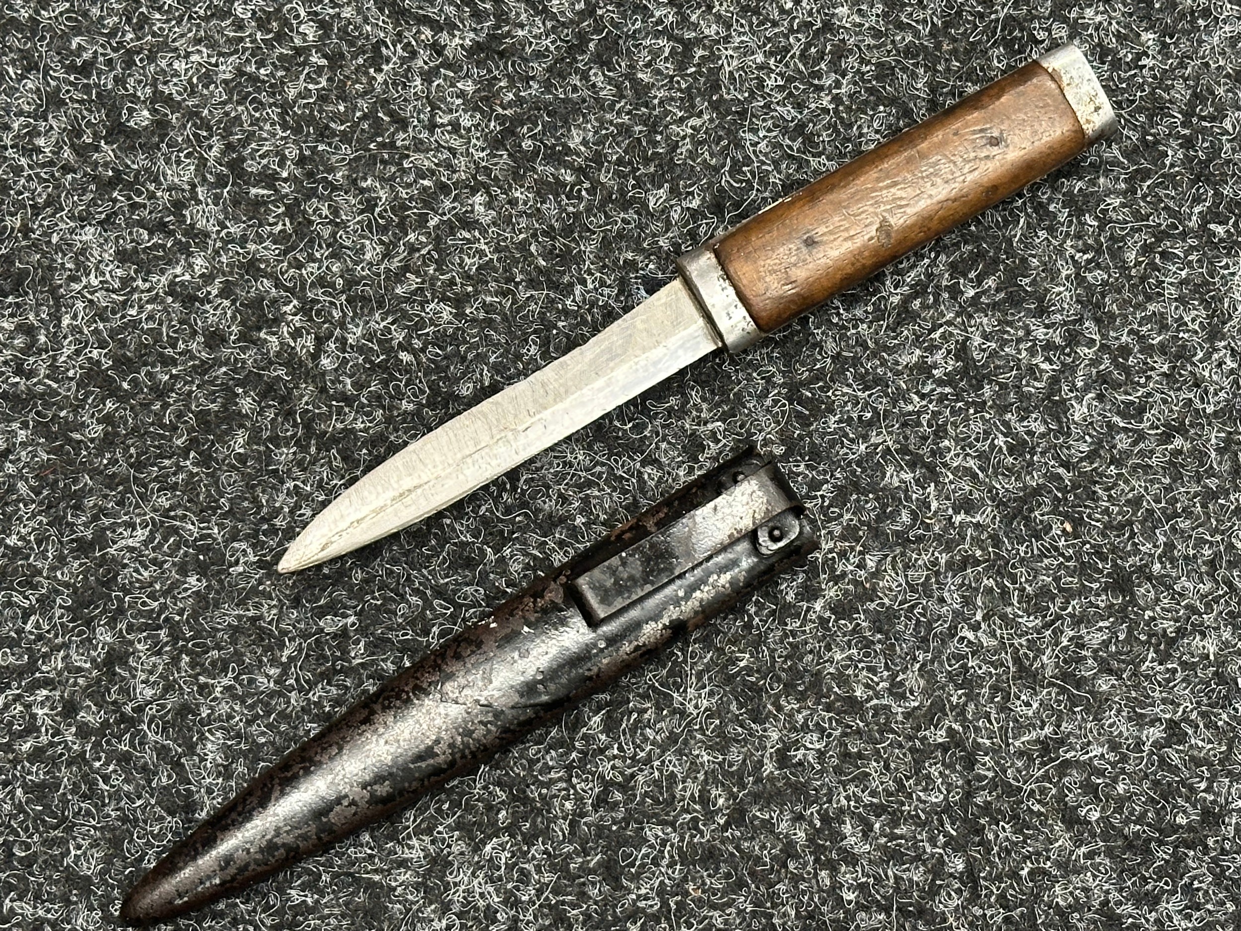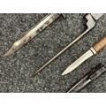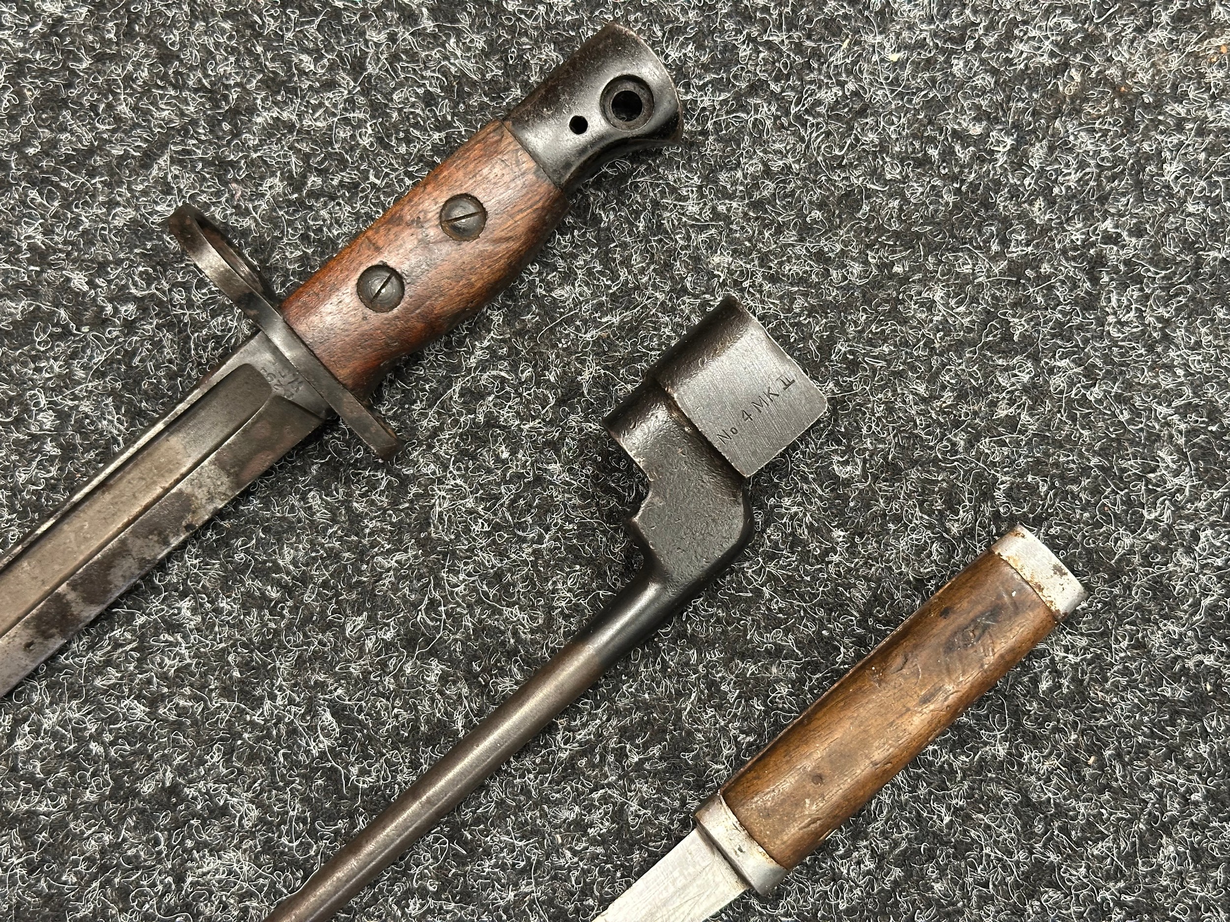 Three Edged weapons to include: WW2 British No 5 Jungle Carbine Bayonet with fullered singled edged Bowie style blade 200mm in length, maker marked "294 WS". Wooden grips, release catch missing, no scabbard: WW2 British No 4 MKII Spike Bayonet, no scabbard: WW1 German Trench Knife with single edged blade100mm in length, wooden grips, pommel marked "Rostfrei", overall length 195mm, complete with metal scabbard. (3)