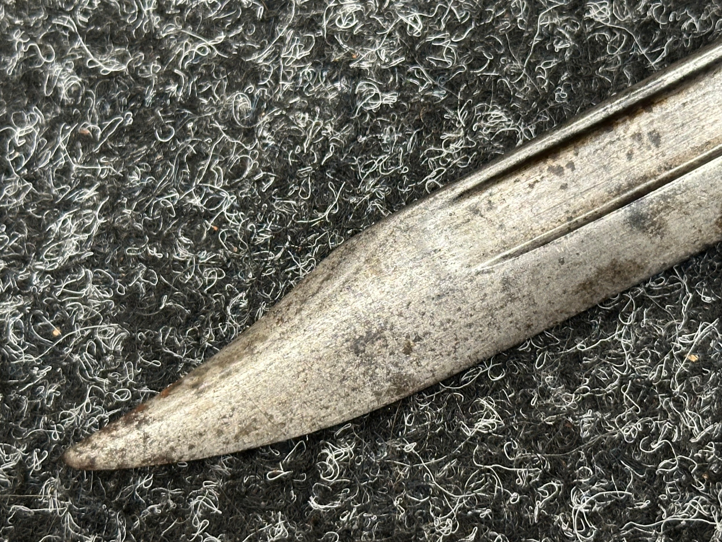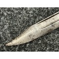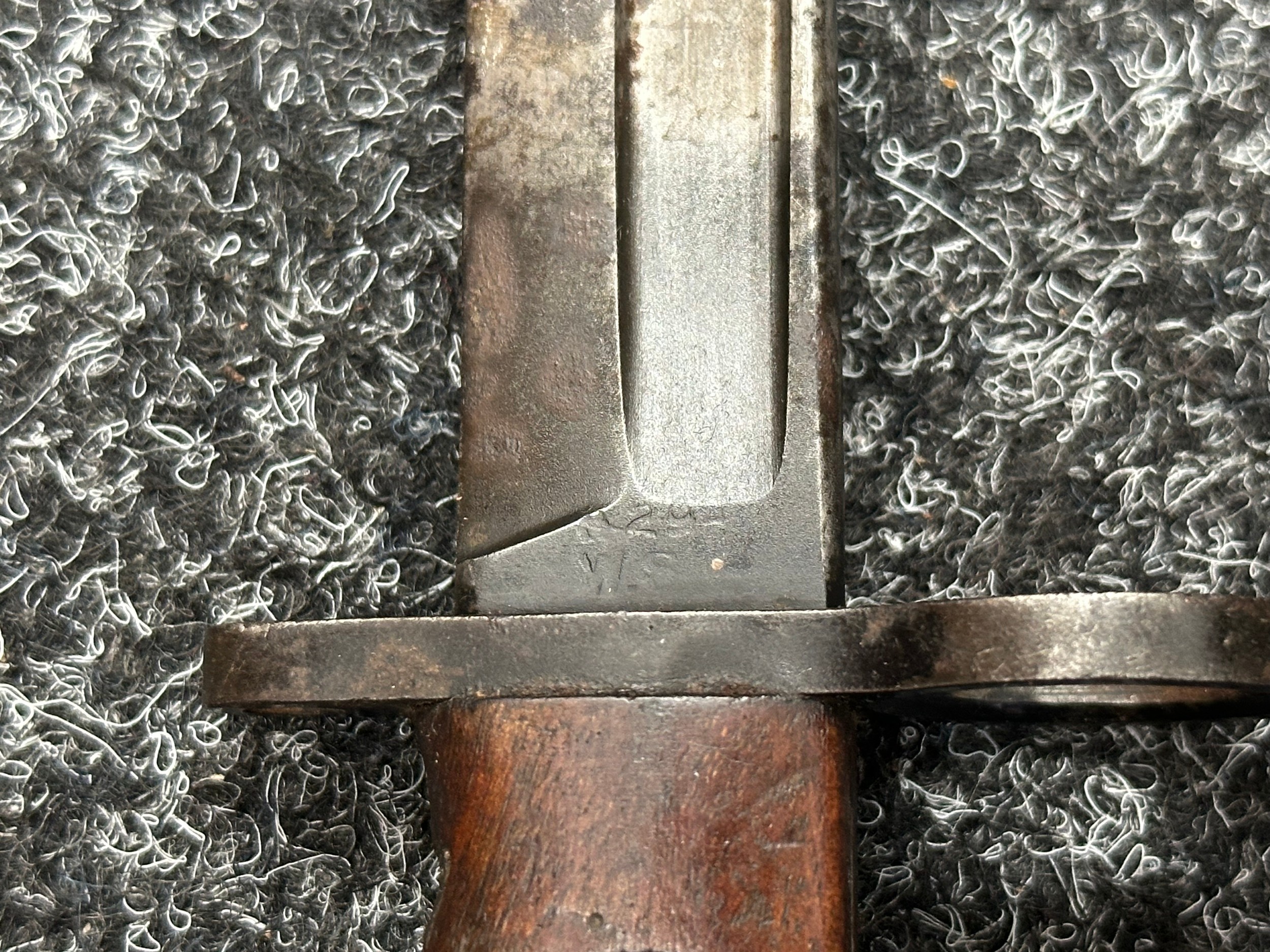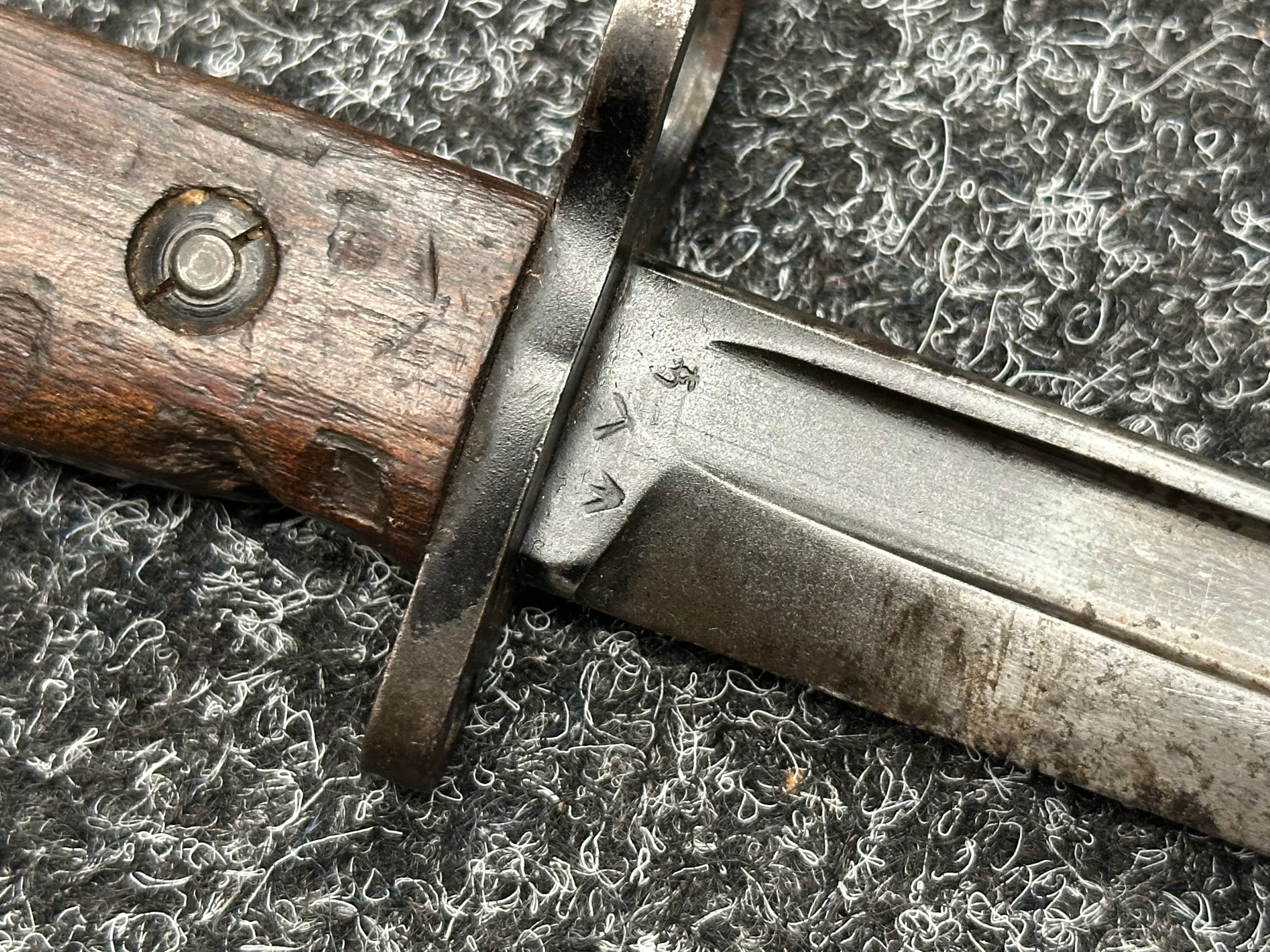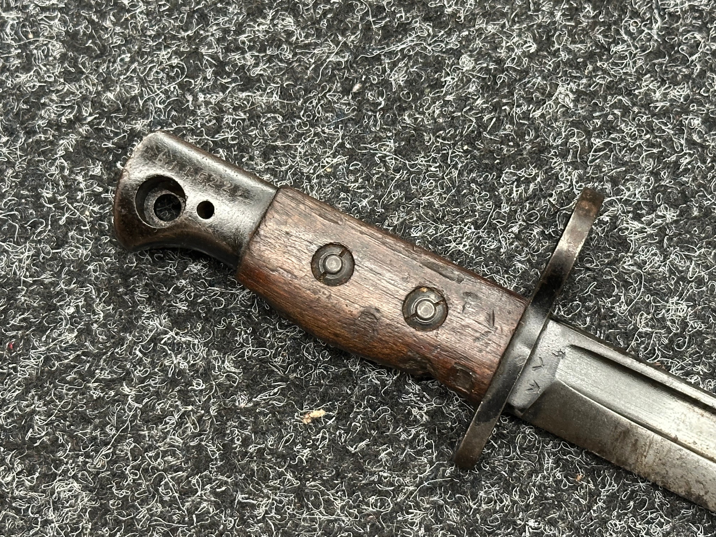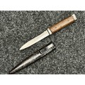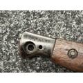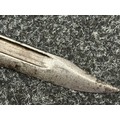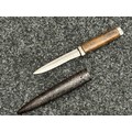 Three Edged weapons to include: WW2 British No 5 Jungle Carbine Bayonet with fullered singled edged Bowie style blade 200mm in length, maker marked "294 WS". Wooden grips, release catch missing, no scabbard: WW2 British No 4 MKII Spike Bayonet, no scabbard: WW1 German Trench Knife with single edged blade100mm in length, wooden grips, pommel marked "Rostfrei", overall length 195mm, complete with metal scabbard. (3)