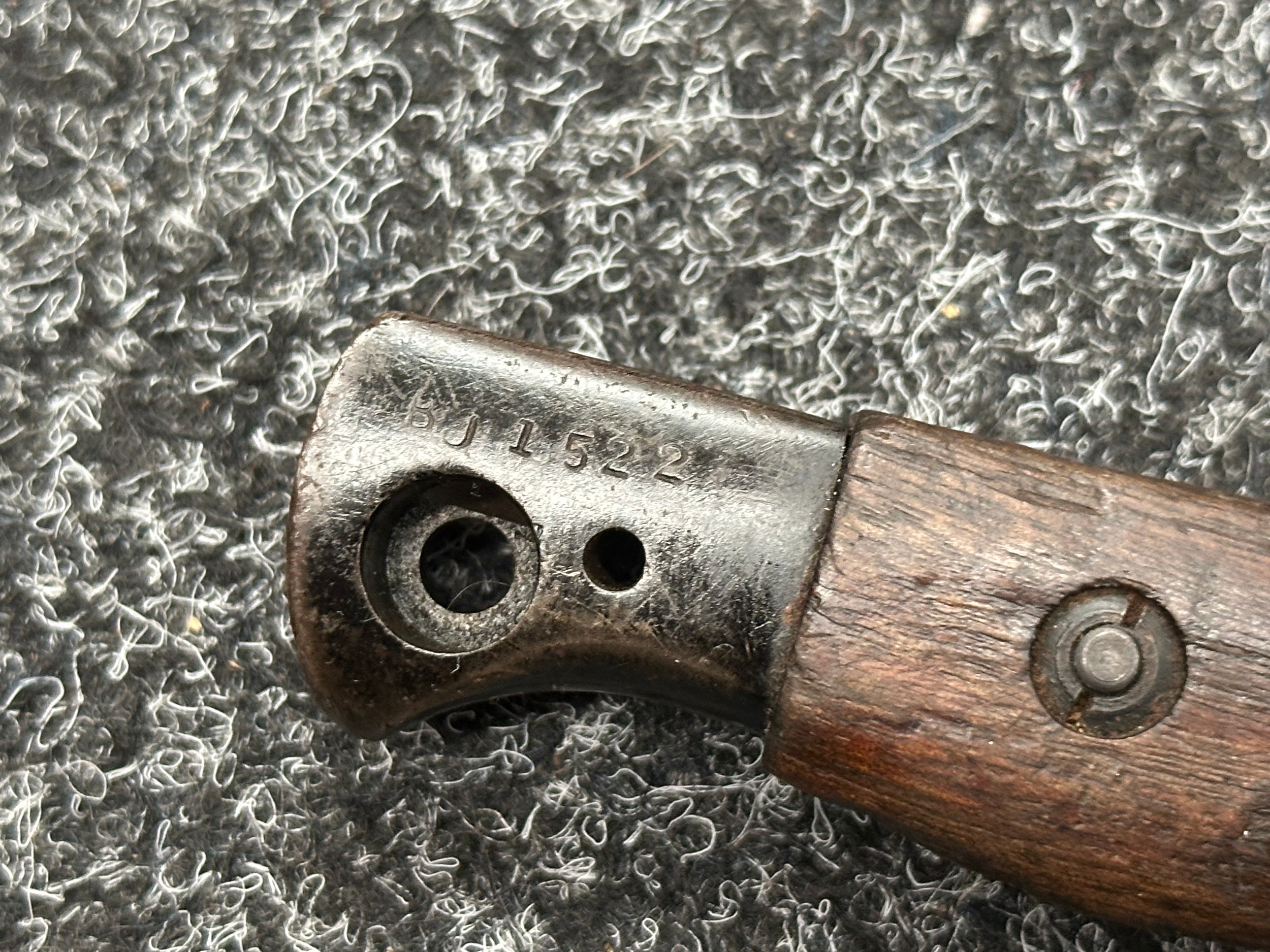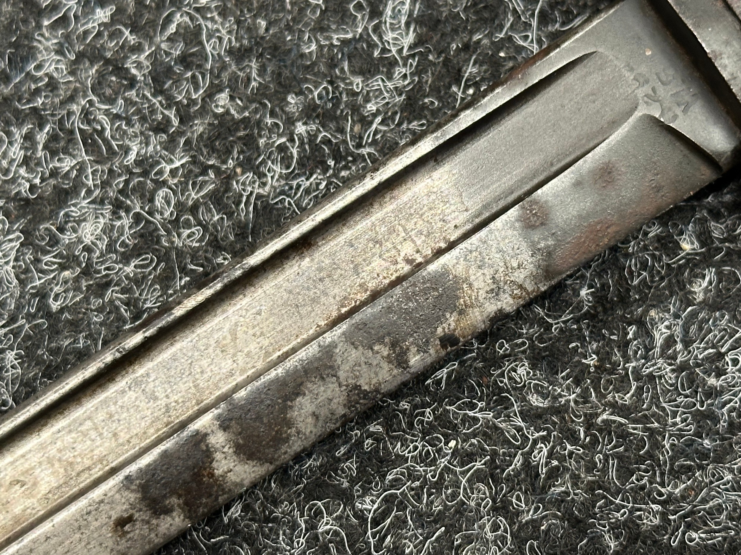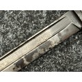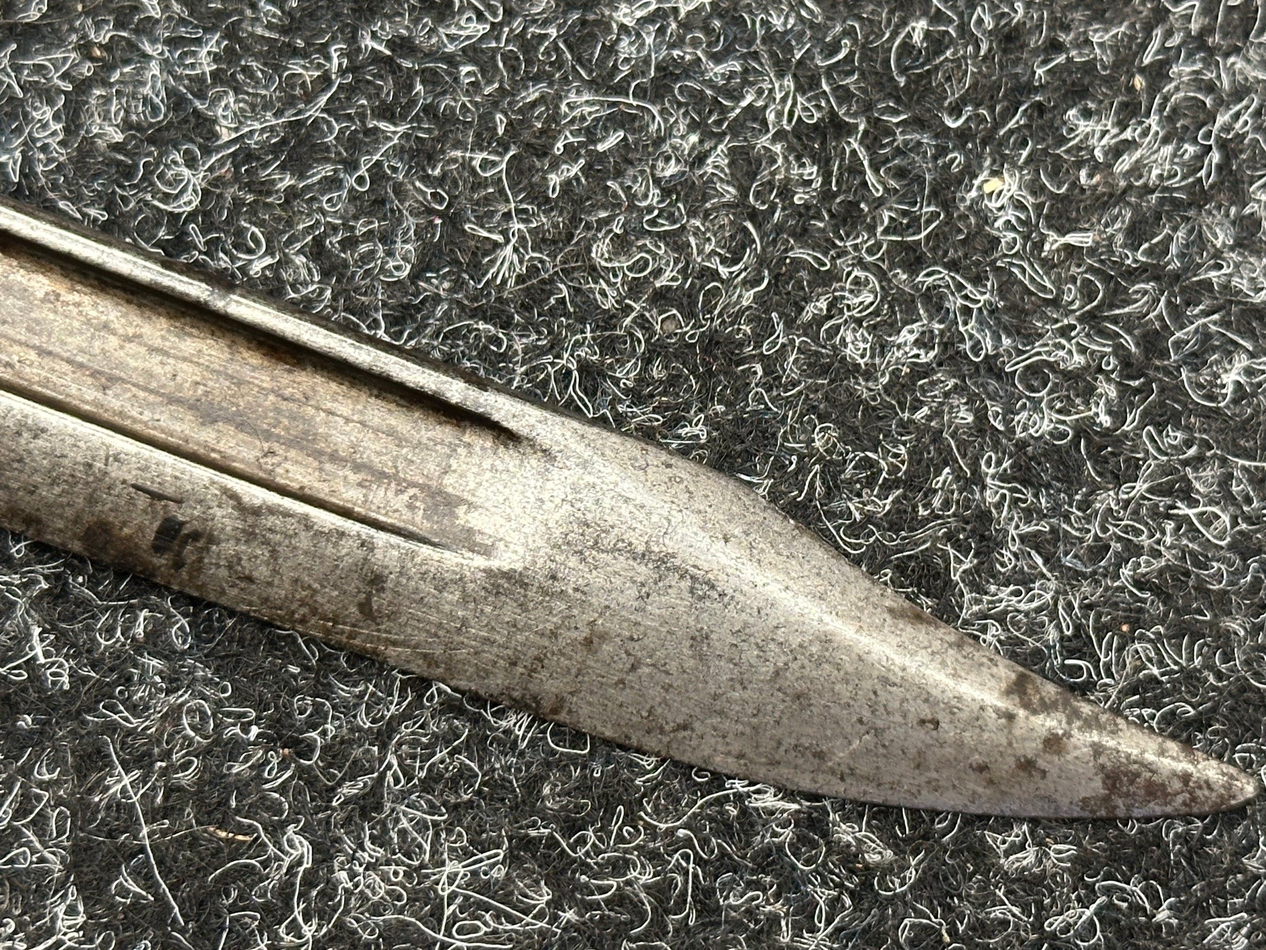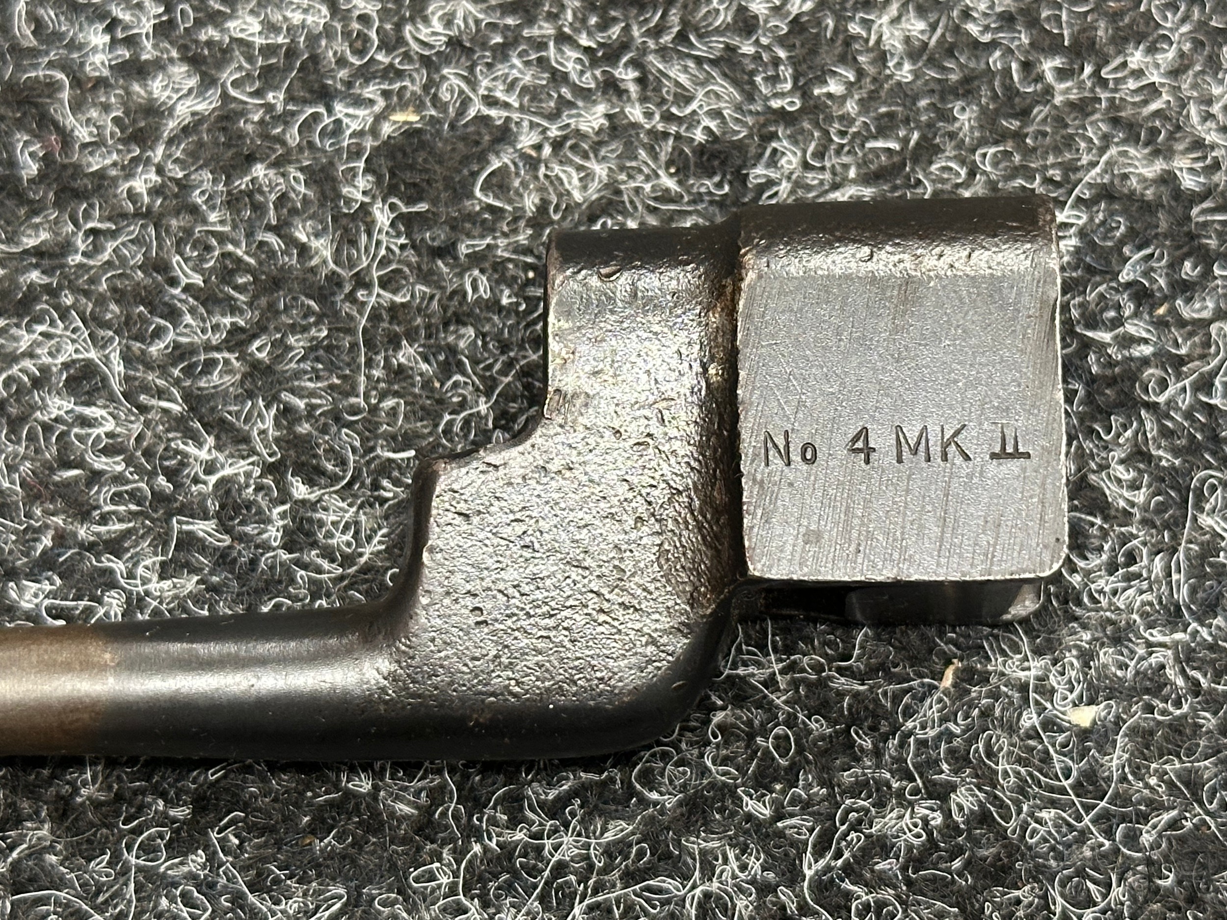 Three Edged weapons to include: WW2 British No 5 Jungle Carbine Bayonet with fullered singled edged Bowie style blade 200mm in length, maker marked "294 WS". Wooden grips, release catch missing, no scabbard: WW2 British No 4 MKII Spike Bayonet, no scabbard: WW1 German Trench Knife with single edged blade100mm in length, wooden grips, pommel marked "Rostfrei", overall length 195mm, complete with metal scabbard. (3)