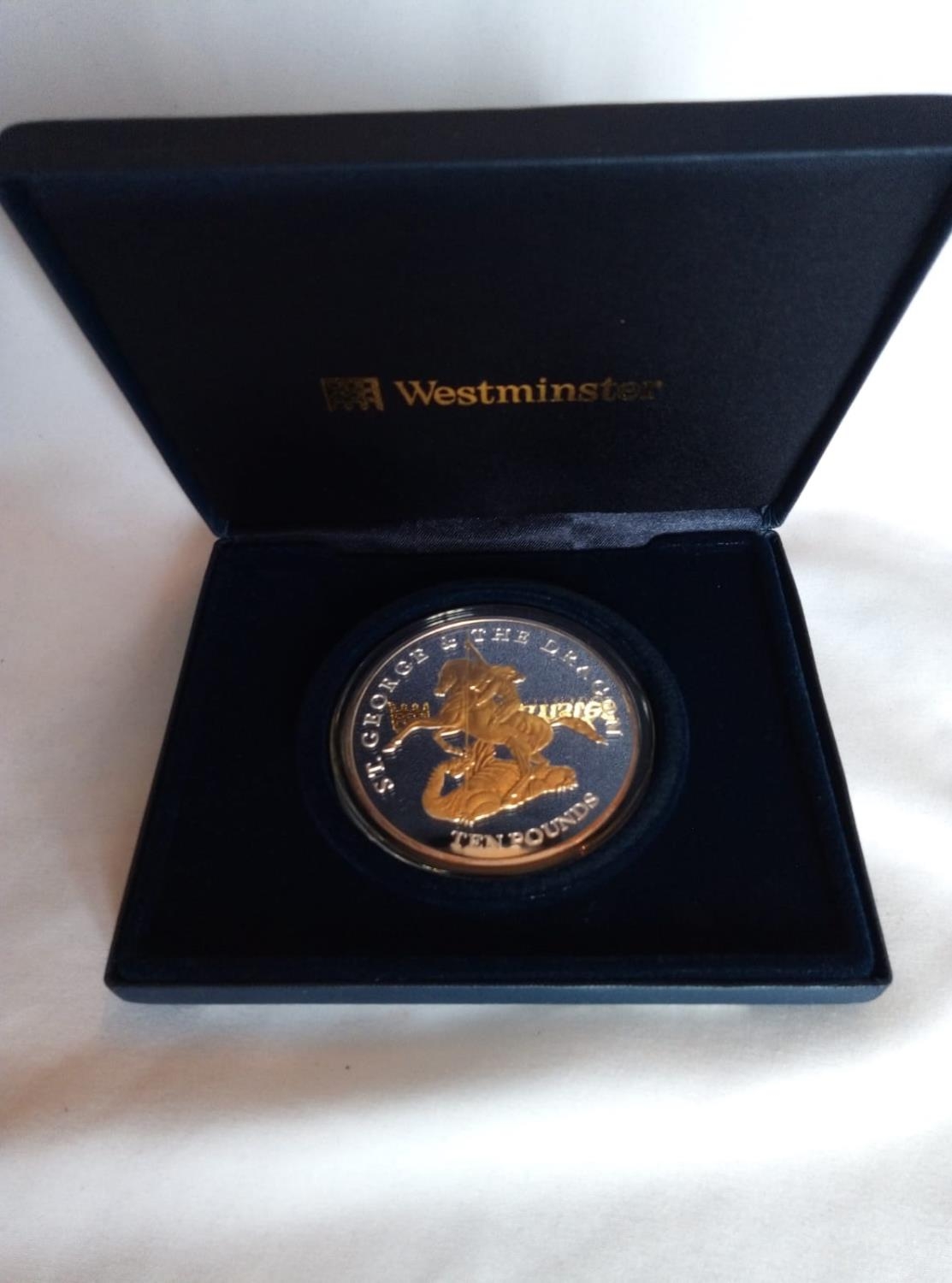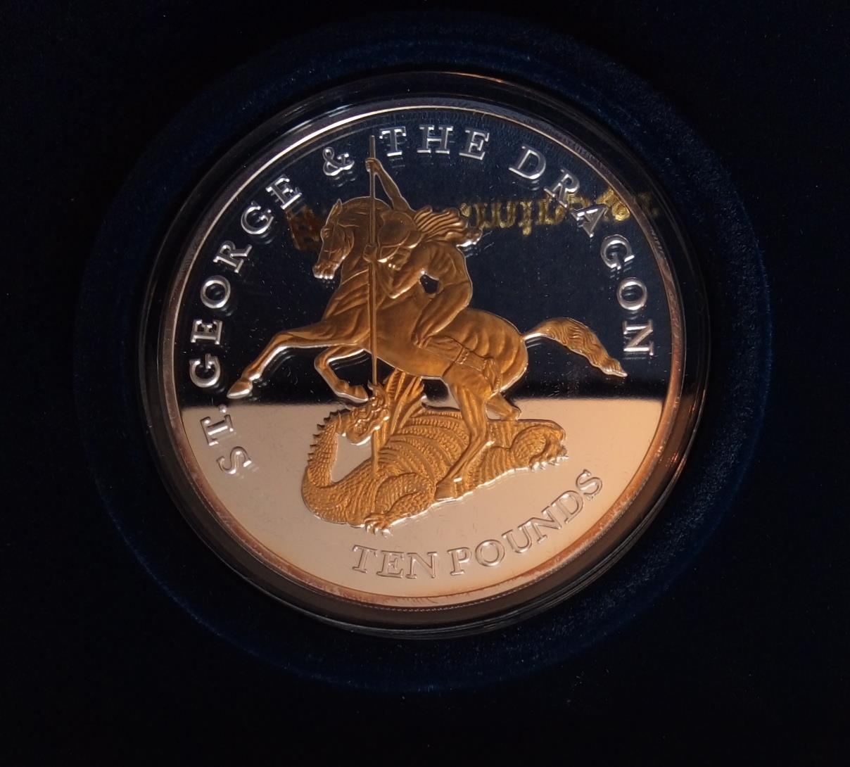 A 24CT GOLD ON SILVER 5OZ COMMEMORATIVE TEN POUND COIN PROOF COIN, DATED 2009