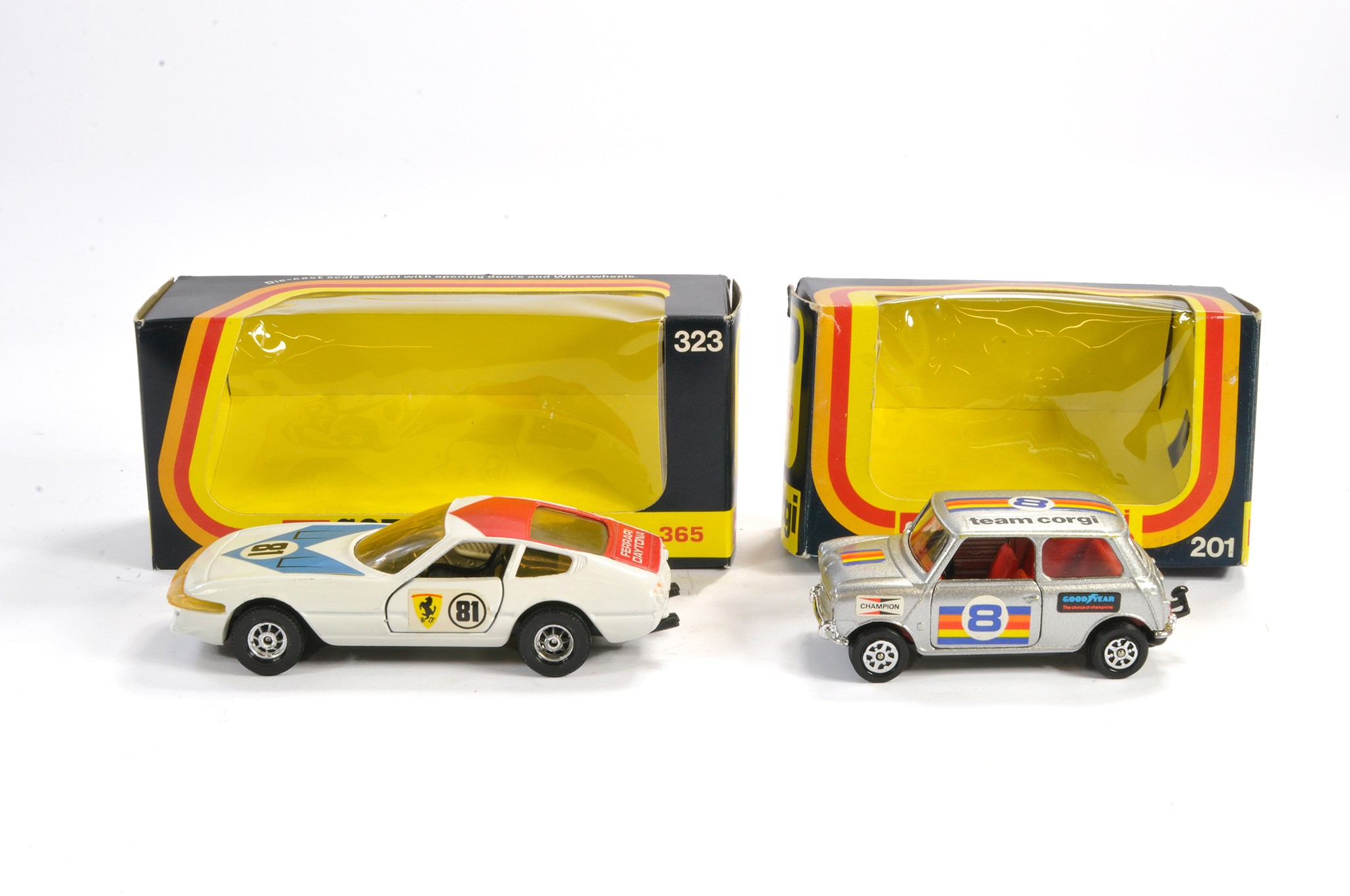 Corgi No. 201 Mini 1000 in team corgi livery plus No. 323 Ferrari Daytona. Both excellent in very good boxes.