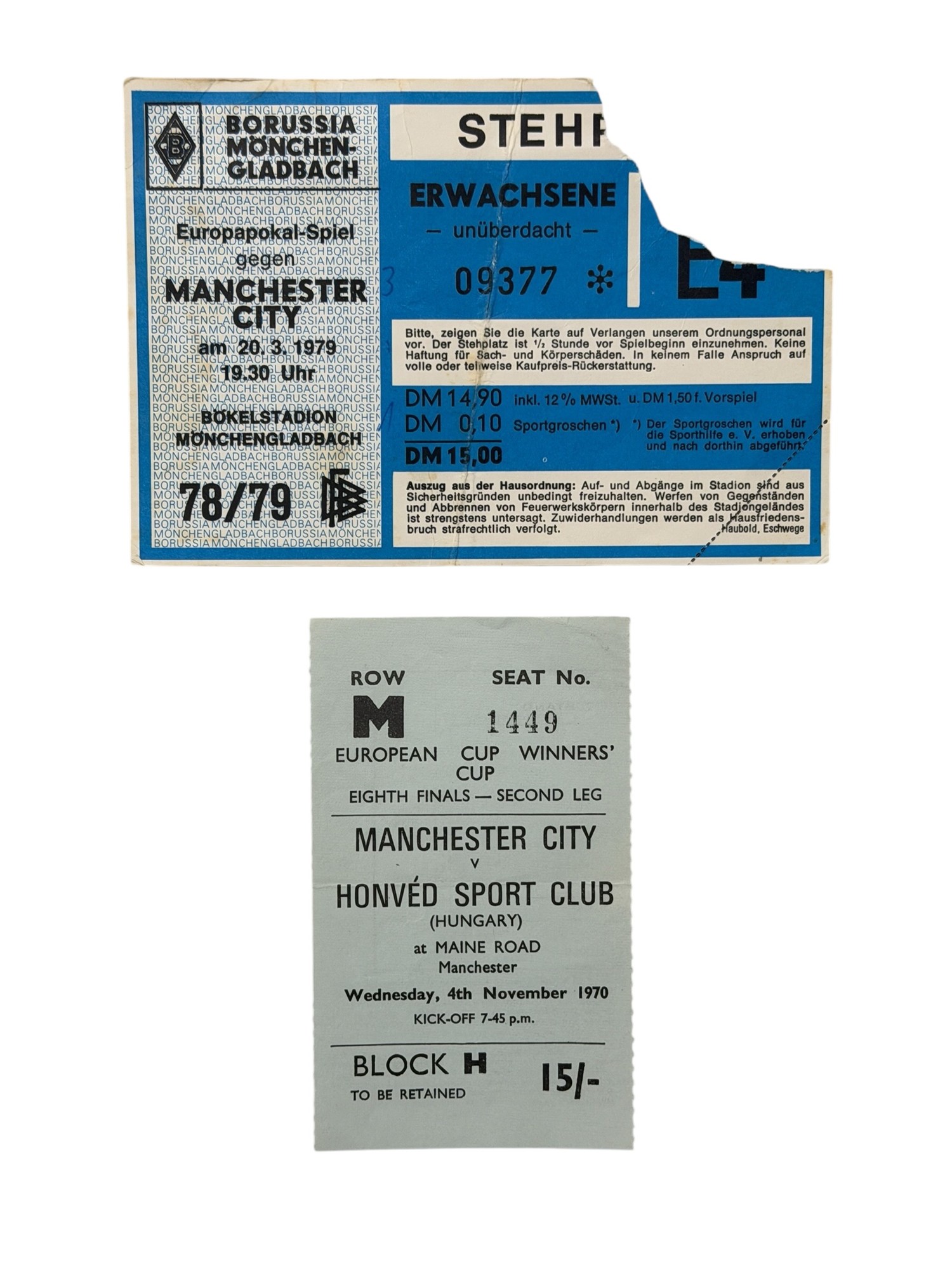 X2 MANCHESTER CITY 1970s EUROPEAN FOOTBALL TICKET STUBS, ECWC SECOND LEG VERSUS HONVED 4/11/1970, MONCHENGLADBACH AWAY 20/3/1979 (TEAR).